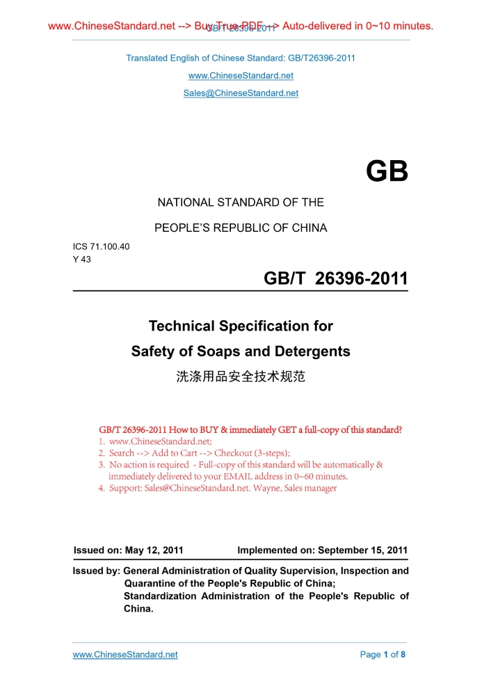 GB/T 26396-2011: Technical specification for safety of soaps and detergents Delivery: 9 seconds. True-PDF full-copy in English & invoice will be downloaded + auto-delivered via email. See step-by-step procedure Status: Valid