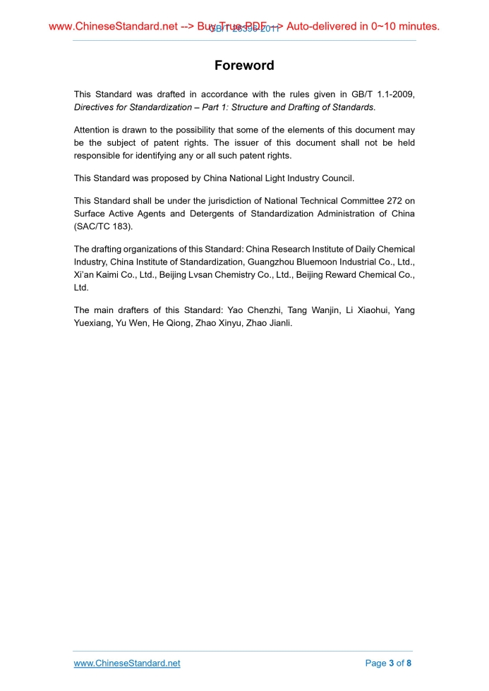 Similar standardsGB/T 26396-2011: Technical specification for safety of soaps and detergents---This is an excerpt. Full copy of true-PDF in English version (including equations, symbols, images, flow-chart, tables, and figures etc.), auto-downloaded/delivered in 9 seconds, can be purchased online: https://www.ChineseStandard.net/PDF.aspx/GBT26396-2011GB NATIONAL STANDARD OF THE PEOPLE’S REPUBLIC OF CHINA ICS 71.100.40 Y 43 Technical Specification for Safety of Soaps and Detergents Issued on. MAY 12, 2011 Implemented on. SEPTEMBER 15, 2011 Issued by. General Administration of Quality Supervision, Inspection and Quarantine of the People's Republic of China; Standardization Administration of the People's Republic of China. Table of ContentsForeword... 3 1 Application Scope... 4 2 Normative References... 4 3 Terms and Definitions... 5 4 Product Classification... 5 5 Requirements... 6 6 Test Methods... 8 7 Inspection Rules... 8ForewordThis Standard was drafted in accordance with the rules given in GB/T 1.1-2009, Directives for Standardization – Part 1.Structure and Drafting of Standards. Attention is drawn to the possibility that some of the elements of this document may be the subject of patent rights. The issuer of this document shall not be held responsible for identifying any or all such patent rights. This Standard was proposed by China National Light Industry Council. This Standard shall be under the jurisdiction of National Technical Committee 272 on Surface Active Agents and Detergents of Standardization Administration of China (SAC/TC 183). The drafting organizations of this Standard. China Research Institute of Daily Chemical Industry, China Institute of Standardization, Guangzhou Bluemoon Industrial Co., Ltd., Xi’an Kaimi Co., Ltd., Beijing Lvsan Chemistry Co., Ltd., Beijing Reward Chemical Co., Ltd. The main drafters of this Standard. Yao Chenzhi, Tang Wanjin, Li Xiaohui, Yang Yuexiang, Yu Wen, He Qiong, Zhao Xinyu, Zhao Jianli. Technical Specification for Safety of Soaps and Detergents1 Application ScopeThis Standard specifies the terms and definitions, product classification, requirements, test methods and inspection rules of soaps and detergents. This Standard applies to soaps and detergents produced, distributed and used within the territory of the People’s Republic of China, including detergents for food, food tools and equipment, detergents for personal cleaning and detergents for other purposes. This Standard does not apply to the dry cleaning agents containing organic solvents as the main components, nor some industrial detergents for special purposes.2 Normative ReferencesThe following referenced documents are indispensable for the application of this document. For dated references, only the edition dated applies to this document. For undated references, the latest edition of the referenced documents (including all amendments) applies to this Standard. GB 9985, Detergents for Hand Dishwashing GB 14930.1, Hygienic Standard for Detergent for Food Tools and Installations GB/T 15818, Test Method for Biodegradability of Surfactants GB/T 21801, Testing of Chemicals – Ready Biodegradability – Manometric Respirometry Test GB/T 21802, Testing of Chemicals – Ready Biodegradability – Modified MITI Test (I) GB/T 21827, Chemicals – Test Method of Skin Sensitization – Local Lymph Node Assay (LLNA) GB/T 21831, Testing of Chemicals – Ready Biodegradability - Closed Bottle Test3 Terms and DefinitionsFor the purposes of this document, the following terms and definitions apply. 3.1 soaps and detergents Products containing soaps and/or surface active agents for the effect of washing and cleaning. 3.2 primary biodegradation The structure of chemical compounds changes under the effects of microorganism, resulting in the loss of some characteristics. 3.3 ultimate biodegradation Under the conditions of oxygen existence, chemical compounds or organic matters are degraded by microorganism into CO2, H2O and elemental form mineral salts and assimilated to be a part of microorganism.4 Product ClassificationThey may be classified into three categories in accordance with the use objects. Category A. detergents for food, food tools and equipment, including dish washing detergents and fruit and vegetable detergents.5 Requirements5.1 Basic requirements Under the normal, reasonable and foreseeable use conditions, soaps and detergetns shall not cause hazards to human health and safety production of animals and vegetables. 5.2 Material requirements 5.2.1 General The use of raw materials (including packaging materials) in soaps and detergents shall be as provided in relevant national laws, regulations and standards. 5.2.2 Surface active agents 5.2.2.1 Biodegradability The surface active agents used in soaps and detergents shall be the chemicals which have been proved degradable and do not cause hazards to animals, vegetables and the environment by themselves and their degradation products. The specific requirements are as follows. 5.2.2.2 Hazardous substances The residual substances in the end products due to the unavoidable factors in technology, materials and others in the manufacturing process of surface active agents shall be below the acceptable safety level. 5.2.3 Preservatives The preservatives for products of category A shall be as specified in GB 9985. The preservatives for products of category B shall be the substances listed in Table 4 of Hygienic Standard for Cosmetics [2007] and as specified in Table 4. 5.2.4 Colouring agents The colouring agents for products of category A shall be as specified in GB 14930.1. The colouring agents for products of category B shall be the substances listed in Table 6 of Hygienic Standard for Cosmetics [2007] and as specified in Table 6. 5.3 Product requirements 5.3.1 Products of category A The hygienic indexes of products of category A shall be as specified in GB 14930.1. 5.3.2 Products of category B The hygienic indexes of products of category