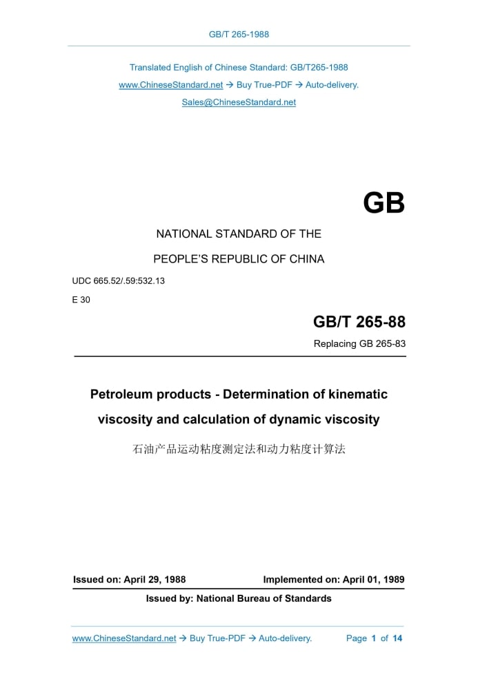 GB NATIONAL STANDARD OF THE PEOPLE’S REPUBLIC OF CHINA UDC 665.52/.59.532.13 E 30 GB/T 265-88 Replacing GB 265-83 Petroleum products - Determination of kinematic viscosity and calculation of dynamic viscosity Issued on: APRIL 29, 1988 Implemented on: APRIL 01, 1989 Issued by. National Bureau of Standards