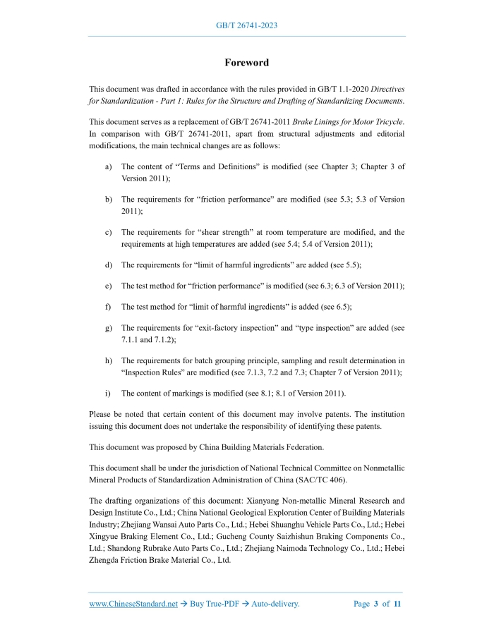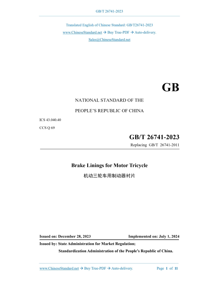 Similar standardsGB/T 26741-2023: Brake linings for motor tricycle---This is an excerpt. Full copy of true-PDF in English version (including equations, symbols, images, flow-chart, tables, and figures etc.), auto-downloaded/delivered in 9 seconds, can be purchased online: https://www.ChineseStandard.net/PDF.aspx/GBT26741-2023GB NATIONAL STANDARD OF THE PEOPLE’S REPUBLIC OF CHINA ICS 43.040.40 CCS Q 69 Replacing GB/T 26741-2011 Brake Linings for Motor Tricycle ISSUED ON: DECEMBER 28, 2023 IMPLEMENTED ON: JULY 1, 2024 Issued by: State Administration for Market Regulation; Standardization Administration of the People’s Republic of China. Table of ContentsForeword ... 3 1 Scope ... 5 2 Normative References ... 5 3 Terms and Definitions ... 5 4 Classification ... 6 5 Requirements ... 6 6 Test Methods ... 8 7 Inspection Rules ... 9 8 Markings, Packaging, Transportation and Storage ... 11ForewordThis document was drafted in accordance with the rules provided in GB/T 1.1-2020 Directives for Standardization - Part 1: Rules for the Structure and Drafting of Standardizing Documents. This document serves as a replacement of GB/T 26741-2011 Brake Linings for Motor Tricycle. In comparison with GB/T 26741-2011, apart from structural adjustments and editorial modifications, the main technical changes are as follows: a) The content of “Terms and Definitions” is modified (see Chapter 3; Chapter 3 of Version 2011); b) The requirements for “friction performance” are modified (see 5.3; 5.3 of Version 2011); c) The requirements for “shear strength” at room temperature are modified, and the requirements at high temperatures are added (see 5.4; 5.4 of Version 2011); d) The requirements for “limit of harmful ingredients” are added (see 5.5); e) The test method for “friction performance” is modified (see 6.3; 6.3 of Version 2011); f) The test method for “limit of harmful ingredients” is added (see 6.5); g) The requirements for “exit-factory inspection” and “type inspection” are added (see 7.1.1 and 7.1.2); h) The requirements for batch grouping principle, sampling and result determination in “Inspection Rules” are modified (see 7.1.3, 7.2 and 7.3; Chapter 7 of Version 2011); i) The content of markings is modified (see 8.1; 8.1 of Version 2011). Please be noted that certain content of this document may involve patents. The institution issuing this document does not undertake the responsibility of identifying these patents. This document was proposed by China Building Materials Federation. This document shall be under the jurisdiction of National Technical Committee on Nonmetallic Mineral Products of Standardization Administration of China (SAC/TC 406). The drafting organizations of this document: Xianyang Non-metallic Mineral Research and Design Institute Co., Ltd.; China National Geological Exploration Center of Building Materials Industry; Zhejiang Wansai Auto Parts Co., Ltd.; Hebei Shuanghu Vehicle Parts Co., Ltd.; Hebei Xingyue Braking Element Co., Ltd.; Gucheng County Saizhishun Braking Components Co., Ltd.; Shandong Rubrake Auto Parts Co., Ltd.; Zhejiang Naimoda Technology Co., Ltd.; Hebei Zhengda Friction Brake Material Co., Ltd. Brake Linings for Motor Tricycle1 ScopeThis document specifies the classification, requirements, test methods, inspection rules, markings, packaging, transportation and storage of brake linings for motor tricycle. This document is applicable to brake linings for motor tricycle (hereinafter referred to as “the linings”).2 Normative ReferencesThe contents of the following documents constitute indispensable clauses of this document through the normative references in the text. In terms of references with a specified date, only versions with a specified date are applicable to this document. In terms of references without a specified date, the latest version (including all the modifications) is applicable to this document. GB/T 2828.1 Sampling Procedures for Inspection by Attribute - Part 1: Sampling Schemes Indexed by Acceptance Quality Limit (AQL) for Lot-by-lot Inspection GB/T 5620 Road Vehicles - Vocabulary and Definition for Braking of Automotive Vehicles and Their Trailers GB 5763 Brake Linings for Automobiles GB/T 17469 Characteristics Evaluation of Brake Linings for Automobile - Small Sample Bench Test Method GB/T 22309 Road Vehicles - Brake Linings - Shear Test Method for Disc Brake Pad and Drum Brake Shoe Assemblies GB/T 23263 Determination of Asbestos in Products GB/T 34007-2017 Road Vehicles - Brake Lining Friction Materials - Drag Test Method for Friction Performance JC/T 2268 Measurement of Copper and Other Elements in Brake Friction Materials QC/T 944 Test Method for Poly-brominated Biphenyls (PBBs) and Poly-brominated Diphenyl Ethers (PBDEs) in Automobile Materials3 Terms and DefinitionsThe terms and definitions defined in GB/T 5620 and GB 5763 are applicable to this document. 5.3 Friction Performance 5.3.1 The small sample bench test results of Category-1 linings shall comply with the following requirements: ---Room-temperature friction coefficient room-temperature is not lower than 0.25, and complies with the indicated level; ---High-temperature friction coefficient high-temperature is not lower than 0.25, and complies with the indicated level; ---The friction coefficient at any point in the second recession 93 C ~ 288 C temperature section and the second recovery 149 C ~ 93 C temperature section of five tests is not lower than 0.15, and the difference between the friction coefficient value at each temperature point and the average value of the five tests does not exceed 20%. 5.3.2 The friction performance drag test results of Category-2 linings shall comply with the following requirements: ---The working friction coefficient working is within the range of 15% the set friction coefficient value; ---After the test, there is no delamination or falling-off of the linings. 5.4 Shear Strength The shear strength of bonded linings a