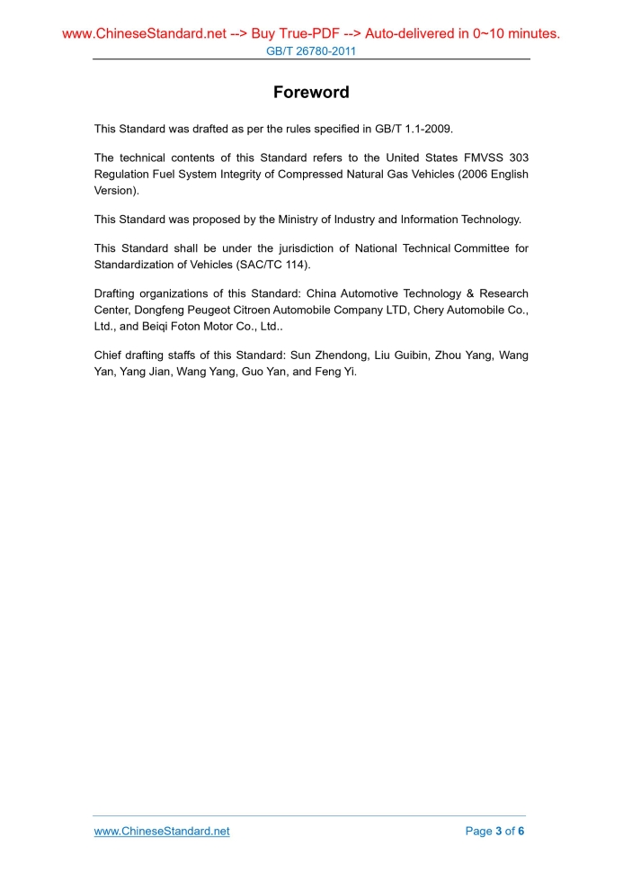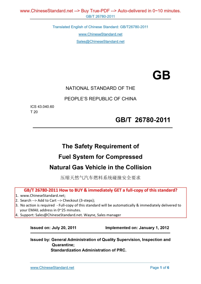 Similar standardsGB/T 26780-2011: The safety requirement of fuel system for compressed natural gas vehicle in the collision---This is an excerpt. Full copy of true-PDF in English version (including equations, symbols, images, flow-chart, tables, and figures etc.), auto-downloaded/delivered in 9 seconds, can be purchased online: https://www.ChineseStandard.net/PDF.aspx/GBT26780-2011 GB NATIONAL STANDARD OF THE PEOPLE’S REPUBLIC OF CHINA ICS 43.040.60 T 20 The Safety Requirement of Fuel System for Compressed Natural Gas Vehicle in the Collision Issued on. JULY 20, 2011 Implemented on. JANUARY 1, 2012 Issued by. General Administration of Quality Supervision, Inspection and Quarantine; Standardization Administration of PRC. Table of ContentsForeword... 3 1 Scope... 4 2 Normative References... 4 3 Terms and Definitions... 4 4 Technical Requirements... 5 5 Test Methods... 5ForewordThis Standard was drafted as per the rules specified in GB/T 1.1-2009. The technical contents of this Standard refers to the United States FMVSS 303 Regulation Fuel System Integrity of Compressed Natural Gas Vehicles (2006 English Version). This Standard was proposed by the Ministry of Industry and Information Technology. This Standard shall be under the jurisdiction of National Technical Committee for Standardization of Vehicles (SAC/TC 114). Drafting organizations of this Standard. China Automotive Technology & Research Center, Dongfeng Peugeot Citroen Automobile Company LTD, Chery Automobile Co., Ltd., and Beiqi Foton Motor Co., Ltd.. Chief drafting staffs of this Standard. Sun Zhendong, Liu Guibin, Zhou Yang, Wang Yan, Yang Jian, Wang Yang, Guo Yan, and Feng Yi. The Safety Requirement of Fuel System for Compressed Natural Gas Vehicle in the Collision1 ScopeThis Standard specifies the safety requirement and test methods of the fuel system for compressed natural gas vehicle in the collision. This Standard is applicable to the M1 vehicles with fuel system adopting compressed natural gas, which include bi-fuel CNG vehicle and dedicated CNG vehicle; other related types of vehicles can also refer to this Standard for implementation.2 Normative ReferencesThe following documents are essential to the application of this document. For the dated documents, only the versions with the dates indicated are applicable to this document; for the undated documents, only the latest version (including all the amendments) are applicable to this document. GB 11551 The Protection of the Occupants in the event of a Frontal Collision for Passenger Vehicle GB/T 17895 Natural Gas Vehicle and Liquefied Petroleum Gas Vehicle – Vocabulary3 Terms and DefinitionsThe following terms and definitions and those ones stipulated in GB/T 17895 are applicable to this document. 3.1 Bi-fuel CNG vehicle The vehicle with two mutually-independently fuel supply systems, thereof one set of system supplies compressed natural gas, while the other set of system supplies the fuel beyond the compressed natural gas; these two sets of fuel supply systems can respectively rather than jointly supply fuels to the motor.4 Technical RequirementsRespectively completer the rear-end collision test, frontal collision test, lateral collision test specified in 5.2, 5.3, 5.4; the CNG fuel system after each collision test shall meet the following requirements.5 Test Methods5.1 Preparation before test 5.1.1 Select and Reserve an appropriate location on the high-pressure piping system of the test vehicle to install an inlet horn, where a three-way connector shall be mounted; the two ends of the three-way connector shall be installed pressure sensor and cut-off valve for gas inlet and outlet, and the third end shall be connected with high-pressure piping system. 5.2 Rear-end collision test The test forms and methods shall be performed as per the relevant provisions of GB 20072; while after the test, it shall conform to the provisions of Chapter 4. 5.3 Frontal collision test The test forms and methods shall be performed as per the relevant provisions of GB 11551; while after the test, it shall conform to the provisions of Chapter 4. 5.4 Lateral collision test The test forms and methods shall be performed as per the relevant provisions of GB 20071; while after the test, it shall conform to the provisions of Chapter 4. 5.5 Sealability test of CNG fuel system After the completion of collision test, connect the pressure gauge with working pressure range of 1.5 times with pressure sensor end on the three-way connector; ......Source: Above contents are excerpted from the full-copy PDF -- translated/reviewed by: www.ChineseStandard.net / Wayne Zheng et al. Tips & Frequently Asked Questions:Question 1: How long will the true-PDF of English version of GB/T 26780-2011 be delivered?Answer: The full copy PDF of English version of GB/T 26780-2011 can be downloaded in 9 seconds, and it will also be emailed to you in 9 seconds (double mechanisms to ensure the delivery reliably), with PDF-invoice.Question 2: Can I share the purchased PDF of GB/T 26780-2011_English with my colleagues?Answer: Yes. The purchased PDF of GB/T 26780-2011_English will be deemed to be sold to your employer/organization who actually paid for it, including your colleagues and your employer's intranet.Question 3: Does the price include tax/VAT?Answer: Yes. Our tax invoice, downloaded/delivered in 9 seconds, includes all tax/VAT and complies with 100+ countries' tax regulations (tax exempted in 100+ countries) -- See Avoidance of Double Taxation Agreements (DTAs): List of DTAs signed between Singapore and 100+ countriesQuestion 4: Do you accept my currency other than USD?Answer: Yes. www.ChineseStandard.us -- GB/T 26780-2011 -- Click this link and select your country/currency to pay, the exact amount in your currency will be printed on the invoice. Full PDF will also be downloaded/emailed in 9 seconds.How to buy and download a true PDF of English version of GB/T 26780-2011?A step-by-step guide to download PDF of GB/T 26780-