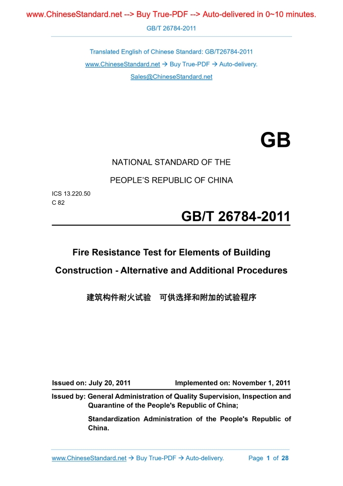 GB/T 26784-2011: Fire resistance test for elements of building construction -- Alternative and additional procedures Delivery: 9 seconds. True-PDF full-copy in English & invoice will be downloaded + auto-delivered via email. See step-by-step procedure Status: Valid
