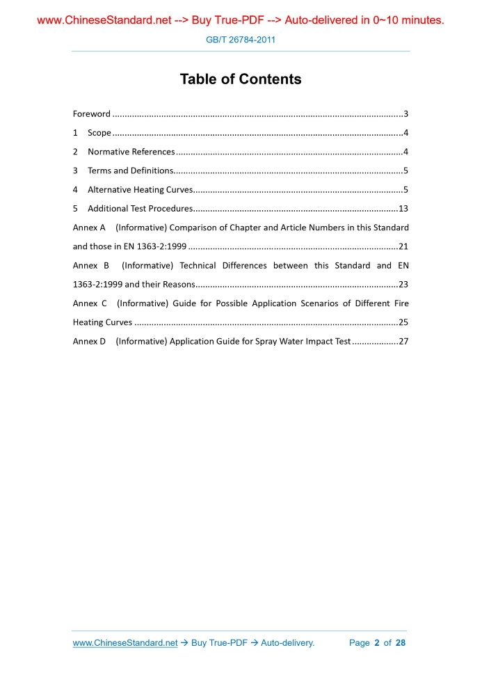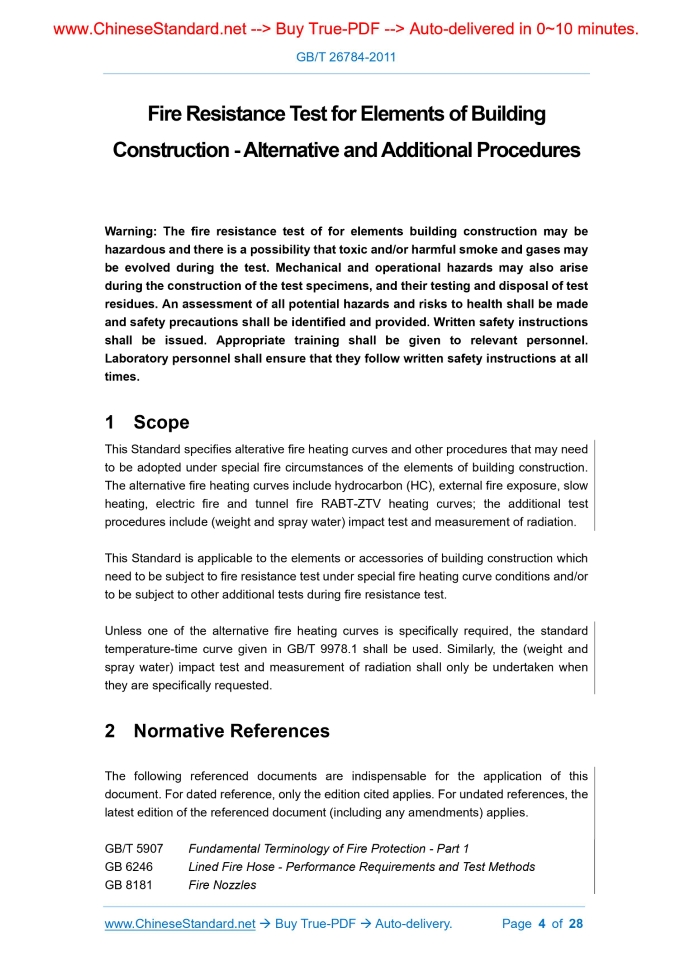 Similar standardsGB/T 26784-2011: Fire resistance test for elements of building construction -- Alternative and additional procedures---This is an excerpt. Full copy of true-PDF in English version (including equations, symbols, images, flow-chart, tables, and figures etc.), auto-downloaded/delivered in 9 seconds, can be purchased online: https://www.ChineseStandard.net/PDF.aspx/GBT26784-2011 GB NATIONAL STANDARD OF THE PEOPLE’S REPUBLIC OF CHINA ICS 13.220.50 C 82 Fire Resistance Test for Elements of Building Construction - Alternative and Additional Procedures Issued on. JULY 20, 2011 Implemented on. NOVEMBER 1, 2011 Issued by. General Administration of Quality Supervision, Inspection and Quarantine of the People's Republic of China; Standardization Administration of the People's Republic of China. Table of ContentsForeword... 3 1 Scope... 4 2 Normative References... 4 3 Terms and Definitions... 5 4 Alternative Heating Curves... 5 5 Additional Test Procedures... 13 Annex A (Informative) Comparison of Chapter and Article Numbers in this Standard and those in EN 1363‐2.1999... 21 Annex B (Informative) Technical Differences between this Standard and EN 1363‐2.1999 and their Reasons... 23 Annex C (Informative) Guide for Possible Application Scenarios of Different Fire Heating Curves... 25 Annex D (Informative) Application Guide for Spray Water Impact Test... 27ForewordThis Standard is developed in accordance with the rules given in GB/T 1.1-2009. This Standard refers to the technical content of EN 1363-2.1999 Fire Resistance Tests - Part 2.Alternative and Additional Procedures (English edition). This Standard is changed largely from EN 1363-2.1999 in terms of structure. See Annex A for the comparison of chapter and article numbers in this Standard and those in EN 1363-2.1999. There are technical differences between this Standard and EN 1363-2.1999.The differences are marked by perpendicular single line (|) in the outer side page margin of corresponding clauses. See Annex B for the list of corresponding technical differences and their reasons. This Standard was proposed by the Ministry of Public Security of the People's Republic of China. This Standard shall be under the jurisdiction of Subcommittee on Fire Endurance of Building Elements of National Technical Committee on Fire Protection of Standardization Administration of China (SAC/TC 113/SC 8). Fire Resistance Test for Elements of Building Construction - Alternative and Additional Procedures Warning. The fire resistance test of for elements building construction may be hazardous and there is a possibility that toxic and/or harmful smoke and gases may be evolved during the test. Mechanical and operational hazards may also arise during the construction of the test specimens, and their testing and disposal of test residues. An assessment of all potential hazards and risks to health shall be made and safety precautions shall be identified and provided. Written safety instructions shall be issued. Appropriate training shall be given to relevant personnel. Laboratory personnel shall ensure that they follow written safety instructions at all times.1 ScopeThis Standard specifies alterative fire heating curves and other procedures that may need to be adopted under special fire circumstances of the elements of building construction. The alternative fire heating curves include hydrocarbon (HC), external fire exposure, slow heating, electric fire and tunnel fire RABT-ZTV heating curves; the additional test procedures include (weight and spray water) impact test and measurement of radiation. This Standard is applicable to the elements or accessories of building construction which need to be subject to fire resistance test under special fire heating curve conditions and/or to be subject to other additional tests during fire resistance test. Unless one of the alternative fire heating curves is specifically required, the standard temperature-time curve given in GB/T 9978.1 shall be used. Similarly, the (weight and spray water) impact test and measurement of radiation shall only be undertaken when they are specifically requested.2 Normative ReferencesThe following referenced documents are indispensable for the application of this document. For dated reference, only the edition cited applies. For undated references, the latest edition of the referenced document (including any amendments) applies. GB/T 5907 Fundamental Terminology of Fire Protection - Part 1 GB 6246 Lined Fire Hose - Performance Requirements and Test Methods GB 8181 Fire Nozzles GB/T 9978.1 Fire-resistance Tests - Elements of Building Construction - Part 1.General Requirements (GB/T 9978.1-2008, ISO 834-1.1999, MOD) GB/T 9978.4 Fire-resistance Tests - Elements of Building Construction - Part 4.Specific Requirements for Loadbearing Vertical Separating Elements (GB/T 9978.4-2008, ISO 834-4.2000, MOD)3 Terms and DefinitionsFor the purposes of this document, the terms and definitions given in GB/T 5907 and GB/T 9978.1 and the following apply. 3.1 heat flux the quantity of heat energy per unit area incident on the target of the measuring device. It includes heat transferred by convection as well as that due to radiation4 Alternative Heating Curves4.1 Hydrocarbon (HC) heating curve 4.1.1 General In assessment on the fire resistance of the elements of building construction under fire conditions of liquid hydrocarbon, hydrocarbon (HC) heating curve specified in 4.1.2 may be adopted to carry out fire resistance test. 4.1.3 Tolerances for furnace temperature During the fire resistance test according to standard temperature-time curve of hydrocarbon (HC) fire, the percentage deviation (de) in the area of the curve of the average temperature measured and recorded by the thermocouples in fire-resistance test furnace versus time from the area of the temperature-time curve specified in standard shall be represented by Formula (2), and the value of de shall be controlled within. 4.3 Slow heating cur