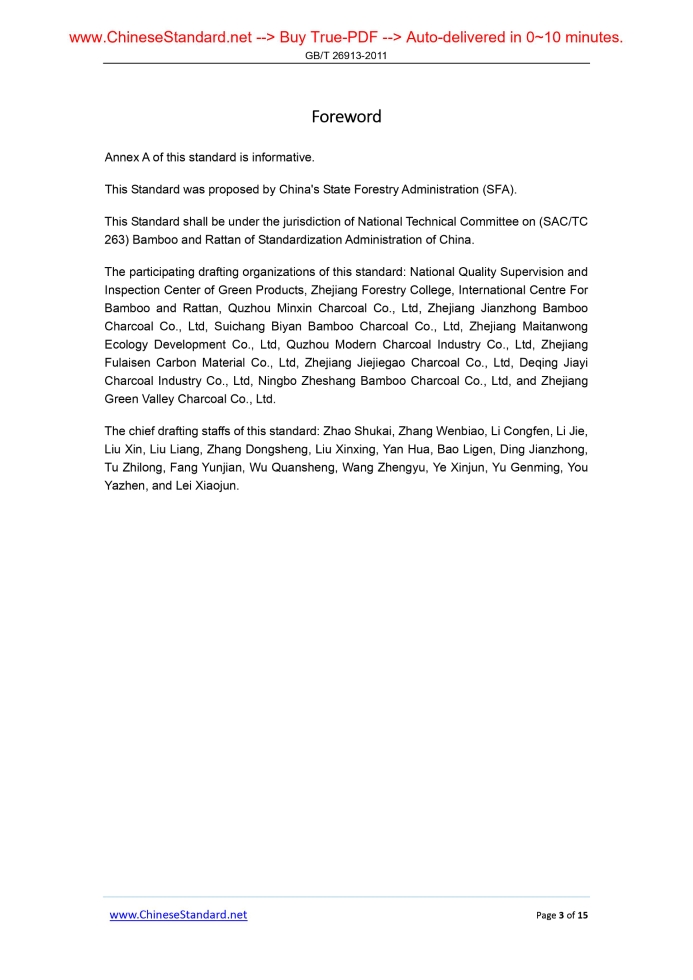 Similar standardsGB/T 26913-2011: Bamboo charcoal---This is an excerpt. Full copy of true-PDF in English version (including equations, symbols, images, flow-chart, tables, and figures etc.), auto-downloaded/delivered in 9 seconds, can be purchased online: https://www.ChineseStandard.net/PDF.aspx/GBT26913-2011GB ICS 65.020 B 73 NATIONAL STANDARD OF THE PEOPLE’S REPUBLIC OF CHINA Bamboo charcoal Issued on. SEPTEMBER 29, 2011 Implemented on. DECEMBER 1, 2011 Issued by. General Administration of Quality Supervision, Inspection and Quarantine of the People’s Republic of China; Standardization Administration of the People’s Republic of China Table of ContentsForeword... 3 1 Scope... 4 2 Normative references... 4 3 Terms and definitions... 4 4 Classification and mark... 5 5 Technical requirements... 6 6 Test Methods... 7 7 Inspection rules... 12 8 Logo, Label, Package and Storage... 13 Annex A... 15ForewordAnnex A of this standard is informative. This Standard was proposed by China's State Forestry Administration (SFA). This Standard shall be under the jurisdiction of National Technical Committee on (SAC/TC 263) Bamboo and Rattan of Standardization Administration of China. The participating drafting organizations of this standard. National Quality Supervision and Inspection Center of Green Products, Zhejiang Forestry College, International Centre For Bamboo and Rattan, Quzhou Minxin Charcoal Co., Ltd, Zhejiang Jianzhong Bamboo Charcoal Co., Ltd, Suichang Biyan Bamboo Charcoal Co., Ltd, Zhejiang Maitanwong Ecology Development Co., Ltd, Quzhou Modern Charcoal Industry Co., Ltd, Zhejiang Fulaisen Carbon Material Co., Ltd, Zhejiang Jiejiegao Charcoal Co., Ltd, Deqing Jiayi Charcoal Industry Co., Ltd, Ningbo Zheshang Bamboo Charcoal Co., Ltd, and Zhejiang Green Valley Charcoal Co., Ltd. The chief drafting staffs of this standard. Zhao Shukai, Zhang Wenbiao, Li Congfen, Li Jie, Liu Xin, Liu Liang, Zhang Dongsheng, Liu Xinxing, Yan Hua, Bao Ligen, Ding Jianzhong, Tu Zhilong, Fang Yunjian, Wu Quansheng, Wang Zhengyu, Ye Xinjun, Yu Genming, You Yazhen, and Lei Xiaojun. Bamboo charcoal1 ScopeThis Standard specifies the terms and definitions, classification and mark, technical requirements, test methods, inspection rules, logo, label and package of bamboo charcoal. This Standard shall be applicable to bamboo charcoal made of bamboo through the pyrolysis method.2 Normative referencesThe articles contained in the following documents have become part of this Standard when they are quoted herein. For the dated documents so quoted, all the modifications (excluding corrections) or revisions made thereafter shall not be applicable to this Standard. For the undated documents so quoted, the latest editions shall be applicable to this Standard. JJF 1070 Rules of Metrological Testing for Net Quantity of Products in Prepackages with Fixed Content3 Terms and definitionsFor the purpose of this standard, the following terms and definitions shall apply. 3.1 Bamboo charcoal Under the conditions of high temperature and limited oxygen (or isolated oxygen), the bamboo is heated through pyrolysis, so as to obtain the black solid. 3.2 Tube charcoal The tubular bamboo charcoal. 3.3 Flake charcoal The bamboo charcoal in bamboo-flake shape. 3.4 Broken charcoal After bamboo is gone through pyrolysis, the irregular-shape bamboo charcoal that is not processed.4 Classification and mark4.1 Classification 4.1.1 According to shape and size According to different shapes and sizes, bamboo charcoal is divided into tube charcoal, flake charcoal, broken charcoal, particle charcoal, and powder charcoal. Specifications of particle charcoal are shown in Table 1. 4.2 Mark Bamboo charcoals are marked by the difference of shape and size. Specific methods are shown in Table 2.5 Technical requirements5.1 Sense Black, odorless. 5.2 Deviation of net content Deviation of net content shall conform to Decree No.75 Measures for Metrological Supervision of Quantitatively Packed Commodities issued by General Administration of Quality Supervision, Inspection and Quarantine of the People’s Republic of China.6 Test Methods6.1 Sense PLACE bamboo charcoal sample on a piece of white paper. Under a bright environment, DETERMINE it by visual and smell methods. For tube charcoal and flake charcoal, 6.2 Net Content Executed according to the provisions of JJF 1070. 6.3 Determination of moisture content 6.3.1 Method summary Test sample with certain mass is dried to constant weight at (105±5)°C. TAKE the percentage OF mass-reduction amount TO the original test sample’s mass as the moisture content. 6.3.2 Instruments 6.3.4 Result calculation Determination results of the moisture content of bamboo charcoal are calculated according to formula (1). 6.4 Determination of ash content 6.4.1 Method summary At (800±20)°C, test sample with a certain mass is burned to constant weight (WEIGH after cooling). The percentage OF residue mass TO the original test sample’s mass is the ash content. 6.4.2 Instruments 6.4.3 Operating methods PUT the porcelain crucible into the high temperature electric furnace. BURN to constant weight at (800±20)°C. PLACE the crucible in a dryer for cooling to the room temperature (about 30min). WEIGH it (accurate to 0.1mg). 6.4.4 Result calculation Determination results of the ash content of bamboo charcoal are calculated according to formula (2). 6.5 Determination of volatile matter content 6.5.1 Method summary At the temperature of (850±20)°C, test sample with certain mass is heated for 7min with isolation from the air. The percentage OF lost mass TO the original test sample’s mass is the volatile matter content. 6.5.2 Instruments 6.5.3 Operating methods WEIGH 1g (accurate to 0.1mg) of test sample that has been crushed and gone through 0.315mm (55-mesh) sieve. PLACE in the porcelain crucible that has been burned to constant weight at (850±20)°C. 6.5.4 Result calculation Determination results of the ash content of bamboo charcoal ar