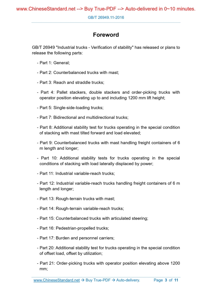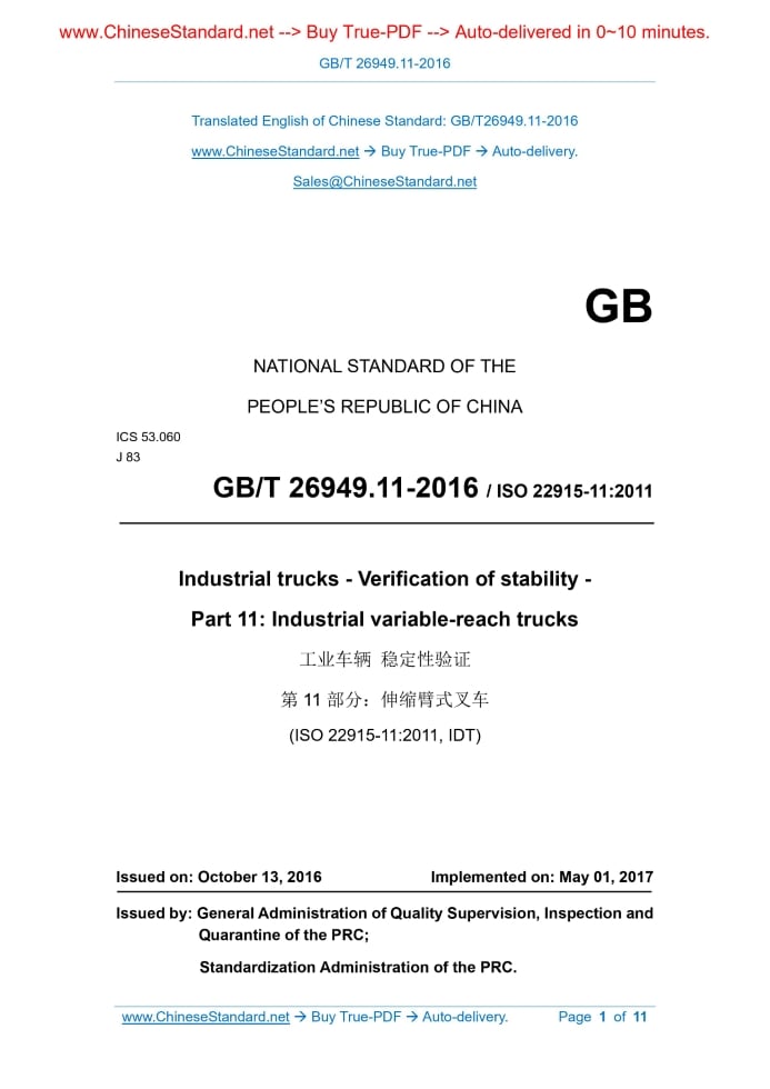 GB/T 26949.11-2016: Industrial trucks -- Verification of stability -- Part 11: Industrial variable-reach trucks Delivery: 9 seconds. True-PDF full-copy in English & invoice will be downloaded + auto-delivered via email. See step-by-step procedure Status: Valid