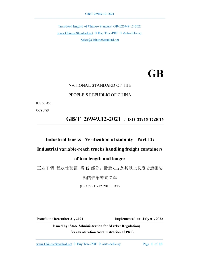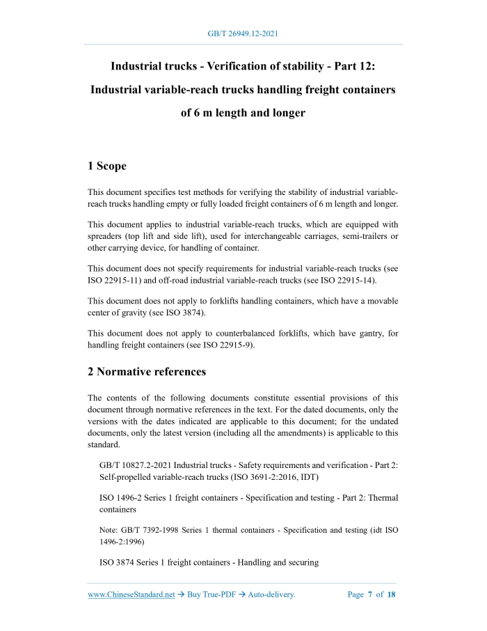 Similar standardsGB/T 26949.12-2021: Industrial trucks - Verification of stability - Part 12: Industrial variable-reach trucks handling freight containers of 6 m length and longer---This is an excerpt. Full copy of true-PDF in English version (including equations, symbols, images, flow-chart, tables, and figures etc.), auto-downloaded/delivered in 9 seconds, can be purchased online: https://www.ChineseStandard.net/PDF.aspx/GBT26949.12-2021 GB NATIONAL STANDARD OF THE PEOPLE’S REPUBLIC OF CHINA ICS 53.030 CCS J 83 GB/T 26949.12-2021 / ISO 22915-12:2015 Industrial trucks - Verification of stability - Part 12: Industrial variable-reach trucks handling freight containers of 6 m length and longer (ISO 22915-12:2015, IDT) ISSUED ON: DECEMBER 31, 2021 IMPLEMENTED ON: JULY 01, 2022 Issued by: State Administration for Market Regulation; Standardization Administration of PRC. Table of ContentsForeword ... 3 Introduction ... 5 1 Scope ... 7 2 Normative references ... 7 3 Terms and definitions ... 8 4 Operating conditions ... 9 5 Test conditions ... 9 6 Verification of stability ... 14 7 Markings ... 14 References ... 18 Industrial trucks - Verification of stability - Part 12: Industrial variable-reach trucks handling freight containers of 6 m length and longer1 ScopeThis document specifies test methods for verifying the stability of industrial variable- reach trucks handling empty or fully loaded freight containers of 6 m length and longer. This document applies to industrial variable-reach trucks, which are equipped with spreaders (top lift and side lift), used for interchangeable carriages, semi-trailers or other carrying device, for handling of container. This document does not specify requirements for industrial variable-reach trucks (see ISO 22915-11) and off-road industrial variable-reach trucks (see ISO 22915-14). This document does not apply to forklifts handling containers, which have a movable center of gravity (see ISO 3874). This document does not apply to counterbalanced forklifts, which have gantry, for handling freight containers (see ISO 22915-9).2 Normative referencesThe contents of the following documents constitute essential provisions of this document through normative references in the text. For the dated documents, only the versions with the dates indicated are applicable to this document; for the undated documents, only the latest version (including all the amendments) is applicable to this standard. GB/T 10827.2-2021 Industrial trucks - Safety requirements and verification - Part 2: Self-propelled variable-reach trucks (ISO 3691-2:2016, IDT) ISO 1496-2 Series 1 freight containers - Specification and testing - Part 2: Thermal containers Note: GB/T 7392-1998 Series 1 thermal containers - Specification and testing (idt ISO 1496-2:1996) ISO 3874 Series 1 freight containers - Handling and securing Note: GB/T 17382-2008 Series 1 freight containers - Handling and securing (ISO 3874:1997, IDT) ISO 5353 Earth-moving machinery, and tractors and machinery for agriculture and forestry - Seat index point Note: GB/T 6236-2008 Tractors and machinery for agricultural and forestry - Seat index point (ISO 5353:1995, MOD) ISO 22915-1 Industrial trucks - Verification of stability - Part 1: General Note: GB/T 26949.1-2020 Industrial trucks - Verification of stability - Part 1: General (ISO 22915-1:2016, IDT) ISO 22915-10 Industrial trucks - Verification of stability - Part 10: Additional stability tests for trucks operating in the special conditions of stacking with load laterally displaced by powered devices Note: GB/T 26949.10-2011 Industrial trucks - Verification of stability - Part 10: Additional stability tests for trucks operating in the special conditions of stacking with load laterally displaced by power (ISO 22915-10:2008, IDT) ISO 22915-20 Industrial trucks - Verification of stability - Part 20: Additional stability test for trucks operating in the special condition of offset load, offset by utilization Note: GB/T 26949.20-2016 Industrial trucks - Verification of stability - Part 20: Additional stability test for trucks operating in the special condition of offset load, offset by utilization (ISO 22915-20:2008, IDT)3 Terms and definitionsThe terms and definitions, which are defined in ISO 22915-1, as well as the following terms and definitions, apply to this document. 3.1 Industrial variable-reach truck for handling freight containers A counterbalanced forklift, which is equipped with a telescopic or non-telescopic, non-slewing articulated arm, as defined in 4.13.2.2.2 of ISO 5053:1987, AND specially used for handling freight containers of 6 m length and longer. Note 1: The handling device is directly installed on the lifting mechanism; the lifting mechanism cannot be slewed OR the slewing angle on either side of the longitudinal axis of the vehicle is not greater than 5°. Note 2: The industrial variable-reach truck for handling freight containers is expected to be used on a firm, flat, level and paved site. Note 3: According to the definition in GB/T 10827.2-2021, the industrial variable-reach truck for handling freight container can be equipped with stabilizers, axle locking devices or frame lateral leveling devices.4 Operating conditions4.1 General In addition to the conditions specified in ISO 22915-1, it shall also meet the following conditions: - Operate the forklift in a wind speed not exceeding 12.2 m/s (freight containers run and stack at normal operating height). 4.2 Partial lifting of containers Before running, lift the container, so that the bottom of the container is not higher than 900 mm, above the seat index point (SIP) as defined in ISO 5353; meanwhile, the boom is fully retracted. Note: A lifted container allows an operator, who is at lower position on the vehicle, to see the bottom of the container.5 Test conditions5.1 General See ISO 22915-1. During the test, it shall consider the eccentric load of the container, which is specified in ISO 3874. When handling an e