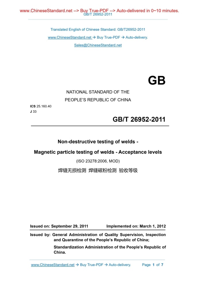GB/T 26952-2011: Non-destructive testing of welds -- Magnetic particle testing of welds -- Acceptance levels Delivery: 9 seconds. True-PDF full-copy in English & invoice will be downloaded + auto-delivered via email. See step-by-step procedure Status: Valid