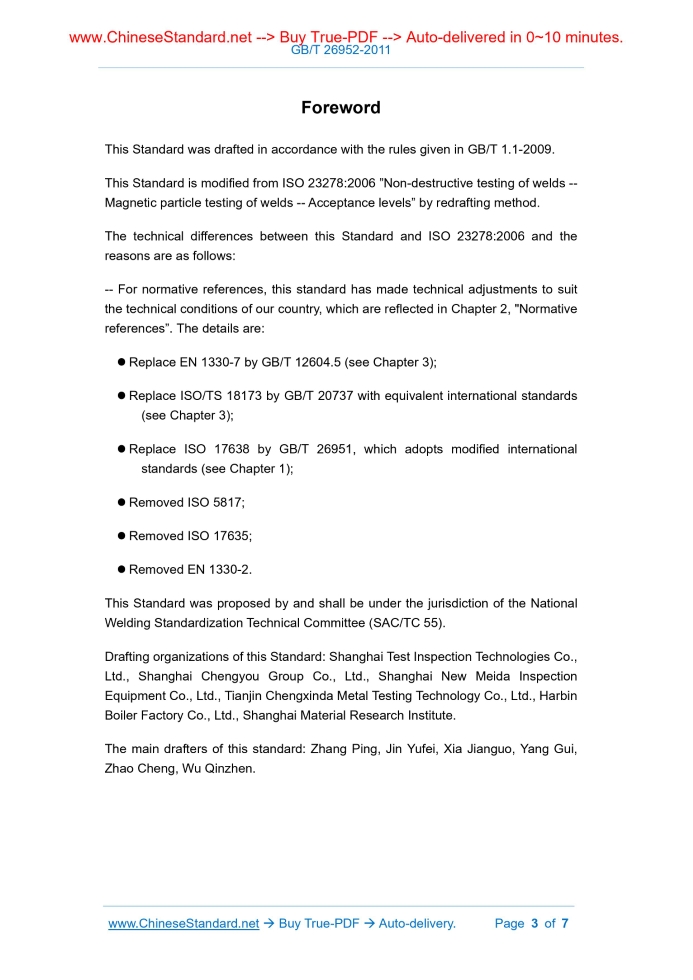 Similar standardsGB/T 26952-2011: Non-destructive testing of welds -- Magnetic particle testing of welds -- Acceptance levels---This is an excerpt. Full copy of true-PDF in English version (including equations, symbols, images, flow-chart, tables, and figures etc.), auto-downloaded/delivered in 9 seconds, can be purchased online: https://www.ChineseStandard.net/PDF.aspx/GBT26952-2011 GB NATIONAL STANDARD OF THE PEOPLE’S REPUBLIC OF CHINA ICS 25.160.40 J 33 Non-destructive testing of welds - Magnetic particle testing of welds - Acceptance levels (ISO 23278.2006, MOD) Issued on: SEPTEMBER 29, 2011 Implemented on: MARCH 1, 2012 Issued by. General Administration of Quality Supervision, Inspection and Quarantine of the People’s Republic of China; Standardization Administration of the People’s Republic of China. Table of ContentsForeword ... 3 1 Scope ... 4 2 Normative references ... 4 3 Terms and definitions ... 4 4 Testing parameters ... 5 5 Acceptance levels ... 5 Appendix A (Informative) Recommended testing parameters ... 7ForewordThis Standard was drafted in accordance with the rules given in GB/T 1.1-2009. This Standard is modified from ISO 23278.2006 ”Non-destructive testing of welds -- Magnetic particle testing of welds -- Acceptance levels” by redrafting method. The technical differences between this Standard and ISO 23278.2006 and the reasons are as follows. -- For normative references, this standard has made technical adjustments to suit the technical conditions of our country, which are reflected in Chapter 2, "Normative references”. The details are. Replace EN 1330-7 by GB/T 12604.5 (see Chapter 3); Replace ISO/TS 18173 by GB/T 20737 with equivalent international standards (see Chapter 3); Replace ISO 17638 by GB/T 26951, which adopts modified international standards (see Chapter 1); Removed ISO 5817; Removed ISO 17635; Removed EN 1330-2. This Standard was proposed by and shall be under the jurisdiction of the National Welding Standardization Technical Committee (SAC/TC 55). Drafting organizations of this Standard. Shanghai Test Inspection Technologies Co., Ltd., Shanghai Chengyou Group Co., Ltd., Shanghai New Meida Inspection Equipment Co., Ltd., Tianjin Chengxinda Metal Testing Technology Co., Ltd., Harbin Boiler Factory Co., Ltd., Shanghai Material Research Institute. The main drafters of this standard. Zhang Ping, Jin Yufei, Xia Jianguo, Yang Gui, Zhao Cheng, Wu Qinzhen. Non-destructive testing of welds - Magnetic particle testing of welds - Acceptance levels1 ScopeThis Standard specifies the acceptance levels of magnetic particle test indication for deficiencies in ferromagnetic steel welds. This acceptance levels are mainly used for manufacturing inspection and, if deemed appropriate, for in-service inspection. The acceptance levels in this standard is based on the test capability expected to be achieved as per the method specified in GB/T 26951 and the parameters recommended in Appendix A. Acceptance levels are related to welding standards, application criteria, technical conditions and regulations. More information about the indicated acceptance levels can be found in the product or application criteria.2 Normative referencesThe following referenced documents are indispensable for the application of this document. For dated references, only the edition cited applies. For undated references, the latest edition of the referenced document (including any amendments) applies. GB/T 12604.5 Non-destructive testing. Terminology. Terms used in magnetic particle testing GB/T 20737 Non-destructive testing. General terms and definitions (GB/T 20737-2006, ISO/TS 18173.2005, IDT) GB/T 26951 Non-destructive testing of welds. Magnetic particle testing (GB/T 26951-2011, ISO 17638.2003, MOD)3 Terms and definitionsThe terms and definitions defined in GB/T 12604.5 and GB/T 20737 and below shall apply to this document. 3.1 Linear indication ......Source: Above contents are excerpted from the full-copy PDF -- translated/reviewed by: www.ChineseStandard.net / Wayne Zheng et al. Tips & Frequently Asked Questions:Question 1: How long will the true-PDF of English version of GB/T 26952-2011 be delivered?Answer: The full copy PDF of English version of GB/T 26952-2011 can be downloaded in 9 seconds, and it will also be emailed to you in 9 seconds (double mechanisms to ensure the delivery reliably), with PDF-invoice.Question 2: Can I share the purchased PDF of GB/T 26952-2011_English with my colleagues?Answer: Yes. The purchased PDF of GB/T 26952-2011_English will be deemed to be sold to your employer/organization who actually paid for it, including your colleagues and your employer's intranet.Question 3: Does the price include tax/VAT?Answer: Yes. Our tax invoice, downloaded/delivered in 9 seconds, includes all tax/VAT and complies with 100+ countries' tax regulations (tax exempted in 100+ countries) -- See Avoidance of Double Taxation Agreements (DTAs): List of DTAs signed between Singapore and 100+ countriesQuestion 4: Do you accept my currency other than USD?Answer: Yes. www.ChineseStandard.us -- GB/T 26952-2011 -- Click this link and select your country/currency to pay, the exact amount in your currency will be printed on the invoice. Full PDF will also be downloaded/emailed in 9 seconds.How to buy and download a true PDF of English version of GB/T 26952-2011?A step-by-step guide to download PDF of GB/T 26952-2011_EnglishStep 1: Visit website https://www.ChineseStandard.net (Pay in USD), or https://www.ChineseStandard.us (Pay in any currencies such as Euro, KRW, JPY, AUD).Step 2: Search keyword "GB/T 26952-2011". Step 3: Click "Add to Cart". If multiple PDFs are required, repeat steps 2 and 3 to add up to 12 PDFs to cart. Step 4: Select payment option (Via payment agents Stripe or PayPal). Step 5: Customize Tax Invoice -- Fill up your email etc. Step 6: Click "Checkout". Step 7: Make payment by credit card, PayPal, Google Pay etc. After the payment is completed and in 9 seconds, you wi