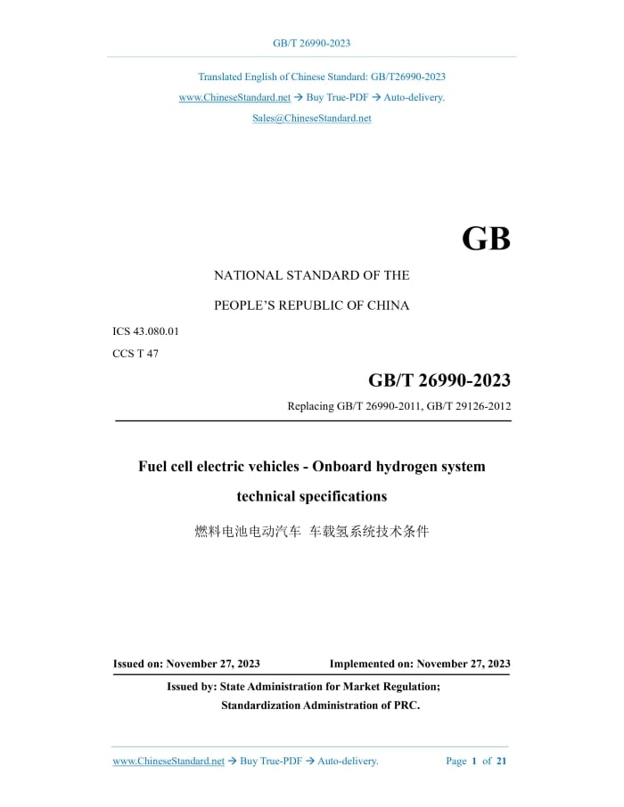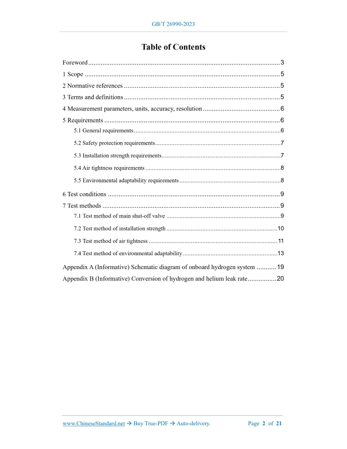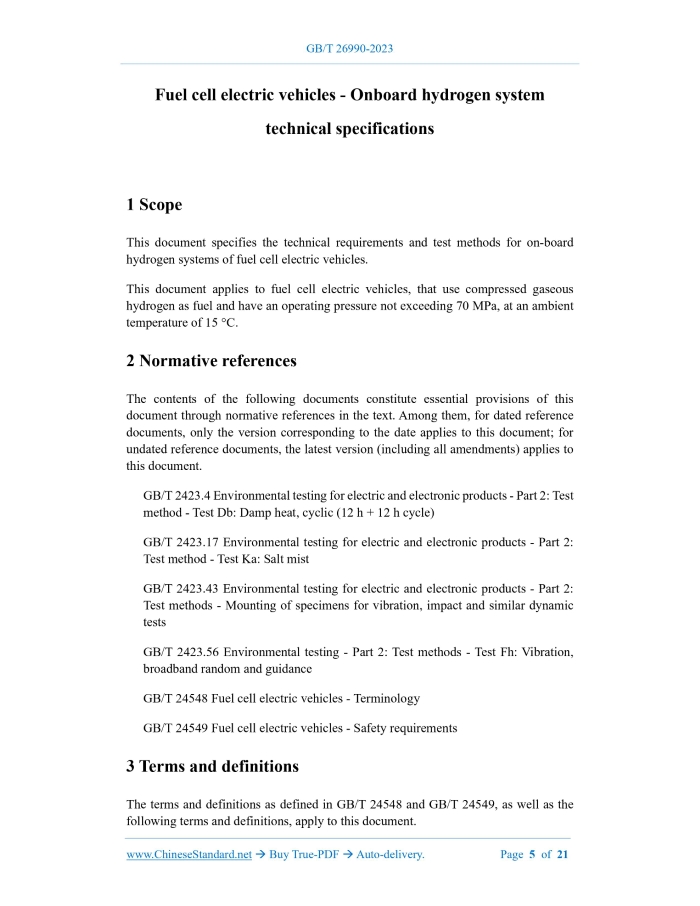 Similar standardsGB/T 26990-2023: Fuel cell electric vehicles - Onboard hydrogen system technical specifications---This is an excerpt. Full copy of true-PDF in English version (including equations, symbols, images, flow-chart, tables, and figures etc.), auto-downloaded/delivered in 9 seconds, can be purchased online: https://www.ChineseStandard.net/PDF.aspx/GBT26990-2023GB NATIONAL STANDARD OF THE PEOPLE’S REPUBLIC OF CHINA ICS 43.080.01 CCS T 47 Replacing GB/T 26990-2011, GB/T 29126-2012 Fuel cell electric vehicles - Onboard hydrogen system technical specifications Issued on. NOVEMBER 27, 2023 Implemented on. NOVEMBER 27, 2023 Issued by. State Administration for Market Regulation; Standardization Administration of PRC. Table of ContentsForeword... 3 1 Scope... 5 2 Normative references... 5 3 Terms and definitions... 5 4 Measurement parameters, units, accuracy, resolution... 6 5 Requirements... 6 5.1 General requirements... 6 5.2 Safety protection requirements... 7 5.3 Installation strength requirements... 7 5.4 Air tightness requirements... 8 5.5 Environmental adaptability requirements... 8 6 Test conditions... 9 7 Test methods... 9 7.1 Test method of main shut-off valve... 9 7.2 Test method of installation strength... 10 7.3 Test method of air tightness... 11 7.4 Test method of environmental adaptability... 13 Appendix A (Informative) Schematic diagram of onboard hydrogen system... 19 Appendix B (Informative) Conversion of hydrogen and helium leak rate... 20ForewordThis document was drafted in accordance with the provisions of GB/T 1.1-2020 "Directives for standardization - Part 1.Rules for the structure and drafting of standardizing documents". This document replaces GB/T 26990-2011 "Fuel cell electric vehicles - Onboard hydrogen system - Specifications" and GB/T 29126-2012 "Fuel cell electric vehicles - - Onboard hydrogen system - Test methods". This document is based on GB/T 26990- 2011 and integrates the contents of GB/T 29126-2012.Compared with GB/T 26990- 2011, in addition to structural adjustments and editorial changes, the main technical changes are as follows. a) CHANGE the working pressure of the on-board hydrogen system in the Scope to not exceed 70 MPa (see Chapter 1; Chapter 1 of GB/T 26990-2011); b) CHANGE the definition of on-board hydrogen system (see 3.1; 3.1 of GB/T 26990-2011); c) CHANGE the pressure regulator into a pressure regulator (see 3.4; 3.4 of GB/T 26990-2011); d) DELETE the term of pressure relief valve (see 3.5 of GB/T 26990-2011); e) ADD the measurement parameters, units, accuracy, resolution requirements (see Chapter 4); f) DELETE part of the requirements (see Chapter 4 of GB/T 26990-2011); g) ADD the test requirements for main shut-off valve (see 5.2.3; 4.1.6 of GB/T 26990-2011); h) CHANGE the installation strength requirements and its test requirements (see 5.3; 4.2.4 of GB/T 26990-2011); i) ADD the air tightness requirements and test requirements (see 5.4); j) ADD the environmental adaptability requirements and test requirements (see 5.5); k) ADD the test conditions (see Chapter 6); l) ADD the test method of main shut-off valve (see 7.1); m) ADD the test method of installation strength (see 7.2); n) ADD the test method of air tightness (see 7.3); o) ADD the test method of environmental adaptability, including high and low temperature test, damp heat test, vibration test, salt spray test (see 7.4). Please note that some content in this document may be subject to patents. The publisher of this document assumes no responsibility for identifying patents. This document was proposed by the Ministry of Industry and Information Technology of the People's Republic of China. This document shall be under the jurisdiction of the National Automotive Standardization Technical Committee (SAC/TC 114). Drafting organizations of this document. Zhejiang University, China Automotive Technology and Research Center Co., Ltd., China Automotive Research Institute New Energy Vehicle Inspection Center (Tianjin) Co., Ltd., Toyota Motor (China) Investment Co., Ltd., Shanghai Shunhua New Energy Systems Co., Ltd., Dongfeng Motor Group Co., Ltd., Beiqi Foton Motor Co., Ltd., Daimler (China) Commercial Vehicle Investment Co., Ltd., Xiamen King Long United Automotive Industry Co., Ltd., FAW Toyota Motor Co., Ltd. Technology R&D Branch, Shanghai Jenin New Energy Technology Development Co., Ltd., Baowu Clean Energy Co., Ltd. The main drafters of this document. Hua Zhengli, Lan Hao, Zheng Jinyang, Liu Guibin, He Yuntang, Hao Dong, Xu Nuo, Le Yu, Zheng Tianlei, Hao Weijian, Shi Jianpeng, Mao Zhifei, Zhang Yanyi, Liu Yongliang, Zhao Xiaoxiao, Yang Yunpeng, Ding Rui, Song Guangji, Zhang Aoteng, Gao Wei, Fan Yonggang, Xu Yixiang, Ji Haiyan. This standard replaces the standard previously issued as follows. - It was first published in 2011 as GB/T 26990-2011; - This is the first revision, which incorporates the contents of GB/T 29126-2012. Fuel cell electric vehicles - Onboard hydrogen system technical specifications1 ScopeThis document specifies the technical requirements and test methods for on-board hydrogen systems of fuel cell electric vehicles. This document applies to fuel cell electric vehicles, that use compressed gaseous hydrogen as fuel and have an operating pressure not exceeding 70 MPa, at an ambient temperature of 15 °C.2 Normative referencesThe contents of the following documents constitute essential provisions of this document through normative references in the text. Among them, for dated reference documents, only the version corresponding to the date applies to this document; for undated reference documents, the latest version (including all amendments) applies to this document. GB/T 2423.4 Environmental testing for electric and electronic products - Part 2.Test method - Test Db. Damp heat, cyclic (12 h + 12 h cycle) GB/T 2423.17 Environmental testing for electric and electronic products - Part 2. Test method - Test Ka. Salt mist GB/T 2423.43 Environmental testing for ele