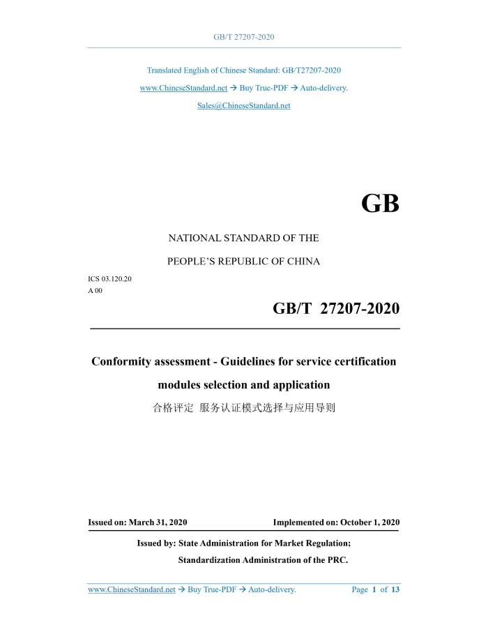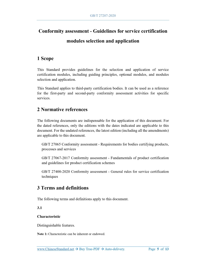 Similar standardsGB/T 27207-2020: Conformity assessment - Guidelines for service certification modules selection and application---This is an excerpt. Full copy of true-PDF in English version (including equations, symbols, images, flow-chart, tables, and figures etc.), auto-downloaded/delivered in 9 seconds, can be purchased online: https://www.ChineseStandard.net/PDF.aspx/GBT27207-2020 GB NATIONAL STANDARD OF THE PEOPLE’S REPUBLIC OF CHINA ICS 03.120.20 A 00 Conformity assessment - Guidelines for service certification modules selection and application ISSUED ON: MARCH 31, 2020 IMPLEMENTED ON: OCTOBER 1, 2020 Issued by: State Administration for Market Regulation; Standardization Administration of the PRC. Table of ContentsForeword ... 3 Introduction ... 4 1 Scope ... 5 2 Normative references ... 5 3 Terms and definitions ... 5 4 Guiding principles ... 6 5 Optional modules ... 7 6 Selection and application of the modules ... 9 6.1 General rules ... 9 6.2 Selection of the modules ... 9 6.3 Application of the modules ... 10 Bibliography ... 13 Conformity assessment - Guidelines for service certification modules selection and application1 ScopeThis Standard provides guidelines for the selection and application of service certification modules, including guiding principles, optional modules, and modules selection and application. This Standard applies to third-party certification bodies. It can be used as a reference for the first-party and second-party conformity assessment activities for specific services.2 Normative referencesThe following documents are indispensable for the application of this document. For the dated references, only the editions with the dates indicated are applicable to this document. For the undated references, the latest edition (including all the amendments) are applicable to this document. GB/T 27065 Conformity assessment - Requirements for bodies certifying products, processes and services GB/T 27067-2017 Conformity assessment - Fundamentals of product certification and guidelines for product certification schemes GB/T 27400-2020 Conformity assessment - General rules for service certification techniques3 Terms and definitionsThe following terms and definitions apply to this document. 3.1 Characteristic Distinguishable features. Note 1: Characteristic can be inherent or endowed. choosing a certification module suitable for customers [consumers, users and (or) prosumers] to participate in. 4.4 Responsiveness is the technical principle for the selection and application of service certification modules. The selected and used certification module can reflect the response to customer needs and stakeholder expectations; especially the certification modules related to service characteristic determination involving customer experience perception and measurement. 4.5 Economy is the value principle for the selection and application of service certification modules. On the premise of ensuring the principle of impartiality and controllable certification risks, it shall give priority to the selection and application of economical, convenient, and appropriate certification modules. 4.6 Measurability is the evaluation principle for the selection and application of service certification modules. Whether it is service characteristic determination or service management review, measurable certification modules should be preferred.5 Optional modules5.1 The service certification module aims to provide a technical method for the application of conformity assessment function method in the service certification process AND for the implementation of determined functions. 5.2 The service certification module consists of two parts: service characteristic determination and service management review. When establishing, selecting and applying a service certification module, the technical requirements and suitability for service characteristic determination and service management review should be considered. 5.3 The service certification modules given in this Standard are based on Table 1 "Product certification scheme type 6" of GB/T 27067-2017. These certification modules have good applicability in service certification. However, not all possible service certification modules are represented. 5.4 The service certification module shall be aimed at specific services and their service management characteristics. It shall be suitable for service characteristic determination and service management review activities. 5.5 Optional service certification modules include but are not limited to: a) Open service characteristic inspection, referred to as Module A; b) Service characteristic inspection of mystery customer (unannounced visit), referred to as Module B; c) Open service characteristic testing, referred to as Module C; d) Service characteristic testing of mystery customer (unannounced visit), referred to as Module D; e) Customer survey, referred to as Module E; f) Service footprint determination, referred to as Module F; g) Confirmation or verification of service capability, referred to as Module G; h) Service design review, referred to as module H; i) Service management review, referred to as Module I. 5.6 Service characteristic inspection and (or) testing may be collectively referred to as service characteristic determination, where: a) Service characteristic inspection, also known as service experience perception, is aimed at implementing determination based on qualitative service characteristic indicators; b) Service characteristic testing, also known as service experience measurement, is aimed at determining the quantitative indicators of related parameters such as behaviors and emotions that are formed based on service characteristic experience. Note: Service characteristic testing is based on behavioral cognitive science technology and behavioral measurement theory. It measures, analyzes and judges the physiological, psychological and other related parameter information and data of service