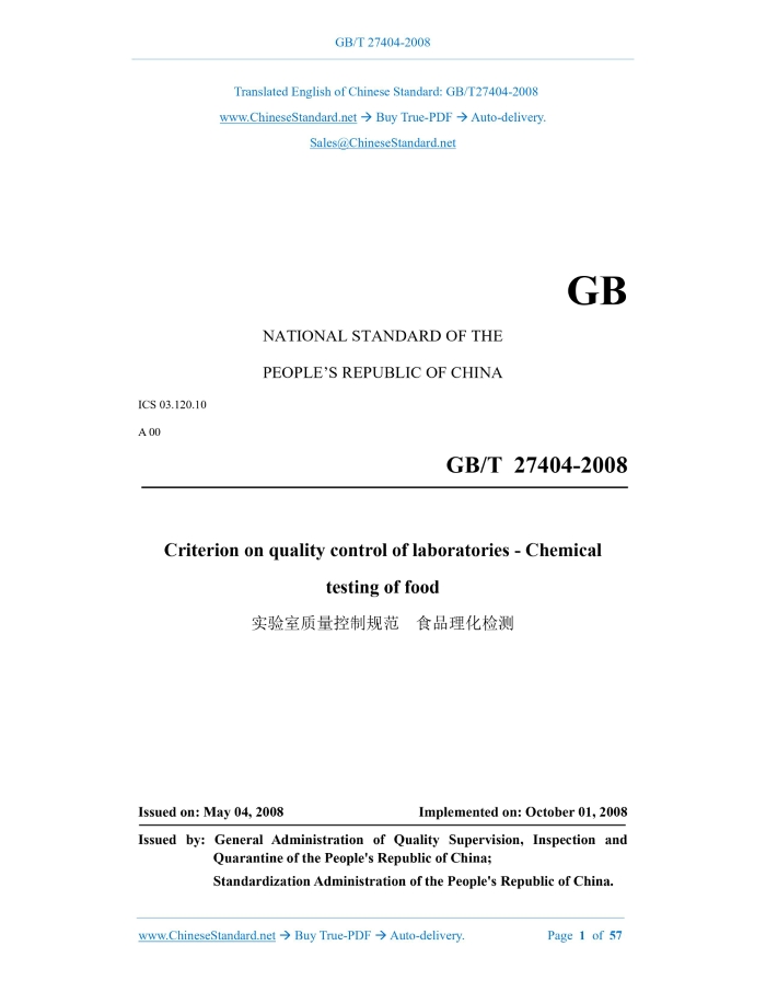 GB/T 27404-2008: Criterion on quality control of laboratories - Chemical testing of food Delivery: 9 seconds. True-PDF full-copy in English & invoice will be downloaded + auto-delivered via email. See step-by-step procedure Status: Valid