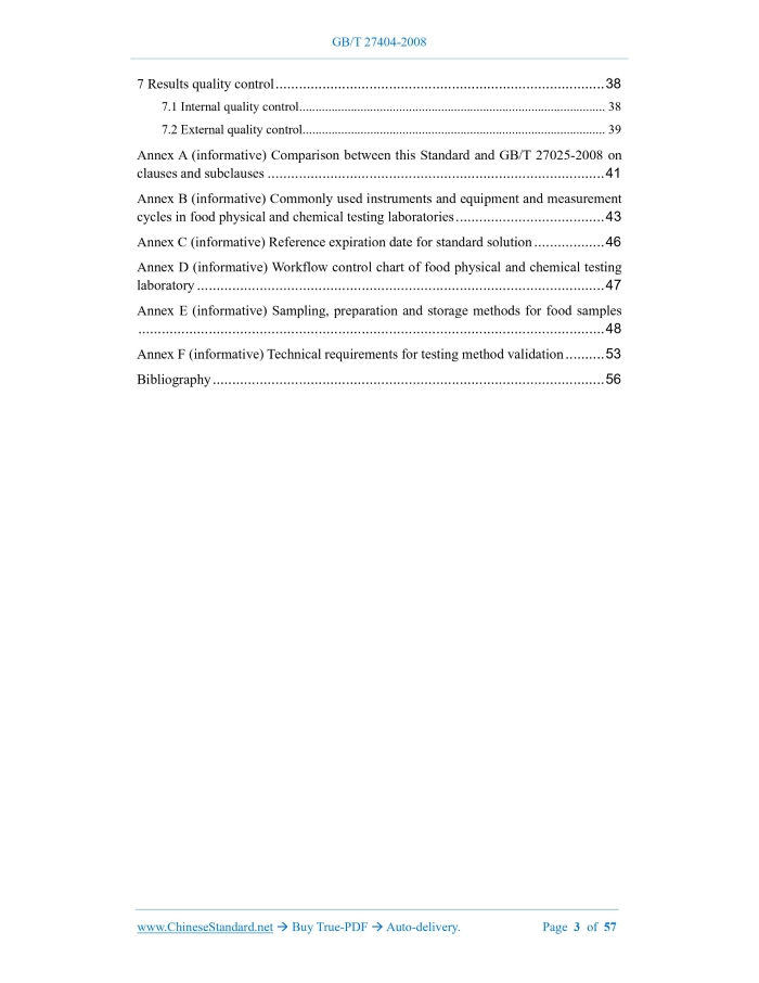 Similar standardsGB/T 27404-2008: Criterion on quality control of laboratories - Chemical testing of food---This is an excerpt. Full copy of true-PDF in English version (including equations, symbols, images, flow-chart, tables, and figures etc.), auto-downloaded/delivered in 9 seconds, can be purchased online: https://www.ChineseStandard.net/PDF.aspx/GBT27404-2008GB NATIONAL STANDARD OF THE PEOPLE’S REPUBLIC OF CHINA ICS 03.120.10 A 00 Criterion on quality control of laboratories - Chemical testing of food ISSUED ON: MAY 04, 2008 IMPLEMENTED ON: OCTOBER 01, 2008 Issued by: General Administration of Quality Supervision, Inspection and Quarantine of the People's Republic of China; Standardization Administration of the People's Republic of China. Table of ContentsForeword ... 4 Introduction ... 5 1 Scope ... 6 2 Normative references ... 6 3 Terms and definitions ... 7 4 Management requirements ... 8 4.1 Organization and management... 8 4.2 Management system ... 9 4.3 Document control ... 11 4.4 Quality and technical records ... 12 4.5 Customer service ... 13 4.6 Complaint handling ... 14 4.7 Control of non-conformance ... 14 4.8 Measures for correction ... 15 4.9 Precautions ... 15 4.10 Internal audits ... 16 4.11 Management review ... 16 4.12 Continuous improvement ... 17 5 Technical requirements ... 17 5.1 Purchasing services and supplies ... 17 5.2 Personnel ... 18 5.3 Facilities and environmental conditions ... 18 5.4 Equipment ... 21 5.5 Traceability ... 22 6 Process control requirements ... 26 6.1 General ... 26 6.2 Contract review ... 26 6.3 Sampling ... 27 6.4 Handling of samples ... 28 6.5 Method and method validation ... 29 6.6 Testing and subcontracting ... 33 6.7 Data processing and control ... 35 6.8 Results report ... 36 7 Results quality control ... 38 7.1 Internal quality control ... 38 7.2 External quality control... 39 Annex A (informative) Comparison between this Standard and GB/T 27025-2008 on clauses and subclauses ... 41 Annex B (informative) Commonly used instruments and equipment and measurement cycles in food physical and chemical testing laboratories ... 43 Annex C (informative) Reference expiration date for standard solution ... 46 Annex D (informative) Workflow control chart of food physical and chemical testing laboratory ... 47 Annex E (informative) Sampling, preparation and storage methods for food samples ... 48 Annex F (informative) Technical requirements for testing method validation ... 53 Bibliography ... 56 Criterion on quality control of laboratories - Chemical testing of food1 ScopeThis Standard specifies the management requirements, technical requirements, process control requirements and quality assurance requirements for the quality control of food physical and chemical testing laboratories. This Standard applies to the quality control of food physical and chemical testing laboratories engaged in the testing of food quality (including sensory, physical and chemical), chemical substances (including active ingredients, pesticide and veterinary drug residues, food additives, heavy metals, toxins, environmental pollutants, etc.). Chemical testing laboratories in other fields can also refer to it.2 Normative referencesThe provisions in following documents become the provisions of this Standard through reference in this Standard. For dated references, the subsequent amendments (excluding corrigendum) or revisions do not apply to this Standard, however, parties who reach an agreement based on this Standard are encouraged to study if the latest versions of these documents are applicable. For undated references, the latest edition of the referenced document applies. GB/T 1.1, Directives for standardization -- Part 1: Rules for the structure and drafting of standardizing documents (GB/T 1.1-2000, ISO/IEC Directives, Part3, 1997, NEQ) GB 8170, Rules of rounding off for numerical values and expression and judgement of limiting values GB/T 15483.1, Proficiency testing by interlaboratory comparisons -- Part 1: Development and operation of proficiency testing schemes (GB/T 15483.1-1999, idt ISO/IEC Guideline 43-1:1997) GB/T 19000, Quality management systems -- Fundamentals and vocabulary (GB/T 19000-2000, idt ISO 9000:2000) GB/T 20000.1, Guide for standardization -- Part 1: Standardization and related activities -- General vocabulary (GB/T 20000.1-2002, ISO/IEC Guide 2:1996, MOD) Laboratory quality control work associated with control analysis and subsequent necessary corrective activities.4 Management requirements4.1 Organization and management 4.1.1 The food physical and chemical testing laboratory (hereinafter referred to as the laboratory) or its organization shall be an entity capable of assuming legal responsibility. A non-independent legal entity shall have its status in the parent organization, and the above parent organization has promised not to interfere with its inspection work. 4.1.2 When the laboratory works in its fixed facilities or in other places outside the fixed facilities it is responsible for, including temporary or mobile facilities, it shall meet the relevant requirements of this Standard. 4.1.3 If the organization where the laboratory is located is also engaged in activities other than testing, in order to identify potential conflicts of interest, the responsibilities of key personnel involved in testing or having an impact on testing activities in the organization shall be defined. 4.1.4 Management personnel of laboratory shall be responsible for the planning, establishment, implementation, maintenance and improvement of the management system, including: a) Laboratory management and technical personnel shall have the necessary authority and resources to perform responsibilities including implementing, maintaining and improving the management system, identifying deviations from the management system or testing procedures, and taking measures to prevent or reduce these deviations. b) Measures are in place to ensure that laboratory managem