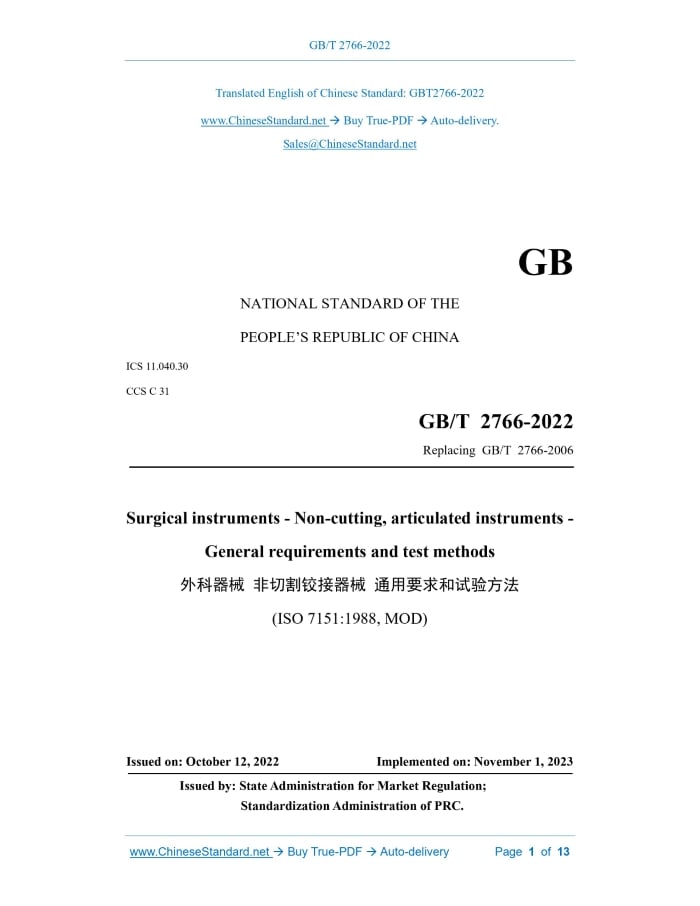 GB/T 2766-2022: Surgical instruments - Non-cutting, articulated instruments - General requirements and test methods Delivery: 9 seconds. True-PDF full-copy in English & invoice will be downloaded + auto-delivered via email. See step-by-step procedure Status: Valid GB/T 2766: Historical versions