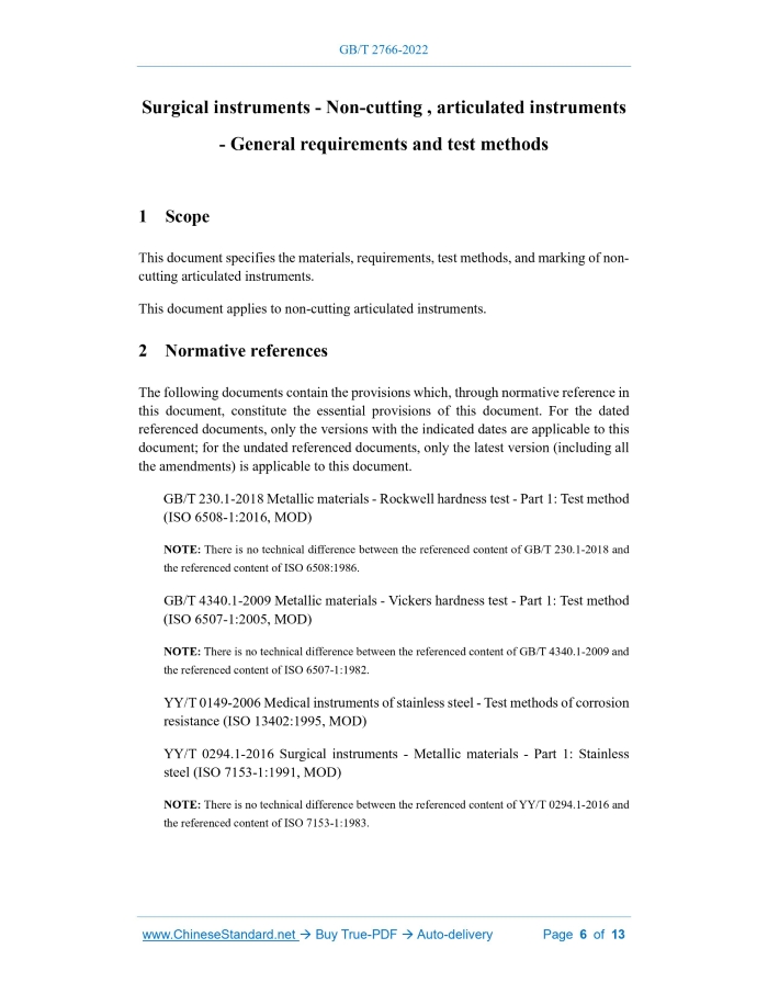 Similar standardsGB/T 2766-2022: Surgical instruments - Non-cutting, articulated instruments - General requirements and test methods---This is an excerpt. Full copy of true-PDF in English version (including equations, symbols, images, flow-chart, tables, and figures etc.), auto-downloaded/delivered in 9 seconds, can be purchased online: https://www.ChineseStandard.net/PDF.aspx/GBT2766-2022 GB NATIONAL STANDARD OF THE PEOPLE’S REPUBLIC OF CHINA ICS 11.040.30 CCS C 31 Replacing GB/T 2766-2006 Surgical instruments - Non-cutting, articulated instruments - General requirements and test methods (ISO 7151:1988, MOD) ISSUED ON: OCTOBER 12, 2022 IMPLEMENTED ON: NOVEMBER 1, 2023 Issued by: State Administration for Market Regulation; Standardization Administration of PRC. Table of ContentsForeword ... 3 1 Scope ... 6 2 Normative references ... 6 3 Terms and definitions ... 7 4 Materials ... 7 5 Requirements ... 7 6 Test methods ... 10 7 Marking ... 11 Appendix A (Informative) Structural changes of this document compared with ISO 7151:1988 ... 12 Surgical instruments - Non-cutting , articulated instruments - General requirements and test methods1 ScopeThis document specifies the materials, requirements, test methods, and marking of non- cutting articulated instruments. This document applies to non-cutting articulated instruments.2 Normative referencesThe following documents contain the provisions which, through normative reference in this document, constitute the essential provisions of this document. For the dated referenced documents, only the versions with the indicated dates are applicable to this document; for the undated referenced documents, only the latest version (including all the amendments) is applicable to this document. GB/T 230.1-2018 Metallic materials - Rockwell hardness test - Part 1: Test method (ISO 6508-1:2016, MOD) NOTE: There is no technical difference between the referenced content of GB/T 230.1-2018 and the referenced content of ISO 6508:1986. GB/T 4340.1-2009 Metallic materials - Vickers hardness test - Part 1: Test method (ISO 6507-1:2005, MOD) NOTE: There is no technical difference between the referenced content of GB/T 4340.1-2009 and the referenced content of ISO 6507-1:1982. YY/T 0149-2006 Medical instruments of stainless steel - Test methods of corrosion resistance (ISO 13402:1995, MOD) YY/T 0294.1-2016 Surgical instruments - Metallic materials - Part 1: Stainless steel (ISO 7153-1:1991, MOD) NOTE: There is no technical difference between the referenced content of YY/T 0294.1-2016 and the referenced content of ISO 7153-1:1983. The test shall be carried out according to the provisions of GB/T 230.1-2018 or GB/T 4340.1-2009. The Rockwell hardness of the finished product (except 05Cr17Ni4Cu4Nb) shall be within the range of 40HRC~48HRC or the Vickers hardness shall be within the range of 390HV~485HV. The Rockwell hardness of the finished product made of 05Cr17Ni4Cu4Nb material shall be within the range of 36HRC~44HRC or the Vickers hardness shall be within the range of 330HV~410HV. The difference between the two pieces shall not be greater than Rockwell hardness 4HRC or Vickers hardness 40HV. NOTE: The test force is determined by the manufacturer according to the product characteristics. 5.1.3 Hardness of tungsten carbide inserts The test shall be carried out according to the provisions of GB/T 4340.1-2009; the Vickers hardness of tungsten carbide inserts shall not be less than 1000HV10. The difference in hardness between the inserts of the two opposite jaws shall not exceed 50HV10. 5.2 Corrosion resistance The test shall be carried out according to the method specified in 6.1 or 6.2, and it shall not be lower than the requirements of level-b in 5.4 of YY/T 0149-2006. 5.3 Manufacturing process Instruments shall be manufactured according to appropriate process requirements. When the instruments are fully locked, the jaw teeth shall be completely matched. The teeth of the two parts of the instrument shall be clear, full, without sharp edges, and of the same shape. The teeth shall fit together and there shall be no resistance when reopening the instrument. Unless otherwise specified, there shall be no sharp edges; sharp edges shall be removed around the sides of the jaws. The joints of the instrument shall be able to move smoothly, with proper tightness; the instrument shall be able to be easily opened and closed by operating the control handle with one hand. 5.4 Surface condition 5.4.1 General rules The surface is checked with normal vision or corrected vision; there shall be no abscesses, cracks, or wear marks on the surface of the instrument. Instruments shall be free from residual scale, residual acid grease, and residues of grinding additive and polishing agent. 5.4.2 Surface finishing Surface finishing shall be one of the following situations or a combination of them: a) Mirror polishing; b) Processing to reduce reflection, such as satin polishing, matting, and blackening processing; c) Additional coating, e.g. a coated layer for insulation purposes. NOTE 1: A satin finish is usually achieved by appropriate processes such as grinding, polishing, and electropolishing followed by satin polishing (glass bead rolling or satin brushing). The smooth surface is uniform, smooth, and weak glare. NOTE 2: Instruments with a mirror finish are usually ground sufficiently to remove all surface imperfections and polished to remove grinding marks to achieve a mirror finish. A mirror finish is achieved by appropriate processes such as polishing, lapping, electropolishing, and mirror polishing. 5.4.3 Passivation and final treatment Unless the metallurgical properties of the instrument are unsuitable (for example, with brazed or soft-soldered welded seam), the instrument shall be passivated or other electrochemically treated in accordance with the properties of such stainless steel. NOTE 1: Regarding the method of passivation treatment, such as electropolishing or treatment in 10% (vol