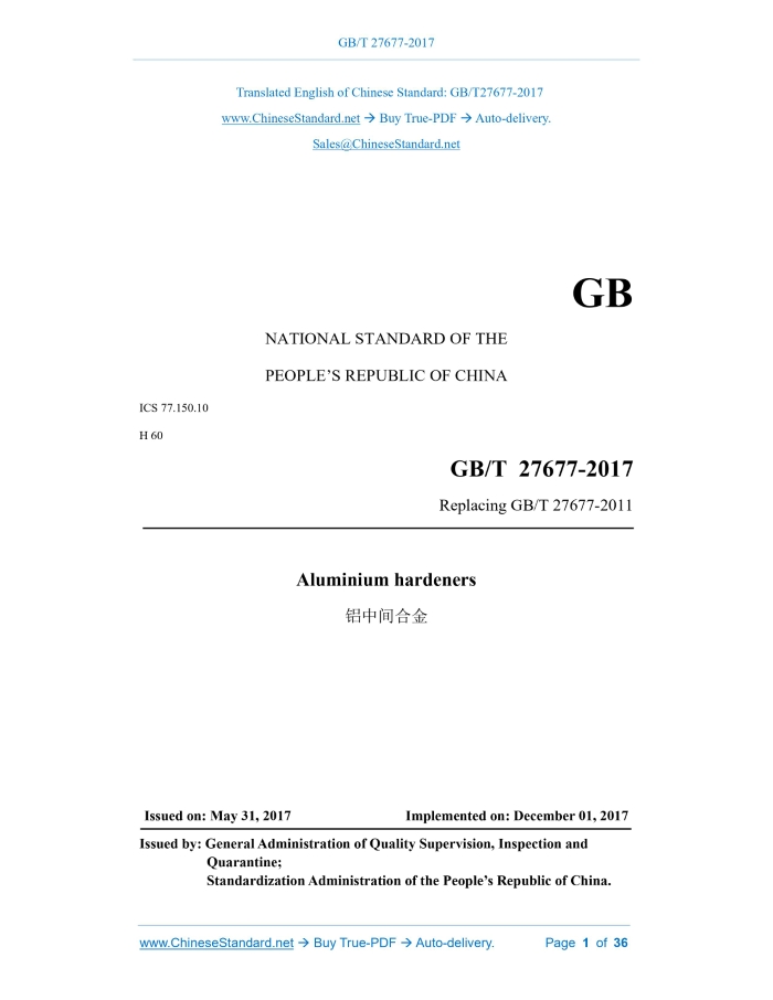 GB/T 27677-2017: Aluminium hardeners Delivery: 9 seconds. True-PDF full-copy in English & invoice will be downloaded + auto-delivered via email. See step-by-step procedure Status: Valid GB/T 27677: Historical versions