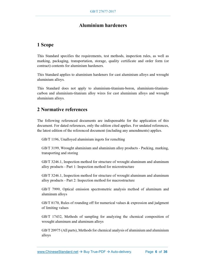 Similar standardsGB/T 27677-2017: Aluminium hardeners---This is an excerpt. Full copy of true-PDF in English version (including equations, symbols, images, flow-chart, tables, and figures etc.), auto-downloaded/delivered in 9 seconds, can be purchased online: https://www.ChineseStandard.net/PDF.aspx/GBT27677-2017GB NATIONAL STANDARD OF THE PEOPLE’S REPUBLIC OF CHINA ICS 77.150.10 H 60 Replacing GB/T 27677-2011 Aluminium hardeners Issued on. MAY 31, 2017 Implemented on. DECEMBER 01, 2017 Issued by. General Administration of Quality Supervision, Inspection and Quarantine; Standardization Administration of the People’s Republic of China. Table of ContentsForeword... 3 1 Scope... 6 2 Normative references... 6 3 Terms and definitions... 7 4 Requirements... 7 5 Test methods... 30 6 Inspection rules... 31 7 Marking, packaging, transportation and storage... 33 8 Order form (or contract) contents... 34 Appendix A (Informative) Color identification of aluminium hardeners... 351 ScopeThis Standard specifies the requirements, test methods, inspection rules, as well as marking, packaging, transportation, storage, quality certificate and order form (or contract) contents for aluminium hardeners. This Standard applies to aluminium hardeners for cast aluminium alloys and wrought aluminium alloys. This Standard does not apply to aluminium-titanium-boron, aluminium-titanium- carbon and aluminium-titanium alloy wires for cast aluminium alloys and wrought aluminium alloys.2 Normative referencesThe following referenced documents are indispensable for the application of this document. For dated references, only the edition cited applies. For undated references, the latest edition of the referenced document (including any amendments) applies. GB/T 1196, Unalloyed aluminium ingots for remelting GB/T 3199, Wrought aluminium and aluminium alloy products - Packing, marking, transporting and storing GB/T 3246.1, Inspection method for structure of wrought aluminum and aluminum alloy products - Part 1.Inspection method for microstructure GB/T 3246.1, Inspection method for structure of wrought aluminum and aluminum alloy products - Part 2.Inspection method for macrostructure3 Terms and definitionsFor the purposes of this document, the following terms and definitions apply. 3.1 aluminium hardeners An alloy made of aluminium as a matrix and melted with other metals or non-metals at elevated temperatures. It is used to adjust and control the chemical composition and structure of cast aluminium alloys or wrought aluminium alloys.4 Requirements4.1 Product classification 4.1.1 Representation method of aluminium hardener designation The designation of aluminium hardeners is composed of “Al” + the symbol of the main alloying element + the nominal mass fraction of the main alloying element. The main alloying elements are arranged in descending order by their element mass fractions. 4.1.2 Groups and designations of aluminium hardeners Aluminium hardeners are divided into 39 groups according to the first main alloying element, as shown in Table 1. 4.1.3 Product category, dimensions and piece weight The category, dimensions and piece weight of aluminium hardeners shall comply with the requirements in Table 2.If the buyer requires other dimensions or weights, it shall be determined through negotiation between the supplier and the buyer, and noted in the order form (or contract). 4.1.4 Marking and examples The marking of aluminium hardeners is expressed in the order of product category, number of this Standard, designation of the aluminium hardener, designation of the raw aluminium ingot (which can be omitted when designation Al99.70 is selected), dimensions and piece weight. Examples of marking are as follows. 4.2 Chemical composition The chemical composition of the designation of aluminium hardeners shall comply with the requirements in Table 3. 4.5 Appearance The appearance of aluminium hardeners is not allowed to contain slag inclusions, corrosion, inclusions, oil stains or any foreign matter. It is allowed to have oxide films, wrinkles or shrinkage cracks that do not affect its use.5 Test methods5.1 Chemical composition 5.1.1 The chemical composition analysis method shall comply with the provisions of GB/T 20975 (all parts) or GB/T 7999.The arbitration analysis shall adopt the method specified in GB/T 20975 (all parts). 5.1.2 The determination of analysis value is based on the rounding comparison method; the value rounding rules shall be carried out in accordance with the relevant provisions of GB/T 8170; the rounding digit shall be consistent with the limit digits specified in Table 3. 5.2 Fracture structure Fracture structure shall be inspected in accordance with the provisions of GB/T 3246.2. 5.3 Microstructure Microstructure shall be inspected in accordance with the provisions of GB/T 3246.1. 5.4 Appearance Visually inspect the appearance under natural scattered light.6 Inspection rules6.1 Inspection and acceptance 6.1.1 The aluminium hardeners shall be inspected by the supplier to ensure that the quality of the aluminium hardeners complies with the provisions of this Standard and the order form (or contract), and a quality certificate shall be filled in. 6.2 Batch Aluminium hardeners shall be submitted for inspection in batches, and each batch shall be composed of aluminium hardeners of the same melting order. 6.3 Inspection items Each batch shall be inspected for chemical composition, fracture structure and appearance. Aluminium hardeners of designations AlTi6A, AlTi6, AlTi10A, AlTi10, AlTi5B1A, AlTi5B1, AlZr5A, AlZr5, AlZr10A, AlZr10, AlZr15A, and AlZr15 shall also be inspected for microstructure. When users have requirements for the microstructure of aluminium hardeners of other designations, the required aluminium hardeners shall be inspected for microstructure on a batch basis. 6.4 Sampling The sampling of aluminium hardeners shall comply with the requirements in Table 7. 6.5 Determination of the test result 