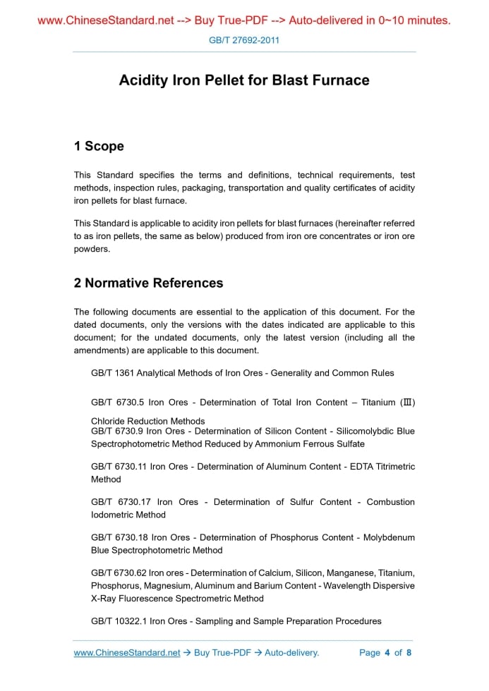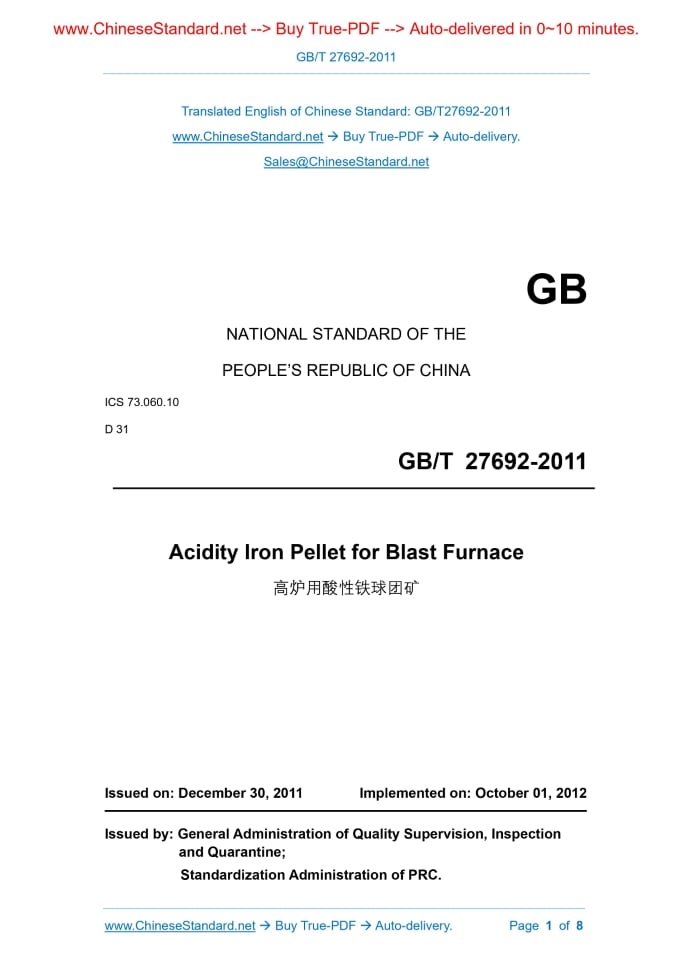 GB/T 27692-2011: Acidity iron pellet for blast furnace Delivery: 9 seconds. True-PDF full-copy in English & invoice will be downloaded + auto-delivered via email. See step-by-step procedure Status: Obsolete GB/T 27692: Historical versions