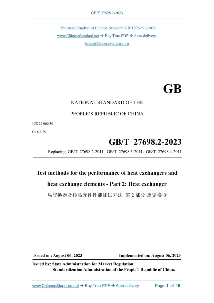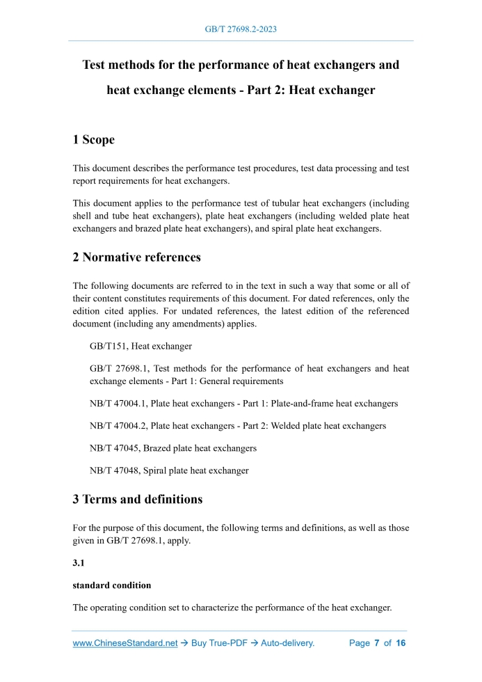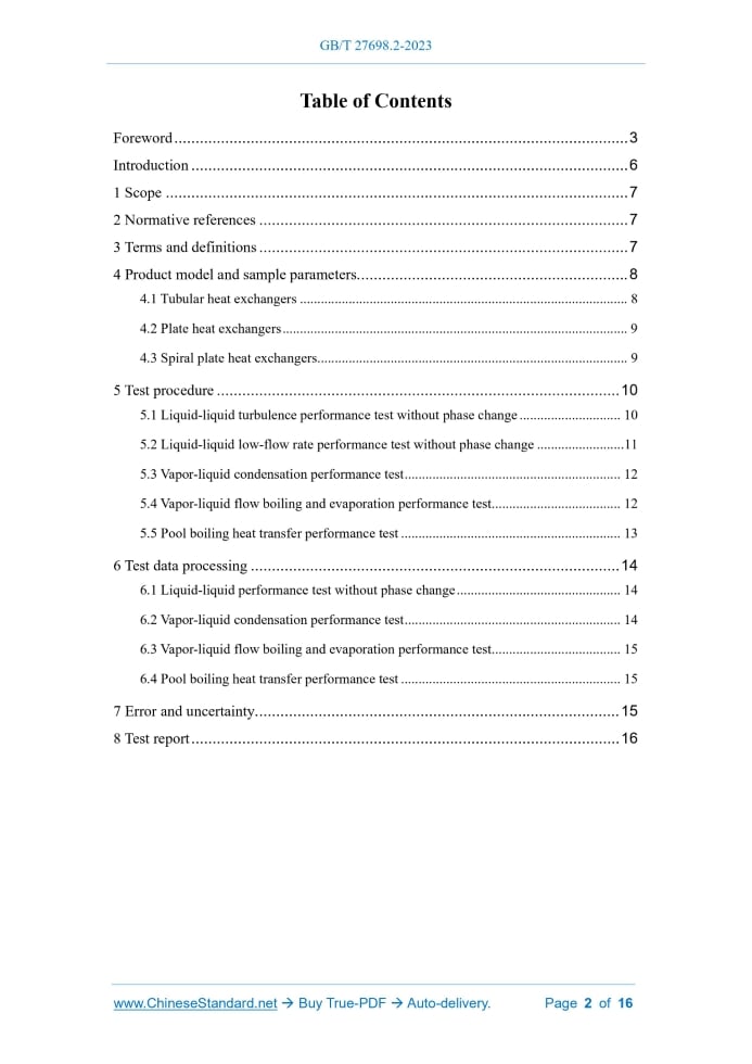 Similar standardsGB/T 27698.2-2023: Test methods for the performance of heat exchangers and heat exchange elements - Part 2: Heat exchangers---This is an excerpt. Full copy of true-PDF in English version (including equations, symbols, images, flow-chart, tables, and figures etc.), auto-downloaded/delivered in 9 seconds, can be purchased online: https://www.ChineseStandard.net/PDF.aspx/GBT27698.2-2023 GB NATIONAL STANDARD OF THE PEOPLE’S REPUBLIC OF CHINA ICS 27.060.30 CCS J 75 Replacing GB/T 27698.2-2011, GB/T 27698.3-2011, GB/T 27698.4-2011 Test methods for the performance of heat exchangers and heat exchange elements - Part 2: Heat exchanger ISSUED ON: AUGUST 06, 2023 IMPLEMENTED ON: AUGUST 06, 2023 Issued by: State Administration for Market Regulation; Standardization Administration of the People’s Republic of China. Table of ContentsForeword ... 3 Introduction ... 6 1 Scope ... 7 2 Normative references ... 7 3 Terms and definitions ... 7 4 Product model and sample parameters... 8 4.1 Tubular heat exchangers ... 8 4.2 Plate heat exchangers ... 9 4.3 Spiral plate heat exchangers ... 9 5 Test procedure ... 10 5.1 Liquid-liquid turbulence performance test without phase change ... 10 5.2 Liquid-liquid low-flow rate performance test without phase change ... 11 5.3 Vapor-liquid condensation performance test ... 12 5.4 Vapor-liquid flow boiling and evaporation performance test ... 12 5.5 Pool boiling heat transfer performance test ... 13 6 Test data processing ... 14 6.1 Liquid-liquid performance test without phase change ... 14 6.2 Vapor-liquid condensation performance test ... 14 6.3 Vapor-liquid flow boiling and evaporation performance test ... 15 6.4 Pool boiling heat transfer performance test ... 15 7 Error and uncertainty ... 15 8 Test report ... 16 Test methods for the performance of heat exchangers and heat exchange elements - Part 2: Heat exchanger1 ScopeThis document describes the performance test procedures, test data processing and test report requirements for heat exchangers. This document applies to the performance test of tubular heat exchangers (including shell and tube heat exchangers), plate heat exchangers (including welded plate heat exchangers and brazed plate heat exchangers), and spiral plate heat exchangers.2 Normative referencesThe following documents are referred to in the text in such a way that some or all of their content constitutes requirements of this document. For dated references, only the edition cited applies. For undated references, the latest edition of the referenced document (including any amendments) applies. GB/T151, Heat exchanger GB/T 27698.1, Test methods for the performance of heat exchangers and heat exchange elements - Part 1: General requirements NB/T 47004.1, Plate heat exchangers - Part 1: Plate-and-frame heat exchangers NB/T 47004.2, Plate heat exchangers - Part 2: Welded plate heat exchangers NB/T 47045, Brazed plate heat exchangers NB/T 47048, Spiral plate heat exchanger3 Terms and definitionsFor the purpose of this document, the following terms and definitions, as well as those given in GB/T 27698.1, apply. 3.1 standard condition The operating condition set to characterize the performance of the heat exchanger. 4.2 Plate heat exchangers 4.2.1 The number of plates in the plate heat exchanger sample shall be determined by considering the uniformity of fluid distribution within the measured flow rate range, and the number of plates installed shall not be less than 9. 4.2.2 When testing plate heat exchangers, the product model and the following parameters shall be clearly stated: a) Plate corrugation form (corrugation angle, corrugation depth, corrugation spacing, mixing angle); b) Plate geometric dimensions (length, width, corner hole diameter, longitudinal and transverse center distance); c) Heat transfer area of a single plate; d) Spacing between plates; e) Flow channel cross-sectional area; f) Plate thickness; g) Plate material; h) Number of plates; i) Clamping dimensions; j) Process combination; k) Design temperature; l) Design pressure. The above structure and design data shall be determined in accordance with the requirements of GB/T 27698.1 and NB/T 47004.1, NB/T 47004.2 as well as NB/T 47045. 4.2.3 When the product model or any of the parameters a) ~ e) in 4.2.2 changes, the performance test shall be repeated. 4.3 Spiral plate heat exchangers 4.3.1 When testing spiral plate heat exchanger, the product model and the following parameters shall be clearly stated: a) Layout and geometric dimensions of spacing columns; b) Spacing between plates; c) Equivalent diameter; d) Flow cross-sectional area; e) Flow channel length; f) Heat transfer plate material; g) Heat transfer plate thickness; h) Heat transfer area (based on the neutral surface of the heat transfer plate); i) Design temperature; j) Design pressure. The above structure and design data shall be determined in accordance with the requirements of GB/T 27698.1 and NB/T 47048. 4.3.2 When the product model or any of the parameters a) ~ d) in 4.3.1 changes, the performance test shall be repeated.5 Test procedure5.1 Liquid-liquid turbulence performance test without phase change 5.1.1 Before testing, the reliability of the test sample, pipeline and measuring instruments shall be checked. 5.1.2 After starting operation, the gas in the test sample shall be exhausted in time, so that the test sample can be operated under the condition of being fully filled with test fluid and adjusted to the standard condition according to Table 1. 5.1.3 After running stably for 30 minutes under standard conditions, the following test requirements should be followed: a) The fluid flow rate on both sides remains the same, the flow rate changes within the range of Table 1, and the change interval meets the requirements of Table 1; b) The fluid on one side (hot side or cold side) is fixed at the flow rate under standard conditions; the flow rate of the fluid on the other side varies within the range of Tab