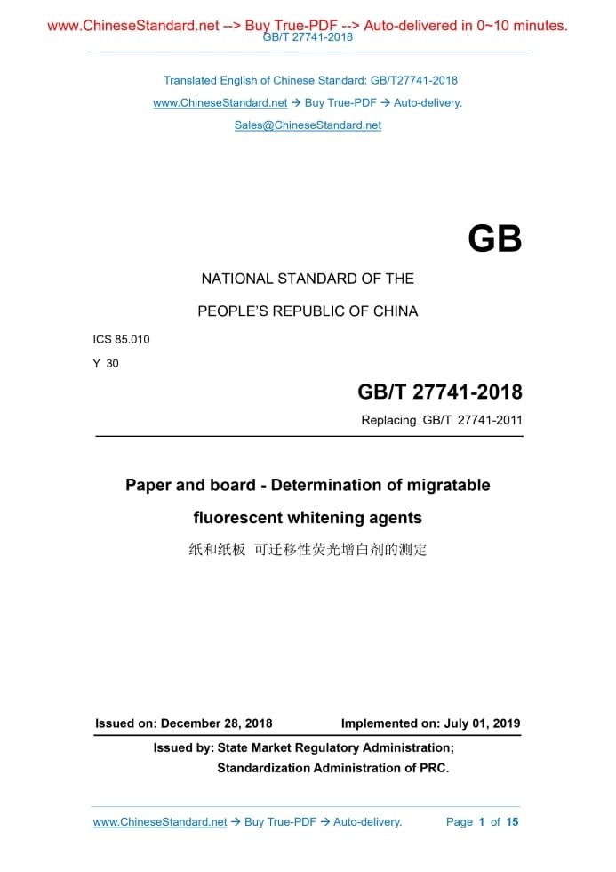 GB/T 27741-2018: Paper and board - Determination of migratable fluorescent whitening agents Delivery: 9 seconds. True-PDF full-copy in English & invoice will be downloaded + auto-delivered via email. See step-by-step procedure Status: Valid GB/T 27741: Historical versions