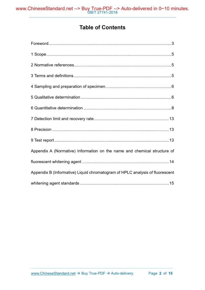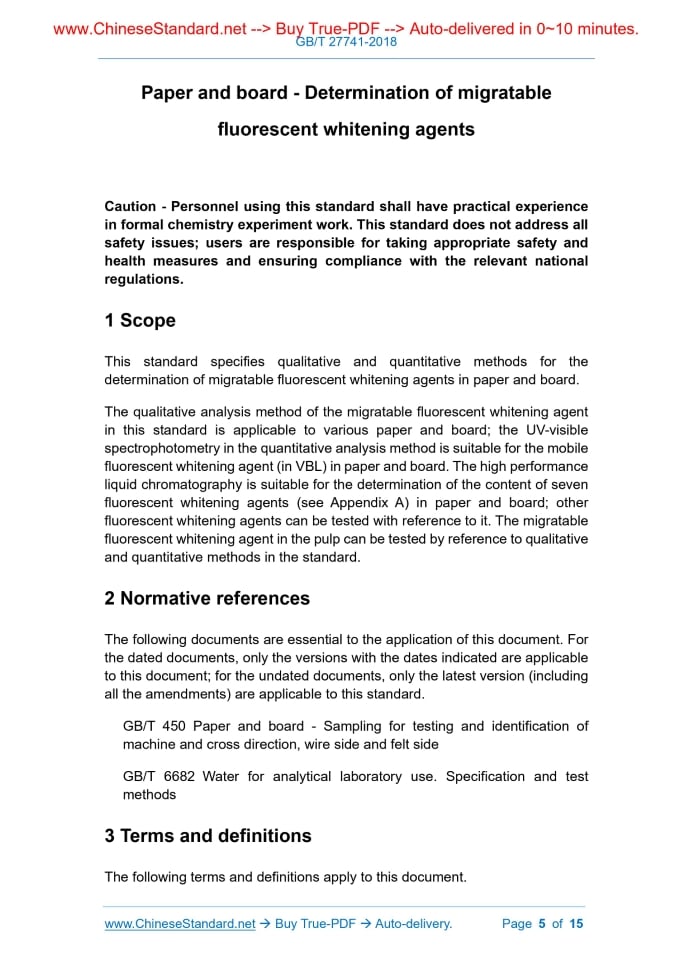Similar standardsGB/T 27741-2018: Paper and board - Determination of migratable fluorescent whitening agents---This is an excerpt. Full copy of true-PDF in English version (including equations, symbols, images, flow-chart, tables, and figures etc.), auto-downloaded/delivered in 9 seconds, can be purchased online: https://www.ChineseStandard.net/PDF.aspx/GBT27741-2018GB NATIONAL STANDARD OF THE PEOPLE’S REPUBLIC OF CHINA ICS 85.010 Y 30 Replacing GB/T 27741-2011 Paper and board - Determination of migratable fluorescent whitening agents Issued on. DECEMBER 28, 2018 Implemented on. JULY 01, 2019 Issued by. State Market Regulatory Administration; Standardization Administration of PRC. Table of ContentsForeword... 3 1 Scope... 5 2 Normative references... 5 3 Terms and definitions... 5 4 Sampling and preparation of specimen... 6 5 Qualitative determination... 6 6 Quantitative determination... 8 7 Detection limit and recovery rate... 13 8 Precision... 13 9 Test report... 13 Appendix A (Normative) Information on the name and chemical structure of fluorescent whitening agent... 14 Appendix B (Informative) Liquid chromatogram of HPLC analysis of fluorescent whitening agent standards... 15ForewordThis standard was drafted in accordance with the rules given in GB/T 1.1-2009. This standard replaces GB/T 27741-2011 "Paper and board - Determination of migratable fluorescent whitening agents". As compared with GB/T 27741-2011, the main technical changes except editorial changes are as follows. - MODIFY the scope of application of the standard (see Chapter 1; Chapter 1 of the 2011 edition); - MODIFY the definition of migratable fluorescent whitening agents (see 3.1; 3.1 of the 2011 edition); - MODIFY the preparation of the specimen (see 4.2; 5.4.1 of the 2011 edition); - MODIFY the expression of the glass funnel (see 5.3.2; 5.3.2 of the 2011 edition); - ADD the balance (see 5.3.4, 6.1.3.2, 6.2.3.2); - ADD the constant temperature oscillating water bath (see 5.3.5 and 6.1.3.3); - MODIFY the expression of the test procedure in the qualitative determination (see 5.4; 5.4 of the 2011 edition); - MODIFY the expression of the principle of UV-visible spectrophotometry (see 6.1.1; 6.1.1 of the 2011 edition); - MODIFY the representation of water in reagents and materials (see 6.1.2 and 6.2.2; 6.1.2 and 6.2.2.1 of the 2011 edition); - MODIFY the pH of the extracts in reagents and materials (see 6.1.2.2 and 6.2.2.5; 6.1.2 and 6.2.2 of the 2011 edition); - MODIFY the formulation of standard solutions in reagents and materials (see 6.1.2 and 6.2.2; 6.1.2 and 6.2.2 of the 2011 edition); - MODIFY the way the results are expressed (see 6.1.5 and 6.2.5; 6.1.5 and 6.2.5 of the 2011 edition); - MODIFY the analytical methods for high performance liquid chromatography (see 6.2; 6.2 of the 2011 edition); - ADD the lower detection limits and recovery rates (see Chapter 8); - MODIFY test report (see Chapter 9; Chapter 9 of the 2011 edition); - ADD the normative appendix A, Information on the name and chemical structure of fluorescent whitening agent; - ADD the informative appendix B, Liquid chromatograms of HPLC analysis of standard substance of fluorescent whitening agents. Please note that some of the contents of this document may involve patents. The issuing organization of this document is not responsible for identifying these patents. This standard was proposed by the China Light Industry Association. This standard shall be under the jurisdiction of the National Paper Industry Standardization Technical Committee (SAC/TC 141). Drafting organizations of this standard. National Paper Quality Supervision and Inspection Center, Shenzhen Inspection and Quarantine Science Research Institute, China Pulp and Paper Research Institute Co., Ltd., Chongqing Liwen Sanitary Paper Manufacturing Co., Ltd. The main drafters of this standard. Xie Tangtang, Wang Chengyun, Gao Jun, Li difei, Xu Rong, Lin Junfeng, Gu Haofei. This standard replaces the standard previously issued as follows. - GB/T 27741-2011. Paper and board - Determination of migratable fluorescent whitening agents Caution - Personnel using this standard shall have practical experience in formal chemistry experiment work. This standard does not address all safety issues; users are responsible for taking appropriate safety and health measures and ensuring compliance with the relevant national regulations.1 ScopeThis standard specifies qualitative and quantitative methods for the determination of migratable fluorescent whitening agents in paper and board. The qualitative analysis method of the migratable fluorescent whitening agent in this standard is applicable to various paper and board; the UV-visible spectrophotometry in the quantitative analysis method is suitable for the mobile fluorescent whitening agent (in VBL) in paper and board. The high performance liquid chromatography is suitable for the determination of the content of seven fluorescent whitening agents (see Appendix A) in paper and board; other fluorescent whitening agents can be tested with reference to it. The migratable fluorescent whitening agent in the pulp can be tested by reference to qualitative and quantitative methods in the standard.2 Normative referencesThe following documents are essential to the application of this document. For the dated documents, only the versions with the dates indicated are applicable to this document; for the undated documents, only the latest version (including all the amendments) are applicable to this standard. GB/T 450 Paper and board - Sampling for testing and identification of machine and cross direction, wire side and felt side GB/T 6682 Water for analytical laboratory use. Specification and test methods3 Terms and definitionsThe following terms and definitions apply to this document.4 Sampling and preparation of specimen4.1 Sampling The sample is taken according to the provisions of GB/T 450. 4.2 Preparation of specimen Cut the specimen into small pieces of about 5 mm 