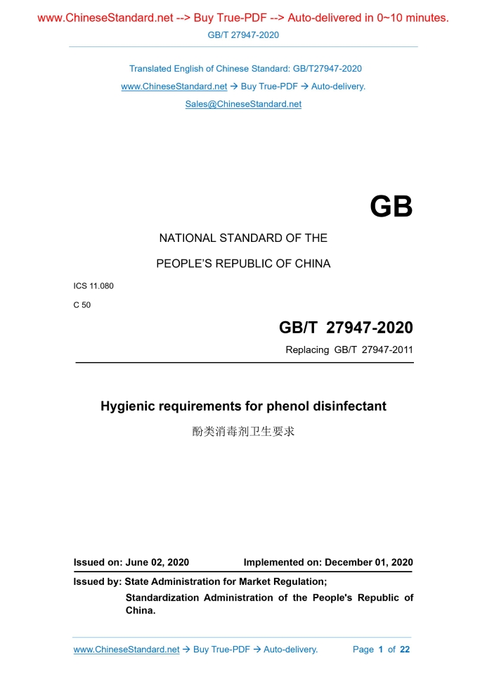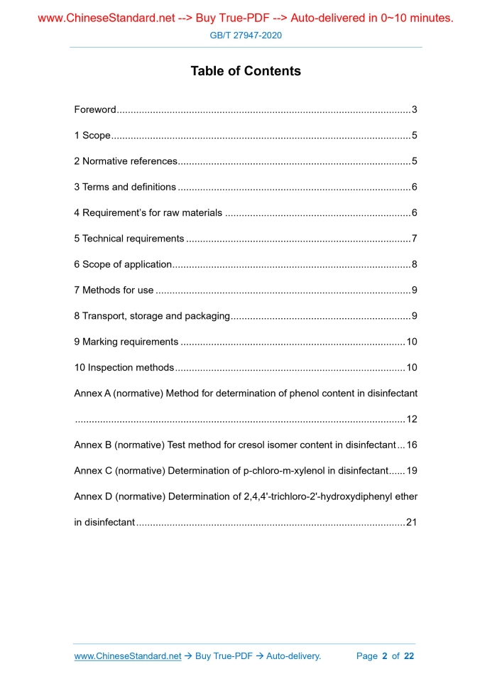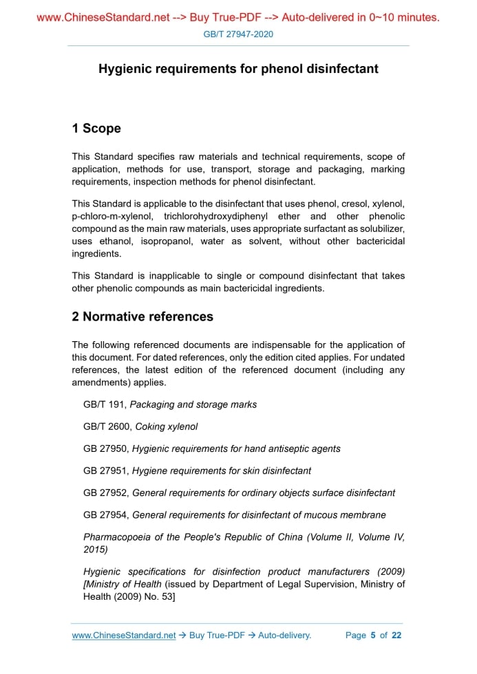 Similar standardsGB/T 27947-2020: Hygienic requirements for phenol disinfectant---This is an excerpt. Full copy of true-PDF in English version (including equations, symbols, images, flow-chart, tables, and figures etc.), auto-downloaded/delivered in 9 seconds, can be purchased online: https://www.ChineseStandard.net/PDF.aspx/GBT27947-2020GB NATIONAL STANDARD OF THE PEOPLE’S REPUBLIC OF CHINA ICS 11.080 C 50 Replacing GB/T 27947-2011 Hygienic requirements for phenol disinfectant ISSUED ON: JUNE 02, 2020 IMPLEMENTED ON: DECEMBER 01, 2020 Issued by: State Administration for Market Regulation; Standardization Administration of the People's Republic of China. Table of ContentsForeword ... 3 1 Scope ... 5 2 Normative references ... 5 3 Terms and definitions ... 6 4 Requirement’s for raw materials ... 6 5 Technical requirements ... 7 6 Scope of application ... 8 7 Methods for use ... 9 8 Transport, storage and packaging ... 9 9 Marking requirements ... 10 10 Inspection methods ... 10 Annex A (normative) Method for determination of phenol content in disinfectant ... 12 Annex B (normative) Test method for cresol isomer content in disinfectant ... 16 Annex C (normative) Determination of p-chloro-m-xylenol in disinfectant ... 19 Annex D (normative) Determination of 2,4,4'-trichloro-2'-hydroxydiphenyl ether in disinfectant ... 21 Hygienic requirements for phenol disinfectant1 ScopeThis Standard specifies raw materials and technical requirements, scope of application, methods for use, transport, storage and packaging, marking requirements, inspection methods for phenol disinfectant. This Standard is applicable to the disinfectant that uses phenol, cresol, xylenol, p-chloro-m-xylenol, trichlorohydroxydiphenyl ether and other phenolic compound as the main raw materials, uses appropriate surfactant as solubilizer, uses ethanol, isopropanol, water as solvent, without other bactericidal ingredients. This Standard is inapplicable to single or compound disinfectant that takes other phenolic compounds as main bactericidal ingredients.2 Normative referencesThe following referenced documents are indispensable for the application of this document. For dated references, only the edition cited applies. For undated references, the latest edition of the referenced document (including any amendments) applies. GB/T 191, Packaging and storage marks GB/T 2600, Coking xylenol GB 27950, Hygienic requirements for hand antiseptic agents GB 27951, Hygiene requirements for skin disinfectant GB 27952, General requirements for ordinary objects surface disinfectant GB 27954, General requirements for disinfectant of mucous membrane Pharmacopoeia of the People's Republic of China (Volume II, Volume IV, 2015) Hygienic specifications for disinfection product manufacturers (2009) [Ministry of Health (issued by Department of Legal Supervision, Ministry of Health (2009) No. 53] Ethanol and isopropanol used as disinfectants for disinfection of hands, skin and mucous membranes shall meet the requirements of Pharmacopoeia of the People's Republic of China (Volume II, 2015). 4.7 Water for production Water for production shall meet the requirements for water for production in Hygienic specifications for disinfection product manufacturers (2009). 4.8 Other raw and auxiliary materials Other raw and auxiliary materials shall meet the corresponding sanitary standards, specifications and other relevant regulations. They shall have corresponding conforming certification materials.5 Technical requirements5.1 Active ingredient content The active ingredient content shall meet the requirements of the label value. 5.2 pH value The pH value shall meet the requirements of product enterprise standards or quality standards. 5.3 Lead, arsenic, mercury impurity limits as well as prohibited and restricted substances For disinfectant for skin and mucous membrane disinfection, its lead, arsenic, mercury impurity limits as well as prohibited and restricted substances shall meet the requirements of GB 27950, GB 27951 and GB 27954. 5.4 Indicators of killing microorganisms 5.4.1 Microbial killing effect in laboratory Select the corresponding microorganism according to the product disinfection object. According to the use concentration and action time specified in corresponding GB 27950, GB 27951, GB 27952, GB 27954, specifications and product instructions, the killing effect of microorganisms shall meet the requirements of Table 1. Table 1 -- Requirements for killing microorganisms Test microorganism Killing or inactivate microorganism logarithm Suspension method a Carrier method b7 Methods for use7.1 General rules Use according to the methods for use that are marked on the product label, the instruction manual. 7.2 Disinfectant containing phenol and cresol After disinfecting and wiping the object surface and fabric, the action time shall not exceed 15min. The soaking and disinfection time shall not exceed 30min. 7.3 Disinfectant containing p-chloro-m-xylenol 7.3.1 Hygienic hand disinfection: smear or wipe disinfection; the action time shall not exceed 1min. 7.3.2 Skin disinfection: wipe disinfection; the action time shall not exceed 5min. 7.3.3 Object surface disinfection: the action time after wiping shall not exceed 15min; the soaking and disinfection time shall not exceed 30min. 7.3.4 Mucosal disinfection: wipe or rinse disinfection; the action time shall not exceed 5min. 7.4 Disinfectant containing triclosan 7.4.1 Hygienic hand disinfection: smear or wipe disinfection; the action time shall not exceed 1min. 7.4.2 Surgical hand disinfection: smear or wipe disinfection; the action time shall not exceed 5min. 7.4.3 Skin disinfection: smear or wipe disinfection; the action time shall not exceed 5min. 7.4.4 Mucosal disinfection: wipe or rinse disinfection; the action time shall not exceed 5min. 7.4.5 Object surface disinfection: after wiping or spraying, the action time shall not exceed 15min; soaking disinfection time shall not exceed 30min.8 Transport, stor