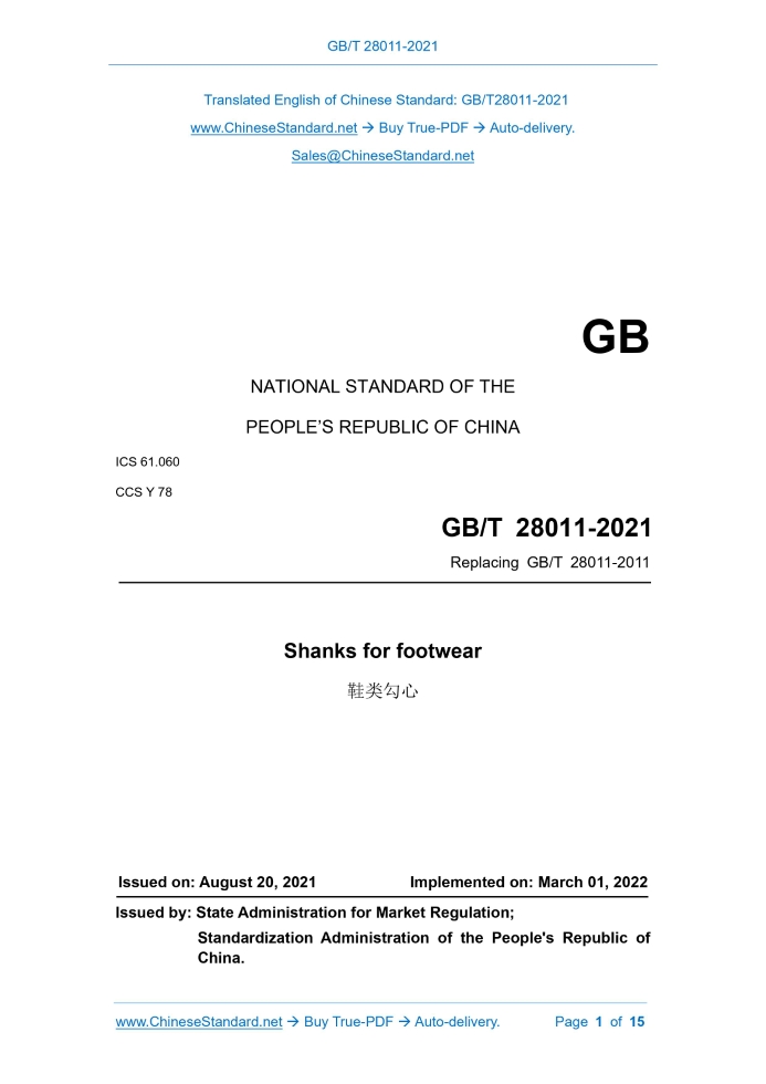 GB/T 28011-2021: Shanks for footwear Delivery: 9 seconds. True-PDF full-copy in English & invoice will be downloaded + auto-delivered via email. See step-by-step procedure Status: Valid GB/T 28011: Historical versions