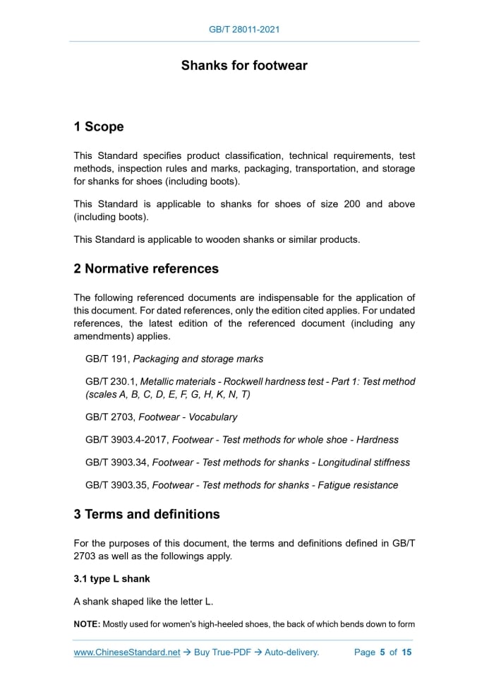 Similar standardsGB/T 28011-2021: Shanks for footwear---This is an excerpt. Full copy of true-PDF in English version (including equations, symbols, images, flow-chart, tables, and figures etc.), auto-downloaded/delivered in 9 seconds, can be purchased online: https://www.ChineseStandard.net/PDF.aspx/GBT28011-2021NATIONAL STANDARD OF THE PEOPLE’S REPUBLIC OF CHINA ICS 61.060 CCS Y 78 Replacing GB/T 28011-2011 Shanks for footwear Issued on. AUGUST 20, 2021 Implemented on. MARCH 01, 2022 Issued by. State Administration for Market Regulation; Standardization Administration of the People's Republic of China. Table of ContentsForeword... 3 1 Scope... 5 2 Normative references... 5 3 Terms and definitions... 5 4 Product classification... 6 5 Technical requirements... 6 6 Number of specimens... 9 7 Test methods... 9 8 Inspection rules... 13 9 Marks, packaging, transportation, storage... 14ForewordThis Standard was drafted in accordance with the rules given in GB/T 1.1-2020 “Directives for standardization - Part 1.Rules for the structure and drafting of standardizing documents". This Standard replaces GB/T 28011-2011 "Shanks for footwear". Compared with GB/T 28011-2011, the main technical changes in this Standard are as follows. - modified the standard's name; - modified the "Scope" (see Chapter 1 of this Edition, Chapter 1 of Edition 2011); - added the definitions for "type I shank", "type L shank" and "type Y shank" (see 3.1, 3.2, 3.3 of this Edition); - modified the product classification (see Chapter 4 of this Edition, Chapter 4 of Edition 2011); - modified the requirements for "marks" (see 5.1 of this Edition, 5.1 of Edition 2011); - modified the requirements for "sensory quality" (see 5.2 of this Edition, 5.2 of Edition 2011); - modified the requirements for "longitudinal stiffness" (see 5.4 of this Edition, 5.4 of Edition 2011); - modified the requirements for "fatigue resistance" (see 5.5 of this Edition, 5.5 of Edition 2011); - modified the requirements for "hardness" (see 5.6 of this Edition, 5.6 of Edition 2011); - modified the requirements for "bending performance" (see 5.7 of this Edition, 5.7 of Edition 2011); - added the graphic for length measurement of type I shank, type L shank and type Y shank (see 7.2.1, 7.2.2, 7.2.3 of this Edition); - modified the test methods for "bending performance" (see 7.8 of this Edition, 7.8 of Edition 2011); - modified the methods for "result judgement" (see 8.3 of this Edition, 8.3 of Edition 2011). Attention is drawn to the possibility that some of the elements of this Standard may be the subject of patent rights. The issuing authority shall not be held responsible for identifying any or all such patent rights. This Standard was proposed by China National Light Industry Council. This Standard shall be under the jurisdiction of National Technical Committee on Shoemaking of Standardization Administration of China (SAC/TC 305). The drafting organizations of this Standard. China Leather and Shoes Research Institute Co., Ltd., Zaozhuang Tianzhu Hardware Technology Co., Ltd., China Textile Association Inspection (Quanzhou) Technical Service Co., Ltd. Main drafters of this Standard. Chang Wenkai, Xiao Houzhu, Wang Zhe, Meng Hongwei. Version of standard substituted by this Standard is. - GB/T 28011-2011. Shanks for footwear1 ScopeThis Standard specifies product classification, technical requirements, test methods, inspection rules and marks, packaging, transportation, and storage for shanks for shoes (including boots). This Standard is applicable to shanks for shoes of size 200 and above (including boots). This Standard is applicable to wooden shanks or similar products.2 Normative referencesThe following referenced documents are indispensable for the application of this document. For dated references, only the edition cited applies. For undated references, the latest edition of the referenced document (including any amendments) applies. GB/T 191, Packaging and storage marks GB/T 230.1, Metallic materials - Rockwell hardness test - Part 1.Test method (scales A, B, C, D, E, F, G, H, K, N, T) GB/T 2703, Footwear - Vocabulary GB/T 3903.4-2017, Footwear - Test methods for whole shoe - Hardness GB/T 3903.34, Footwear - Test methods for shanks - Longitudinal stiffness GB/T 3903.35, Footwear - Test methods for shanks - Fatigue resistance3 Terms and definitionsFor the purposes of this document, the terms and definitions defined in GB/T 2703 as well as the followings apply. 3.1 type L shank A shank shaped like the letter L. 3.2 type Y shank A shank shaped like the letter Y. 3.3 type I shank A shank shaped like the letter I.4 Product classificationThe shanks can be classified according to the following conditions.5 Technical requirements5.1 Marks 5.1.1 The shank shall be marked with the effective heel height or the applicable effective heel height range, expressed in Arabic numerals, and the unit is millimeters. 5.2 Sensory quality The surface of the shank has no burrs, corrosion, cracks, bending deformation, smooth and flat. The positions of ribs, nail holes and forks are correct. 5.3 Size 5.3.1 Size tolerance The length tolerance is the difference between the maximum value and the minimum value in the measured value of the specimen. 5.3.2 Length 5.3.2.1 Length requirements for type I shanks of men's shoes See Table 1 for the length requirements for type I shanks of men's shoes. 5.3.2.3 Length requirements for type L shank The length of the type L shank shall be the length of the type I shank for women's shoes and children's shoes corresponding to different heel heights in Table 2, minus 15mm. 5.4 Longitudinal stiffness The longitudinal stiffness requirements for the shank are shown in Table 3. 5.5 Fatigue resistance After the metal shank is tested for fatigue resistance according to the number of tests specified in Table 4, the specimen shall not be broken. 5.6 Hardness The shank hardness requirements are shown in Table 5.6 Number of specimensTake the shanks of