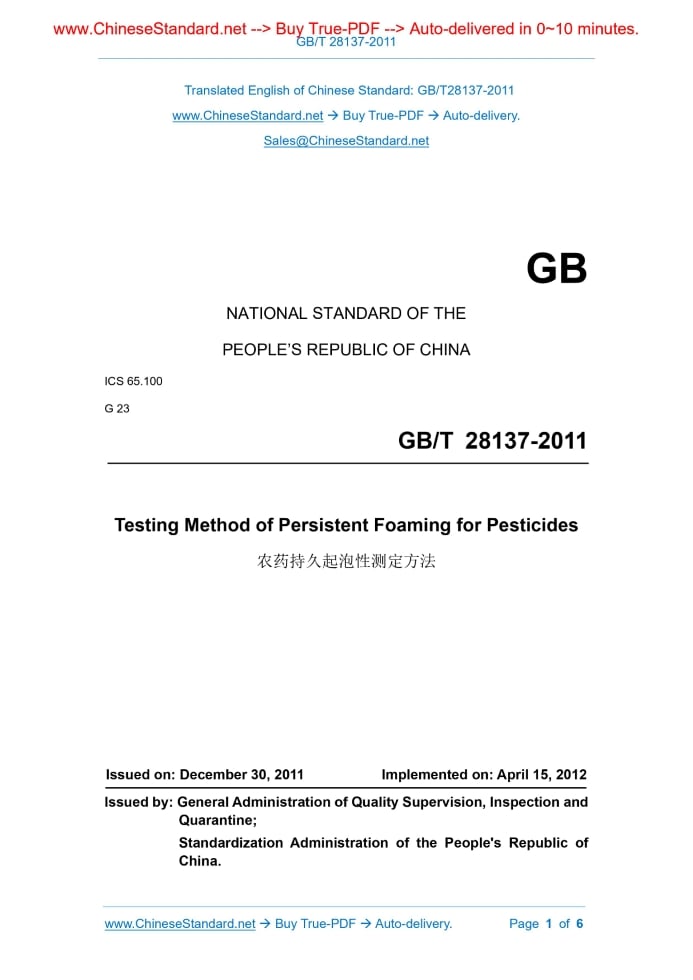 GB/T 28137-2011: Testing method of persistent foaming for pesticides Delivery: 9 seconds. True-PDF full-copy in English & invoice will be downloaded + auto-delivered via email. See step-by-step procedure Status: Valid