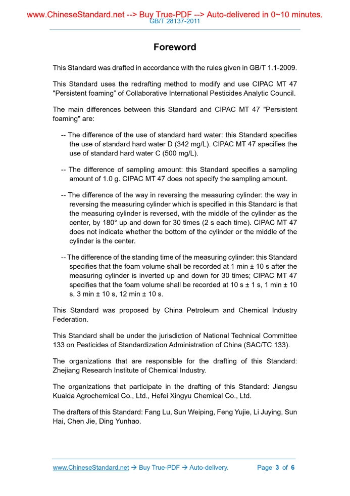 Similar standardsGB/T 28137-2011: Testing method of persistent foaming for pesticides---This is an excerpt. Full copy of true-PDF in English version (including equations, symbols, images, flow-chart, tables, and figures etc.), auto-downloaded/delivered in 9 seconds, can be purchased online: https://www.ChineseStandard.net/PDF.aspx/GBT28137-2011NATIONAL STANDARD OF THE PEOPLE’S REPUBLIC OF CHINA ICS 65.100 G 23 Testing Method of Persistent Foaming for Pesticides ISSUED ON: DECEMBER 30, 2011 IMPLEMENTED ON: APRIL 15, 2012 Issued by: General Administration of Quality Supervision, Inspection and Quarantine; Standardization Administration of the People's Republic of China. Table of ContentsForeword ... 3 1 Scope ... 4 2 Normative references ... 4 3 Testing method ... 4ForewordThis Standard was drafted in accordance with the rules given in GB/T 1.1-2009. This Standard uses the redrafting method to modify and use CIPAC MT 47 "Persistent foaming” of Collaborative International Pesticides Analytic Council. The main differences between this Standard and CIPAC MT 47 "Persistent foaming" are: -- The difference of the use of standard hard water: this Standard specifies the use of standard hard water D (342 mg/L). CIPAC MT 47 specifies the use of standard hard water C (500 mg/L). -- The difference of sampling amount: this Standard specifies a sampling amount of 1.0 g. CIPAC MT 47 does not specify the sampling amount. -- The difference of the way in reversing the measuring cylinder: the way in reversing the measuring cylinder which is specified in this Standard is that the measuring cylinder is reversed, with the middle of the cylinder as the center, by 180° up and down for 30 times (2 s each time). CIPAC MT 47 does not indicate whether the bottom of the cylinder or the middle of the cylinder is the center. -- The difference of the standing time of the measuring cylinder: this Standard specifies that the foam volume shall be recorded at 1 min ± 10 s after the measuring cylinder is inverted up and down for 30 times; CIPAC MT 47 specifies that the foam volume shall be recorded at 10 s ± 1 s, 1 min ± 10 s, 3 min ± 10 s, 12 min ± 10 s. This Standard was proposed by China Petroleum and Chemical Industry Federation. This Standard shall be under the jurisdiction of National Technical Committee 133 on Pesticides of Standardization Administration of China (SAC/TC 133). The organizations that are responsible for the drafting of this Standard: Zhejiang Research Institute of Chemical Industry. The organizations that participate in the drafting of this Standard: Jiangsu Kuaida Agrochemical Co., Ltd., Hefei Xingyu Chemical Co., Ltd. The drafters of this Standard: Fang Lu, Sun Weiping, Feng Yujie, Li Juying, Sun Hai, Chen Jie, Ding Yunhao. Testing Method of Persistent Foaming for Pesticides1 ScopeThis Standard specifies the testing method of persistent foaming for pesticides. This standard applies to pesticide products that need to be diluted with water before application.2 Normative referencesThe following documents are indispensable for the application of this document. For dated references, only the dated version applies to this document. For undated references, the latest edition (including all amendments) applies to this document. GB/T 601, Chemical reagent. Preparations of reference titration solutions GB/T 603, Chemical reagent. Preparations of reagent solutions for use in test methods GB/T 5451-2001, Testing method for the wettability of dispersible powders of pesticides3 Testing method3.1 Method summary Mix a specified amount of the sample with standard hard water; let it stand still; then, record the foam volume. 3.2 Reagents and solutions Water: grade-3 water; Magnesium oxide: before use, dry it at 105°C for more than 2 h; Calcium carbonate: before use, dry it at 105°C for more than 2 h; Hydrochloric acid solution: c(HCl) = 0.1 mol/L, prepare according to GB/T 601; Hydrochloric acid solution: c(HCl) = 1.0mol/L, prepare according to GB/T 601; ......Source: Above contents are excerpted from the full-copy PDF -- translated/reviewed by: www.ChineseStandard.net / Wayne Zheng et al. Tips & Frequently Asked Questions:Question 1: How long will the true-PDF of English version of GB/T 28137-2011 be delivered?Answer: The full copy PDF of English version of GB/T 28137-2011 can be downloaded in 9 seconds, and it will also be emailed to you in 9 seconds (double mechanisms to ensure the delivery reliably), with PDF-invoice.Question 2: Can I share the purchased PDF of GB/T 28137-2011_English with my colleagues?Answer: Yes. The purchased PDF of GB/T 28137-2011_English will be deemed to be sold to your employer/organization who actually paid for it, including your colleagues and your employer's intranet.Question 3: Does the price include tax/VAT?Answer: Yes. Our tax invoice, downloaded/delivered in 9 seconds, includes all tax/VAT and complies with 100+ countries' tax regulations (tax exempted in 100+ countries) -- See Avoidance of Double Taxation Agreements (DTAs): List of DTAs signed between Singapore and 100+ countriesQuestion 4: Do you accept my currency other than USD?Answer: Yes. www.ChineseStandard.us -- GB/T 28137-2011 -- Click this link and select your country/currency to pay, the exact amount in your currency will be printed on the invoice. Full PDF will also be downloaded/emailed in 9 seconds.How to buy and download a true PDF of English version of GB/T 28137-2011?A step-by-step guide to download PDF of GB/T 28137-2011_EnglishStep 1: Visit website https://www.ChineseStandard.net (Pay in USD), or https://www.ChineseStandard.us (Pay in any currencies such as Euro, KRW, JPY, AUD).Step 2: Search keyword "GB/T 28137-2011". Step 3: Click "Add to Cart". If multiple PDFs are required, repeat steps 2 and 3 to add up to 12 PDFs to cart. Step 4: Select payment option (Via payment agents Stripe or PayPal). Step 5: Customize Tax Invoice -- Fill up your email etc. Step 6: Click "Checkout". Step 7: Make payment by cr