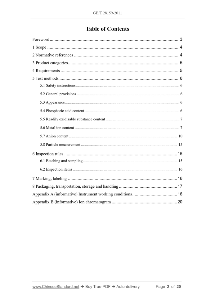 Similar standardsGB/T 28159-2011: Electronic grade phosphoric acid---This is an excerpt. Full copy of true-PDF in English version (including equations, symbols, images, flow-chart, tables, and figures etc.), auto-downloaded/delivered in 9 seconds, can be purchased online: https://www.ChineseStandard.net/PDF.aspx/GBT28159-2011GB NATIONAL STANDARD OF THE PEOPLE’S REPUBLIC OF CHINA ICS 31.030 L 90 Electronic grade phosphoric acid Issued on: DECEMBER 30, 2011 Implemented on: JULY 01, 2012 Issued by. General Administration of Quality Supervision, Inspection and Quarantine; Standardization Administration of the People’s Republic of China. Table of ContentsForeword... 3 1 Scope... 4 2 Normative references... 4 3 Product categories... 5 4 Requirements... 5 5 Test methods... 6 5.1 Safety instructions... 6 5.2 General provisions... 6 5.3 Appearance... 6 5.4 Phosphoric acid content... 6 5.5 Readily oxidizable substance content... 7 5.6 Metal ion content... 7 5.7 Anion content... 10 5.8 Particle measurement... 15 6 Inspection rules... 15 6.1 Batching and sampling... 15 6.2 Inspection items... 16 7 Marking, labeling... 16 8 Packaging, transportation, storage and handling... 17 Appendix A (informative) Instrument working conditions... 18 Appendix B (informative) Ion chromatogram... 20 Electronic grade phosphoric acid1 ScopeThis Standard specifies the requirements, test methods, inspection rules, as well as marking, packaging, transportation, storage, etc. of electronic grade phosphoric acid. This Standard applies to electronic grade phosphoric acid for industry use. This Standard does not address safety issues in use. Users of this Standard are responsible for establishing appropriate safety and health clauses and limitations on the scope of use.2 Normative referencesThe following documents are indispensable for the application of this document. For dated references, only the edition cited applies. For undated references, the latest edition of the referenced document (including any amendments) applies. GB/T 191, Packaging - Pictorial marking for handling of goods GB/T 601, Chemical reagent - Preparations of reference titration solutions GB/T 603, Chemical reagent - Preparations of reagent solutions for use in test methods GB/T 1282-1996, Chemical reagent - Phosphoric acid GB 3149-2004, Food additive - Phosphoric acid GB/T 6678, General principles for sampling chemical products GB/T 8170, Rules of rounding off for numerical values & expression and judgment of limiting values GB/T 11446.1, Electronic Grade Water GB 15258, General rules for preparation of precautionary label for chemicals GB 50472, Code for design of electronic industry clean room spectrometer separates the ions according to the mass-to-charge ratio and quantifies the content of the corresponding ions in the sample by the intensity of the ion mass spectrum peak. Use the standard addition method for sample analysis, and the linear range of the standard curve is 20 ng/L ~ 500 ng/L. 5.6.2 Reagents and materials 5.6.2.1 Nitric acid. Ultrapure nitric acid with a metal ion content not exceeding 1 μg/L, or a certified standard solution of the corresponding concentration. 5.6.2.2 Nitric acid solution (1+19, volume ratio). Take 150 mL of nitric acid as specified in 5.6.2.1 and add it to 950 mL of ultrapure water. 5.6.2.3 Tuning solution. 1 μg/L, provided by the instrument supplier or a certified tuning solution. 5.6.2.4 Tuning working solution. Take 20 mL of the tuning solution specified in 5.6.2.3 and place it in a clean polytetrafluoroethylene bottle. This solution can be kept for 7 days if refrigerated at 4 ℃ and used repeatedly. 5.6.2.5 Multi-element standard stock solution. Select the standard solution with a known metal ion concentration of 100 μg/mL listed in Table 1, or select a certified standard solution of other concentrations. 5.6.2.6 Multi-element standard working solution. Take 100 μL of the standard stock solution specified in 5.6.2.5 and place it in a clean polytetrafluoroethylene bottle; add 2 mL of nitric acid specified in 5.6.2.1; use ultrapure water to dilute to 100 mL; shake well. The metal ion concentration in this standard working solution is 100 μg/L. This solution can be kept for 7 days if refrigerated at 4 ℃ and used repeatedly. 5.6.2.7 High-purity argon, hydrogen, helium and other gases required by the instrument shall have a purity of not less than 99.995%. 5.6.2.8 Phosphoric acid standard sample (quality control sample). 1% phosphoric acid standard solution. Select a certified phosphoric acid standard solution or a quality control sample approved by inter-laboratory comparison. 5.6.3 Instruments and apparatuses 5.6.3.1 Inductively coupled plasma-mass spectrometer (ICP-MS), equipped with Collision Reaction System (ORS) (recommended instrument detection limit. low-mass elements (Be) < 5 × 10-9, medium- and high-mass elements (In, Bi) < 1 × 10-9; abundance sensitivity. low-mass elements ≤ 1 × 10-6, high-mass elements ≤ 5 × 10-7; stability. short-term RSD ≤ 4% (20 min), long-term RSD ≤ 5% (2 h), 24-hour mass axis deviation ±0.1 amu; anti-interference capability. oxide ratio ≤ 3%, double charge ratio ≤ 8%.) 5.6.3.2 Precision sampling gun. 100 μL, 1 000 μL, 5 mL. 5.6.3.3 Ultrapure water purifier, with a 0.1 μm terminal filter, for online preparation of ultrapure water with a purity of not less than 18.2 MΩ·cm (25 °C). 5.6.4 Analysis steps 5.6.4.1 Sample test fluid Weigh 10 g of the sample to be tested in batches to an accuracy of 0.000 2 g; place them in six 100 mL high-purity polytetrafluoroethylene bottles; add 2 mL of ultrapure nitric acid; then add 0 mL, 0.1 mL, 0.2 mL, 0.4 mL, 0.6 mL, and 1.0 mL of the multi-element standard working solution specified in 5.6.2.6 in that order; use ultrapure water to dilute to 100.00 g; shake well. 5.6.4.2 Blank test solution Add 2 mL of ultrapure nitric acid to a polytetrafluoroethylene high-purity bottle; use ultrapure water to dilute to 100 mL (100