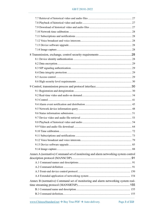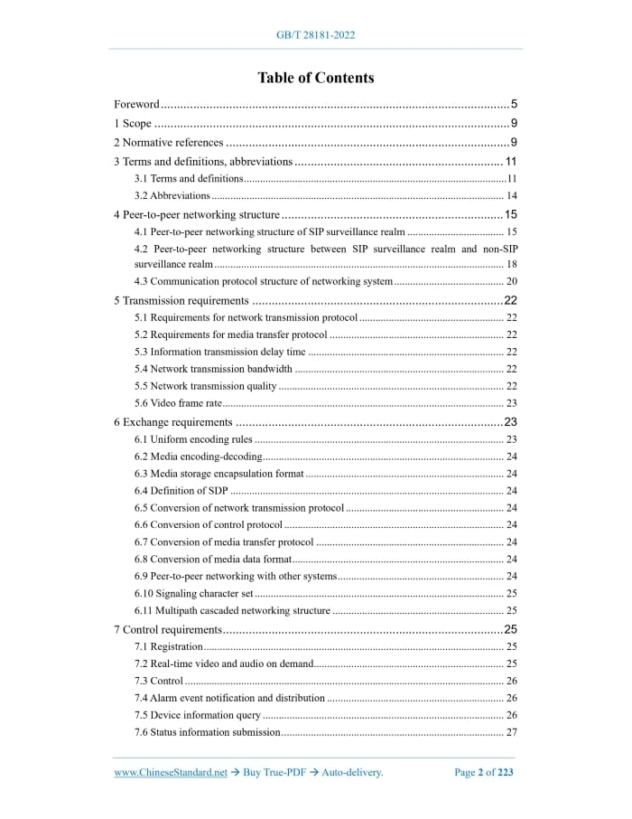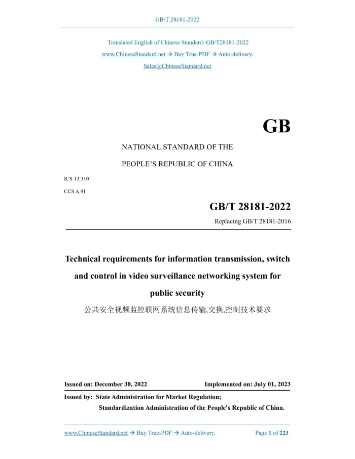 Similar standardsGB/T 28181-2022: Technical requirements for information transmission, switch and control in video surveillance networking system for public security---This is an excerpt. Full copy of true-PDF in English version (including equations, symbols, images, flow-chart, tables, and figures etc.), auto-downloaded/delivered in 9 seconds, can be purchased online: https://www.ChineseStandard.net/PDF.aspx/GBT28181-2022 GB NATIONAL STANDARD OF THE PEOPLE’S REPUBLIC OF CHINA ICS 13.310 CCS A 91 Replacing GB/T 28181-2016 Technical requirements for information transmission, switch and control in video surveillance networking system for public security Issued on. DECEMBER 30, 2022 Implemented on. JULY 01, 2023 Issued by. State Administration for Market Regulation; Standardization Administration of the People's Republic of China. Table of ContentsForeword... 5 1 Scope... 9 2 Normative references... 9 3 Terms and definitions, abbreviations... 11 4 Peer-to-peer networking structure... 15 5 Transmission requirements... 22 6 Exchange requirements... 23 7 Control requirements... 25 8 Transmission, exchange, control security requirements... 28 9 Control, transmission process and protocol interface... 30 Annex A (normative) Command set of monitoring and alarm networking system control description protocol (MANSCDP)... 91 Annex B (normative) Command set of monitoring and alarm networking system real- time streaming protocol (MANSRTSP)... 155 Annex C (normative) RTP-based video and audio data encapsulation... 160 Annex D (normative) Video and audio media transmission based on TCP protocol 165 Annex E (normative) Unicode rules... 166 Annex F (normative) Technical requirements for video and audio encoding/decoding ... 171 Annex G (normative) SDP definition... 184 Annex H (informative) Technical requirements for camera and platform routing... 191 Annex I (normative) Protocol version identification... 198 Annex J (normative) Instructions for directory query responses... 199 Annex K (normative) Keep-alive mechanism for media streams... 205 Annex L (normative) Definition of the Subject header field... 206 Annex M (normative) Multiple response messaging... 207 Annex N (normative) Interdomain directory subscription notifications... 208 Annex O (normative) The code of the acquisition part type of the camera... 217 Bibliography... 2221 ScopeThis document specifies the peer-to-peer networking structure of the video surveillance networking system for public security (hereinafter referred to as "surveillance networking system"), the basic requirements and security requirements for transmission, exchange, and control, as well as the technical requirements for control, transmission process, and protocol interface. This document is applicable to the scheme design, system testing, acceptance and related device development and production of the video surveillance networking system for public security. Other video surveillance networking systems can be implemented by using this document as reference.2 Normative referencesThe following referenced documents are indispensable for the application of this document. For dated references, only the edition cited applies. For undated references, the latest edition of the referenced document (including any amendments) applies. GB/T 4754, Industrial classification for national economic activities GB/T 10114-2003, Rules for the code representation of administrative divisions under counties GB 18030, Information technology - Chinese coded character set GB/T 25724, Technical specifications for surveillance video and audio coding GB 35114, Technical requirements for information security of video surveillance network system for public security GA/T 380, Coding rules for public security organs ISO/IEC 13818-1.2019, Information technology - Generic coding of moving pictures and associated audio information - Part 1.Systems ISO/IEC 14496-2.2004, Information technology – Coding of audio-visual objects - Part 2.Visual ISO/IEC 14496-2.2004/Amd2.2005, Information technology - Coding of audio- visual objects - Part 2.Visual - Amendment 2.New Levels for Simple Profile ISO/IEC 14496-3.2019, Information technology - Coding of audio-visual objects - Part 3.Audio ISO/IEC 14496-4, Information technology - Coding of audio-visual objects - Part 4. Conformance testing ISO/IEC 14496-4.2004/AMD10.2005, Information technology - Coding of audio- visual objects – Part 4.Conformance testing - Amendment 10.Conformance extensions for simple profile levels 4a and53 Terms and definitions, abbreviations3.1 Terms and definitions For the purposes of this document, the following terms and definitions apply. 3.1.1 video surveillance networking system for public security An video integrated network system that for the purpose of maintaining national security and social stability, preventing and combating illegal and criminal activities, it comprehensively applies audio-visual, communication, computer network, system integration and other technologies to build functions such as information collection, transmission, exchange, control, display, storage, and processing and be able to realize the interconnection, intercommunication and mutual control between different devices and systems. 3.1.2 front-end device Information collection, encoding/processing, storage, transmission, security control and other devices installed in the networking system at the observation site. 3.1.3 user terminal A client device that is registered and authorized by a networking system and has operational requirements for data and/or devices within the system. 3.1.4 session initiation protocol; SIP Developed by the Internet Engineering Task Force (IETF), it is a framework protocol for multi-party multimedia communication. 3.1.5 session control The process of establishing, modifying or ending a communication between one or more participants.4 Peer-to-peer networking structure4.1 Peer-to-peer networking structure of SIP surveillance realm 