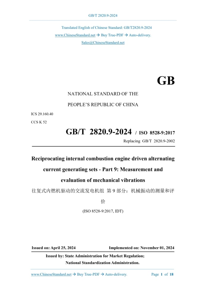 GB/T 2820.9-2024: Reciprocating internal combustion engine driven alternating current generating sets - Part 9: Measurement and evaluation of mechanical vibrations Delivery: 9 seconds. True-PDF full-copy in English & invoice will be downloaded + auto-delivered via email. See step-by-step procedure Status: Valid GB/T 2820.9: Historical versions