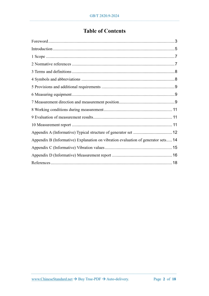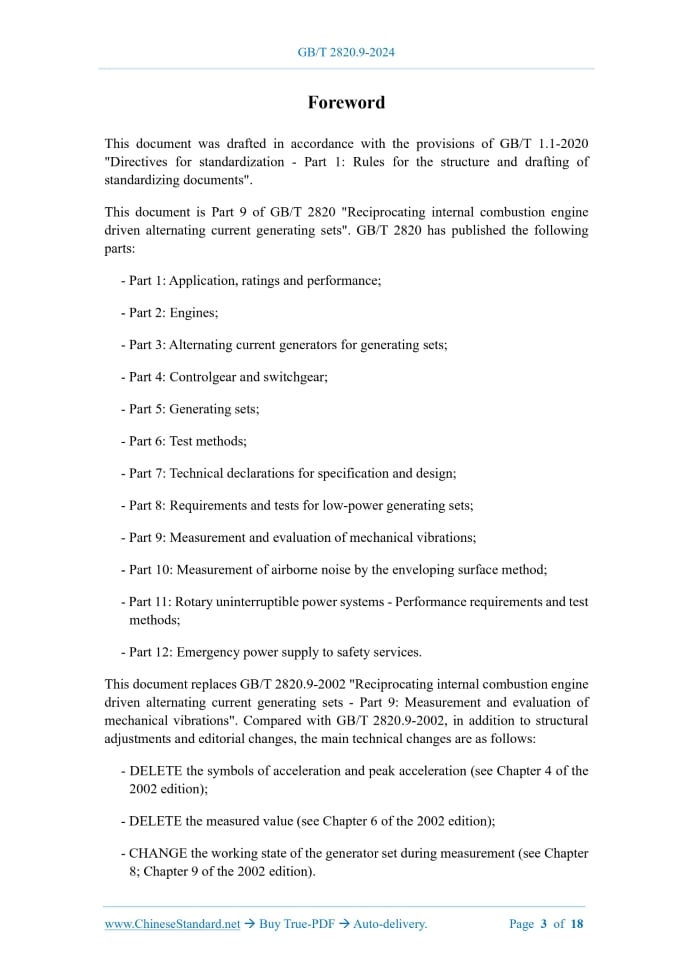 Similar standardsGB/T 2820.9-2024: Reciprocating internal combustion engine driven alternating current generating sets - Part 9: Measurement and evaluation of mechanical vibrations---This is an excerpt. Full copy of true-PDF in English version (including equations, symbols, images, flow-chart, tables, and figures etc.), auto-downloaded/delivered in 9 seconds, can be purchased online: https://www.ChineseStandard.net/PDF.aspx/GBT2820.9-2024 GB NATIONAL STANDARD OF THE PEOPLE’S REPUBLIC OF CHINA ICS 29.160.40 CCS K 52 GB/T 2820.9-2024 / ISO 8528-9:2017 Replacing GB/T 2820.9-2002 Reciprocating internal combustion engine driven alternating current generating sets - Part 9: Measurement and evaluation of mechanical vibrations (ISO 8528-9:2017, IDT) ISSUED ON: APRIL 25, 2024 IMPLEMENTED ON: NOVEMBER 01, 2024 Issued by: State Administration for Market Regulation; National Standardization Administration. Table of ContentsForeword ... 3 Introduction ... 5 1 Scope ... 7 2 Normative references ... 7 3 Terms and definitions ... 8 4 Symbols and abbreviations ... 8 5 Provisions and additional requirements ... 9 6 Measuring equipment ... 9 7 Measurement direction and measurement position ... 9 8 Working conditions during measurement ... 11 9 Evaluation of measurement results ... 11 10 Measurement report ... 11 Appendix A (Informative) Typical structure of generator set ... 12 Appendix B (Informative) Explanation on vibration evaluation of generator sets ... 14 Appendix C (Informative) Vibration values ... 15 Appendix D (Informative) Measurement report ... 16 References ... 18ForewordThis document was drafted in accordance with the provisions of GB/T 1.1-2020 "Directives for standardization - Part 1: Rules for the structure and drafting of standardizing documents". This document is Part 9 of GB/T 2820 "Reciprocating internal combustion engine driven alternating current generating sets". GB/T 2820 has published the following parts: - Part 1: Application, ratings and performance; - Part 2: Engines; - Part 3: Alternating current generators for generating sets; - Part 4: Controlgear and switchgear; - Part 5: Generating sets; - Part 6: Test methods; - Part 7: Technical declarations for specification and design; - Part 8: Requirements and tests for low-power generating sets; - Part 9: Measurement and evaluation of mechanical vibrations; - Part 10: Measurement of airborne noise by the enveloping surface method; - Part 11: Rotary uninterruptible power systems - Performance requirements and test methods; - Part 12: Emergency power supply to safety services. This document replaces GB/T 2820.9-2002 "Reciprocating internal combustion engine driven alternating current generating sets - Part 9: Measurement and evaluation of mechanical vibrations". Compared with GB/T 2820.9-2002, in addition to structural adjustments and editorial changes, the main technical changes are as follows: - DELETE the symbols of acceleration and peak acceleration (see Chapter 4 of the 2002 edition); - DELETE the measured value (see Chapter 6 of the 2002 edition); - CHANGE the working state of the generator set during measurement (see Chapter 8; Chapter 9 of the 2002 edition). Reciprocating internal combustion engine driven alternating current generating sets - Part 9: Measurement and evaluation of mechanical vibrations1 ScopeThis document describes the procedures for measuring and evaluating the specified external mechanical vibration characteristics of the generator set at specified measurement positions. This document is applicable to fixed and mobile AC generator sets driven by reciprocating internal combustion engines with rigid and/or elastic mounting. This document is applicable to land and marine use, not to generator sets used in aviation or generator sets used to drive land vehicles and locomotives. For some specific applications (such as power supply to hospitals, high-rise buildings, etc.), additional requirements are required. The provisions of this document are regarded as the basis for these applications. For generator sets driven by other reciprocating prime movers (such as biogas engines, steam engines, etc.), the provisions of this document are regarded as the basis for these applications.2 Normative referencesThe contents of the following documents constitute the essential clauses of this document through normative references in the text. Among them, for dated references, only the version corresponding to the date applies to this document; for undated references, the latest version (including all amendments) applies to this document. ISO 2041 Mechanical vibration, shock and condition monitoring - Vocabulary Note: GB/T 2298-2010 Mechanical vibration, shock and condition monitoring vocabulary (ISO 2041:2009, IDT). ISO 8528-5:2022 Reciprocating internal combustion engine driven alternating current generating sets - Part 5: Generating sets Note 1: There is no technical difference between the referenced content of ISO 8528- 5:2022 and the referenced content of ISO 8528-5:2013. ......Source: Above contents are excerpted from the full-copy PDF -- translated/reviewed by: www.ChineseStandard.net / Wayne Zheng et al. Tips & Frequently Asked Questions:Question 1: How long will the true-PDF of English version of GB/T 2820.9-2024 be delivered?Answer: The full copy PDF of English version of GB/T 2820.9-2024 can be downloaded in 9 seconds, and it will also be emailed to you in 9 seconds (double mechanisms to ensure the delivery reliably), with PDF-invoice.Question 2: Can I share the purchased PDF of GB/T 2820.9-2024_English with my colleagues?Answer: Yes. The purchased PDF of GB/T 2820.9-2024_English will be deemed to be sold to your employer/organization who actually paid for it, including your colleagues and your employer's intranet.Question 3: Does the price include tax/VAT?Answer: Yes. Our tax invoice, downloaded/delivered in 9 seconds, includes all tax/VAT and complies with 100+ countries' tax regulations (tax exempted in 100+ countr