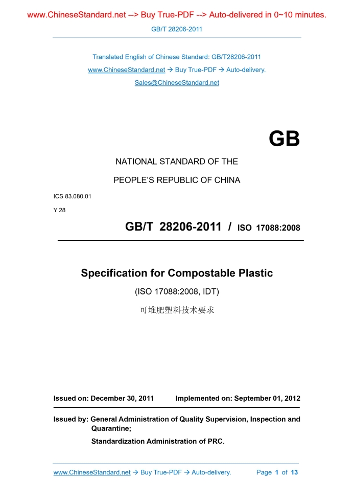GB/T 28206-2011: Specification for compostable plastic Delivery: 9 seconds. True-PDF full-copy in English & invoice will be downloaded + auto-delivered via email. See step-by-step procedure Status: Valid