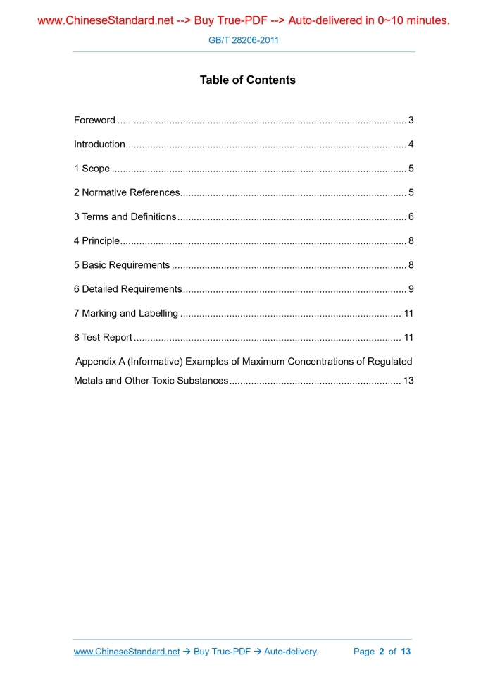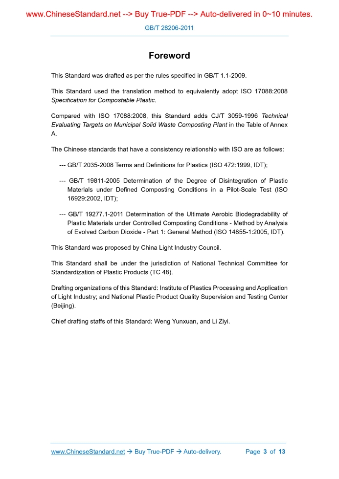 Similar standardsGB/T 28206-2011: Specification for compostable plastic---This is an excerpt. Full copy of true-PDF in English version (including equations, symbols, images, flow-chart, tables, and figures etc.), auto-downloaded/delivered in 9 seconds, can be purchased online: https://www.ChineseStandard.net/PDF.aspx/GBT28206-2011Specification for compostable plastic ICS 83.080.01 Y28 National Standards of People's Republic of China Compostable plastic technical requirements (ISO 17088.2008, IDT) Published on.2011-12-30 2012-09-01 implementation General Administration of Quality Supervision, Inspection and Quarantine of the People's Republic of China China National Standardization Administration issued ForewordThis standard was drafted in accordance with the rules given in GB/T 1.1-2009. This standard adopts the translation method equivalent to ISO 17088.2008 "Technical requirements for compostable plastics". Compared with ISO 17088.2008, this standard adds CJ/T 3059-1996 “Urban Domestic Waste Compost” to Appendix A. Treatment plant technical evaluation index. The Chinese standards that have a consistent correspondence with ISO are as follows. GB/T 2035-2008 Plastic terminology and its definition (ISO 472.1999, IDT); GB/T 19811-2005 Determination of the degree of disintegration of plastic materials under the conditions of composting pilot test (ISO 16929.2002, IDT); GB/T 19277.1-2011 Determination of the final aerobic biodegradation and disintegration ability of materials under controlled composting conditions Method of releasing carbon dioxide Part 1. General method (ISO 14855-1.2005, IDT). This standard was proposed by the China Light Industry Association. This standard is under the jurisdiction of the National Plastics Standardization Technical Committee (TC48). This standard was drafted by the Light Industry Plastics Processing Application Research Institute and the National Plastic Products Quality Supervision and Inspection Center (Beijing). The main drafters of this standard. Weng Yunxuan and Li Ziyi.introductionThe disposal of solid waste has become an issue of increasing concern worldwide. Cities, towns and villages are trying to pass various recycling parties The law changes the way of landfill and non-energy recycling of waste in order to recover more available waste and turn waste into useful product. Plastic recycling technology includes material recovery (physical recovery, chemical or raw material recovery, biological or organic recycling) and thermal energy under controlled conditions Recycling. As compost (bio or organic recycling) applications continue to grow, it is necessary to properly identify compostable plastics and products that are made The product should be disintegratable, biodegradable under composting conditions and will not have any permanent toxic residues. Compostable plastic technical requirements WARNING. Wastewater, activated sludge, soil, and compost may contain potential pathogens, so appropriate precautions should be taken when handling. Special care must be taken when handling toxicity test compounds or compounds of unknown nature.1 ScopeThis standard specifies procedures and requirements for the identification and identification of plastics and products with aerobic composting performance. The technical requirements of this standard include the following four aspects. a) biodegradability; b) disintegration performance; c) negative impacts on composting processes and equipment; d) The quality of the resulting compost, including the amount of controlled metals and other harmful components. This standard also specifies the identification content of compostable plastics and products, such as “compostable” or “compostable in municipal or commercial facilities” or “heap” Biodegradable in the process of fertilizer." Note. Composting of compostable plastics should be carried out in well-run composting facilities, requiring suitable temperature, water content, aerobic conditions, carbon/nitrogen ratio And processing methods, etc. Commercial and municipal composting equipment can usually meet these conditions. Under these conditions, compostable plastics will disintegrate and biological Decomposition, the decomposition rate is equivalent to garden waste, kraft paper bags and food debris.2 Normative referencesThe following documents are indispensable for the application of this document. For dated references, only dated versions apply to this article. Pieces. For undated references, the latest edition (including all amendments) applies to this document. GB/T 2035-2008 Plastic terminology and its definition (ISO 472.1999, IDT) GB/T 19277.1-2011 Determination of the final aerobic biodegradation and disintegration ability of materials under controlled composting conditions Method of releasing carbon dioxide Part 1. General method (ISO 14855-1.2005, IDT) GB/T 19811-2005 Determination of the degree of disintegration of plastic materials under the conditions of composting pilot test (ISO 16929.2002, IDT) ISO 14855-2 Determination of the ultimate aerobic biodegradation and disintegration capacity of materials under controlled composting conditions Methods of carbonation - Part 2. Laboratory scales - Determination of carbon dioxide emissions by weight ISO 20200 Plastics Determining the degree of disintegration of plastic materials in a laboratory scale condition composting environment EN13432 Packaging requirements for recyclability of packaging by composting and biodegradation Test plan and final acceptance criteria for packaging ASTMD5338 Method for the determination of aerobic biodegradation of plastics under controlled composting conditions OECD208 Chemical Testing Practice Terrestrial Planting Test3 Terms and definitionsThe following terms and definitions as defined in GB/T 2035-2008 apply to this document. 3.1 Biodegradableduringcomposting in composting Synonymous with "compostable" (see definition of compostable plastic) 3.2 Catalyst catalyst 