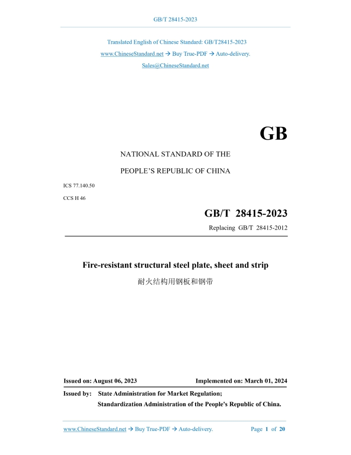 GB/T 28415-2023: Fire-resistant structural steel plate, sheet and strip Delivery: 9 seconds. True-PDF full-copy in English & invoice will be downloaded + auto-delivered via email. See step-by-step procedure Status: Valid GB/T 28415: Historical versions