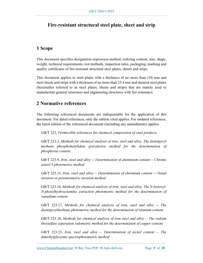 Similar standardsGB/T 28415-2023: Fire-resistant structural steel plate, sheet and strip---This is an excerpt. Full copy of true-PDF in English version (including equations, symbols, images, flow-chart, tables, and figures etc.), auto-downloaded/delivered in 9 seconds, can be purchased online: https://www.ChineseStandard.net/PDF.aspx/GBT28415-2023GB NATIONAL STANDARD OF THE PEOPLE’S REPUBLIC OF CHINA ICS 77.140.50 CCS H 46 Replacing GB/T 28415-2012 Fire-resistant structural steel plate, sheet and strip ISSUED ON: AUGUST 06, 2023 IMPLEMENTED ON: MARCH 01, 2024 Issued by: State Administration for Market Regulation; Standardization Administration of the People's Republic of China. Table of ContentsForeword ... 3 1 Scope ... 5 2 Normative references ... 5 3 Terms and definitions ... 7 4 Designation expression method ... 7 5 Ordering content ... 8 6 Size, shape, weight... 8 7 Technical requirements ... 9 8 Test methods ... 18 9 Inspection rules ... 19 10 Packaging, marking and quality certificate ... 20 Fire-resistant structural steel plate, sheet and strip1 ScopeThis document specifies designation expression method, ordering content, size, shape, weight, technical requirements, test methods, inspection rules, packaging, marking and quality certificates of fire-resistant structural steel plates, sheets and strips. This document applies to steel plates with a thickness of no more than 150 mm and steel sheets and strips with a thickness of no more than 25.4 mm and sheared steel plates (hereinafter referred to as steel plates, sheets and strips) that are mainly used to manufacture general structures and engineering structures with fire resistance.2 Normative referencesThe following referenced documents are indispensable for the application of this document. For dated references, only the edition cited applies. For undated references, the latest edition of the referenced document (including any amendments) applies. GB/T 222, Permissible tolerances for chemical composition of steel products GB/T 223.3, Methods for chemical analysis of iron, steel and alloy. The diantipyryl methane phosphomolybdate gravimetric method for the determination of phosphorus content GB/T 223.9, Iron, steel and alloy -- Determination of aluminium content -- Chrome azurol S photometric method GB/T 223.11, Iron, steel and alloy -- Determination of chromium content -- Visual titration or potentiometric titration method GB/T 223.14, Methods for chemical analysis of iron, steel and alloy. The N-benzoyl- N-phenylhydroxylamine extraction photometric method for the determination of vanadium content GB/T 223.17, Methods for chemical analysis of iron, steel and alloy -- The diantipyrylmethane photometric method for the determination of titanium content GB/T 223.18, Methods for chemical analysis of iron steel and alloy -- The sodium thiosulfate separation iodometric method for the determination of copper content GB/T 223.23, Iron, steel and alloy -- Determination of nickel content -- The dimethylglyoxime spectrophotometric method GB/T 223.26, Iron, steel and alloy -- Determination of molybdenum content -- The thiocyanate spectrophotometric method GB/T 223.40, Iron, steel and alloy -- Determination of niobium content by the sulphochlorophenol S spectrophotometric method GB/T 223.60, Methods for chemical analysis of iron, steel and alloy -- The perchloric acid dehydration gravimetric method for the determination of silicon content GB/T 223.63, Iron, steel and alloy -- Determination of manganese content -- Sodium (potassium) periodate spectrophotometric method GB/T 223.68, Methods for chemical analysis of iron, steel and alloy -- The potassium iodate titration method after combustion in the pipe furnace for the determination of sulfur content GB/T 223.69, Iron, steel and alloy -- Determination of carbon contents -- Gas- volumetric method after combustion in the pipe furnace GB/T 223.79, Iron and steel -- Determination of multi-element contents -- X-ray fluorescence spectrometry (Routine method) GB/T 228.1, Metallic materials -- Tensile testing -- Part 1: Method of test at room temperature GB/T 228.2, Metallic materials -- Tensile testing -- Part 2: Method of test at elevated temperature GB/T 229, Metallic materials -- Charpy pendulum impact test method GB/T 232, Metallic materials -- Bend test GB/T 247, General rule of package, mark and certification for steel plates (sheets) and strips GB/T 709, Dimension, shape, weight and tolerance for hot-rolled steel strip, plate and sheet GB/T 2970, Method for ultrasonic testing of thicker steel plates GB/T 2975, Steel and steel products -- Location and preparation of samples and test pieces for mechanical testing GB/T 4336, Carbon and low-alloy steel -- Determination of multi-element contents -- Spark discharge atomic emission spectrometric method (routine method) GB/T 5313, Steel plate with through-thickness properties GB/T 8170, Rules of rounding off for numerical values and expression and judgement of limiting values GB/T 14977, General requirement for surface condition of hot-rolled steel plates GB/T 17505, Steel and steel products -- General technical delivery requirements GB/T 20066, Steel and iron -- Sampling and preparation of samples for the determination of chemical composition GB/T 20123, Steel and iron -- Determination of total carbon and sulfur content Infrared absorption method after combustion in an induction furnace (routine method) GB/T 20125, Low-alloy steel -- Determination of multi-element contents -- Inductively coupled plasma atomic emission spectrometric method3 Terms and definitionsFor the purposes of this document, the following terms and definitions apply. 3.1 fire-resistant structural steel The steel that a certain content of alloying elements such as Mo, Cr, etc. is added to the steel to improve the fire resistance.4 Designation expression method4.1 The designation of fire-resistant structural steel consists of the initial letter "Q" in Chinese pinyin of the word "Q