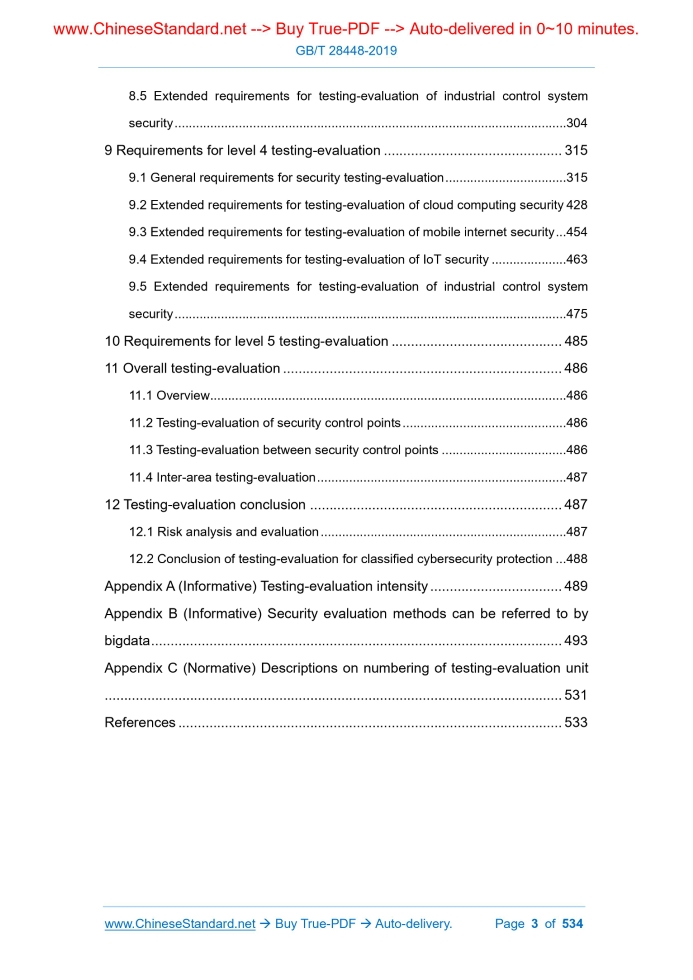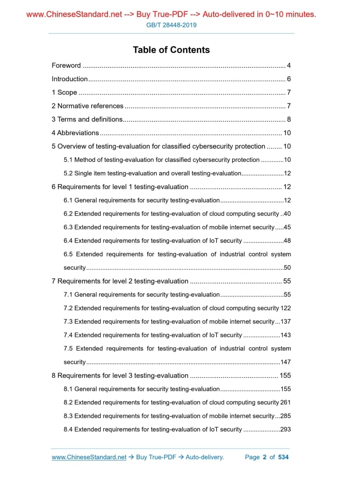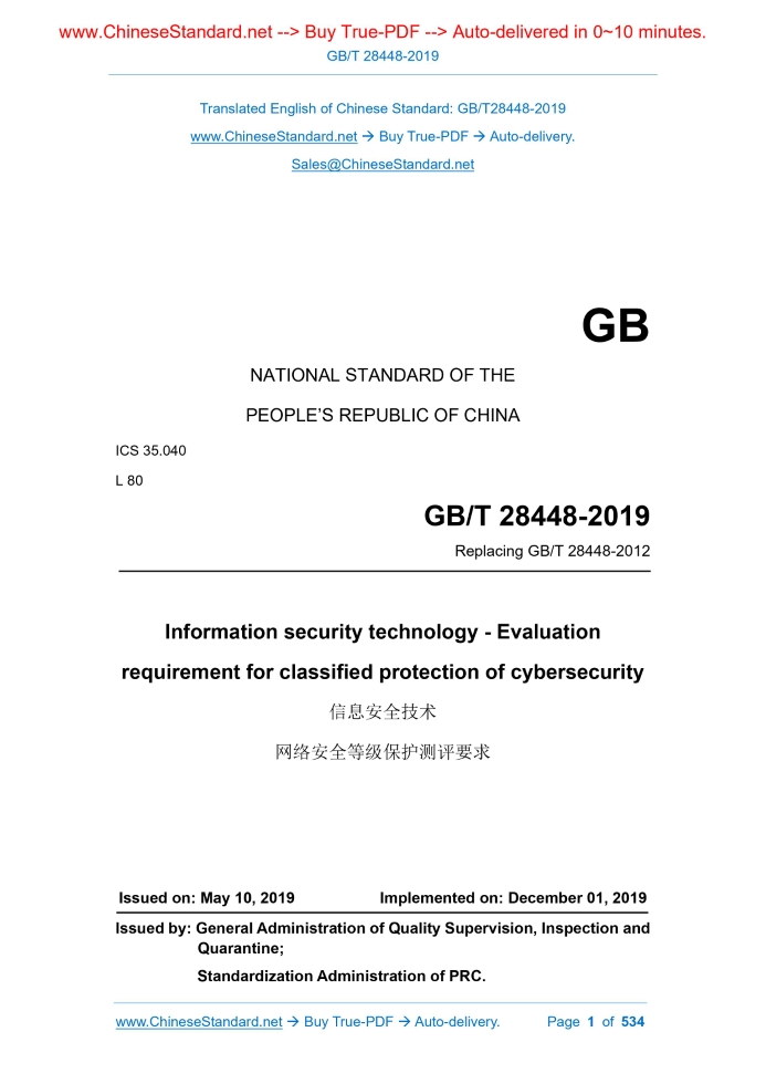 Similar standardsGB/T 28448-2019: Information security technology - Evaluation requirement for classified protection of cybersecurity---This is an excerpt. Full copy of true-PDF in English version (including equations, symbols, images, flow-chart, tables, and figures etc.), auto-downloaded/delivered in 9 seconds, can be purchased online: https://www.ChineseStandard.net/PDF.aspx/GBT28448-2019 NATIONAL STANDARD OF THE PEOPLE’S REPUBLIC OF CHINA ICS 35.040 L 80 Replacing GB/T 28448-2012 Information security technology - Evaluation requirement for classified protection of cybersecurity Issued on. MAY 10, 2019 Implemented on. DECEMBER 01, 2019 Issued by. General Administration of Quality Supervision, Inspection and Quarantine; Standardization Administration of PRC. Table of ContentsForeword... 4 Introduction... 6 1 Scope... 7 2 Normative references... 7 3 Terms and definitions... 8 4 Abbreviations... 10 5 Overview of testing-evaluation for classified cybersecurity protection... 10 5.1 Method of testing-evaluation for classified cybersecurity protection... 10 5.2 Single item testing-evaluation and overall testing-evaluation... 12 6 Requirements for level 1 testing-evaluation... 12 6.1 General requirements for security testing-evaluation... 12 6.2 Extended requirements for testing-evaluation of cloud computing security.. 40 6.3 Extended requirements for testing-evaluation of mobile internet security... 45 6.4 Extended requirements for testing-evaluation of IoT security... 48 6.5 Extended requirements for testing-evaluation of industrial control system security... 50 7 Requirements for level 2 testing-evaluation... 55 7.1 General requirements for security testing-evaluation... 55 7.2 Extended requirements for testing-evaluation of cloud computing security 122 7.3 Extended requirements for testing-evaluation of mobile internet security... 137 7.4 Extended requirements for testing-evaluation of IoT security... 143 7.5 Extended requirements for testing-evaluation of industrial control system security... 147 8 Requirements for level 3 testing-evaluation... 155 8.1 General requirements for security testing-evaluation... 155 8.2 Extended requirements for testing-evaluation of cloud computing security 261 8.3 Extended requirements for testing-evaluation of mobile internet security... 285 8.4 Extended requirements for testing-evaluation of IoT security... 293 Information security technology - Evaluation requirement for classified protection of cybersecurity1 ScopeThis standard stipulates the general requirements and extended requirements for testing-evaluation of security of classified protection targets. This standard is applicable to security evaluation service agencies, operation and use units of classified protection targets, for competent departments to conduct security evaluation and provide guidance on the security status of classified protection targets; it is also applicable to network security functional departments when conducting supervision and inspection of the classified protection of cybersecurity. Note. The level-5 classified protection target is an important supervision and management target, which has a special management mode and security evaluation requirements, so it is not described in this standard.2 Normative referencesThe following documents are essential to the application of this document. For the dated documents, only the versions with the dates indicated are applicable to this document; for the undated documents, only the latest version (including all the amendments) are applicable to this standard. GB 17859-1999 Classified criteria for security protection of computer information system GB/T 22239-2019 Information security technology - Baseline for classified protection of cybersecurity GB/T 25069 Information security technology - Glossary GB/T 25070-2019 Information security technology - Technical requirements of security design for classified protection of cybersecurity GB/T 28449-2018 Information security technology - Testing-evaluation process guide for classified protection of cybersecurity GB/T 31167-2014 Information security technology - Security guide of cloud computing services GB/T 31168-2014 Information security technology - Security capability requirements of cloud computing services GB/T 32919-2016 Information security - Industrial control systems - Guidelines for the application of security controls3 Terms and definitionsThe terms and definitions as defined in GB 17859-1999, GB/T 25069, GB/T 22239-2019, GB/T 25070-2019, GB/T 31167-2014, GB/T 31168-2014, GB/T 32919-2016 as well as the following terms and definitions apply to this document. For ease of use, the following repeatedly lists some terms and definitions in GB/T 31167-2014 and GB/T 31168-2014. 3.1 Interview The process that the evaluator helps the evaluator understand, clarify, or obtain evidence by guiding the relevant personnel of the classified protection target through purposeful (targeted) communication. 3.2 Examine The process that the evaluator observes, inspects, analyzes the evaluation target of testing-evaluation (such as system documents, various types of device and related security configurations, etc.) to help the evaluator understand, clarify or obtain evidence. 3.3 Test The process that the evaluator uses a predetermined method / tool to make the target of testing-evaluation (various types of device or security configuration) produce a specific result, meanwhile compare the running result with the expected result.4 AbbreviationsThe following abbreviations apply to this document. AP. Wireless Access Point APT. Advanced Persistent Threat DDoS. Distributed Denial of Service SSID. Service Set Identifier WEP. Wired Equivalent Privacy WiFi. Wireless Fidelity WPS. WiFi Protected Setup5 Overview of testing-evaluation for classifiedcybersecurity protection 5.1 Method of testing-evaluation for classified cybersecurity protection The basic method of implementation of testing-evaluation for classi