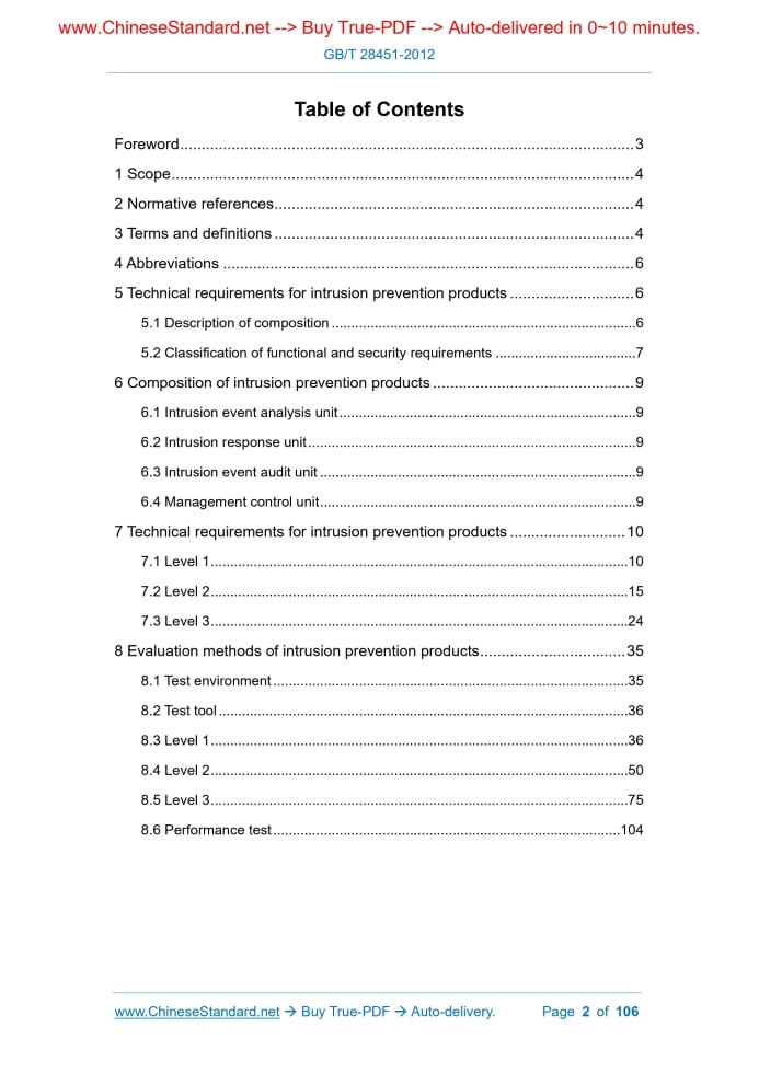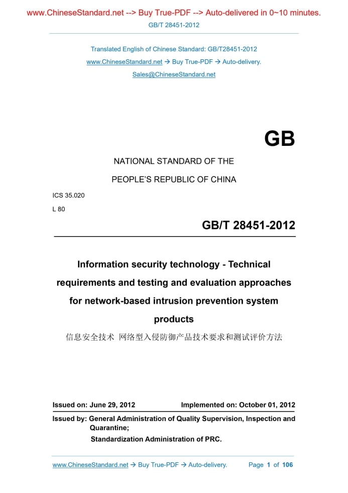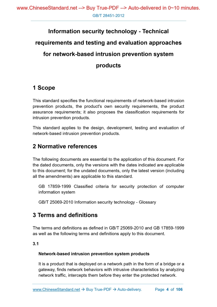 Similar standardsGB/T 28451-2012: Information security technology -- Technical requirements and testing and evaluation approaches for network-based intrusion prevention system products---This is an excerpt. Full copy of true-PDF in English version (including equations, symbols, images, flow-chart, tables, and figures etc.), auto-downloaded/delivered in 9 seconds, can be purchased online: https://www.ChineseStandard.net/PDF.aspx/GBT28451-2012 GB NATIONAL STANDARD OF THE PEOPLE’S REPUBLIC OF CHINA ICS 35.020 L 80 Information security technology - Technical requirements and testing and evaluation approaches for network-based intrusion prevention system products Issued on: JUNE 29, 2012 Implemented on: OCTOBER 01, 2012 Issued by. General Administration of Quality Supervision, Inspection and Quarantine; Standardization Administration of PRC. Table of ContentsForeword... 3 1 Scope... 4 2 Normative references... 4 3 Terms and definitions... 4 4 Abbreviations... 6 5 Technical requirements for intrusion prevention products... 6 5.1 Description of composition... 6 5.2 Classification of functional and security requirements... 7 6 Composition of intrusion prevention products... 9 6.1 Intrusion event analysis unit... 9 6.2 Intrusion response unit... 9 6.3 Intrusion event audit unit... 9 6.4 Management control unit... 9 7 Technical requirements for intrusion prevention products... 10 7.1 Level 1... 10 7.2 Level 2... 15 7.3 Level 3... 24 8 Evaluation methods of intrusion prevention products... 35 8.1 Test environment... 35 8.2 Test tool... 36 8.3 Level 1... 36 8.4 Level 2... 50 8.5 Level 3... 75 8.6 Performance test... 104 Information security technology - Technical requirements and testing and evaluation approaches for network-based intrusion prevention system products1 ScopeThis standard specifies the functional requirements of network-based intrusion prevention products, the product's own security requirements, the product assurance requirements; it also proposes the classification requirements for intrusion prevention products. This standard applies to the design, development, testing and evaluation of network-based intrusion prevention products.2 Normative referencesThe following documents are essential to the application of this document. For the dated documents, only the versions with the dates indicated are applicable to this document; for the undated documents, only the latest version (including all the amendments) are applicable to this standard. GB 17859-1999 Classified criteria for security protection of computer information system GB/T 25069-2010 Information security technology - Glossary3 Terms and definitionsThe terms and definitions as defined in GB/T 25069-2010 and GB 17859-1999 as well as the following terms and definitions apply to this document. 3.1 Network-based intrusion prevention system products It is a product that is deployed on a network path in the form of a bridge or a gateway, finds network behaviors with intrusive characteristics by analyzing network traffic, intercepts them before they enter the protected network. This level specifies the minimum-security requirements for intrusion prevention products. The product has basic protocol analysis, intrusion detection and interception capabilities; generates records of intrusion events; restricts the control of product function configuration and data access through simple user identification and authentication, so that users have the ability to independently protect and prevent illegal users from harming the intrusion prevention products and protect the normal operation of intrusion prevention products. 5.1.2 Level 2 This level requires the division of security management roles, to refine the management of intrusion prevention products. The audit function is added, to make the actions of authorized administrators traceable. While the product realizes intrusion detection and interception, it also requires the function of timely warning. For event records, it also requires the ability to generate and output reports, as well as a hardware failure handling mechanism. 5.1.3 Level 3 This level requires intrusion prevention products to provide a general interface to the outside world; report results have functions such as template customization. It also requires functions such as multiple authentication mechanisms, upgrade security, self-hiding, load balancing; puts forward higher requirements for the product's own security. Provide strong protection for the normal operation of the product. 5.1.4 Performance This item specifies the performance requirements of intrusion prevention products, covering all levels. 5.2 Classification of functional and security requirements The security classification of intrusion prevention products is as shown in Table 1 and Table 2.The grade evaluation of intrusion prevention products is based on Table 1 and Table 2, combined with the comprehensive evaluation of product assurance requirements. The intrusion prevention products that meet the level 1 requirements shall meet all the items that the level 1 products shall comply with as indicated in Table 1 and Table 2, as well as the relevant assurance requirements for the level 1 product. The intrusion prevention products that meet the level 2 requirements shall meet all the items that the level 2 products shall comply with as indicated in Table 1 and Table 2, as well as the relevant assurance requirements for the level 2 product. The intrusion prevention products that meet the level 3 requirements shall meet all the items that the level 3 products shall comply with as indicated in Table 1 and Table 2, as well 7.1.3.3.1 Function design Developers shall provide documents explaining the security function design of intrusion prevention products. Function design shall describe the security function and its external interface in an informal way; describe the purpose and method of using the external security function interface; provide details of exceptions an