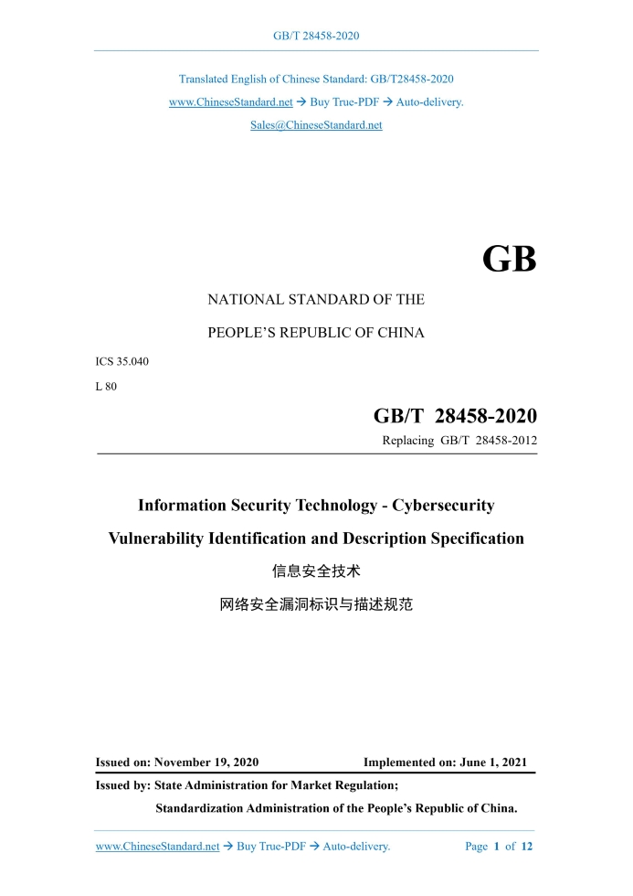 NATIONAL STANDARD OF THE PEOPLE’S REPUBLIC OF CHINA ICS 35.040 L 80 Replacing GB/T 28458-2012 Information Security Technology - Cybersecurity Vulnerability Identification and Description Specification ISSUED ON: NOVEMBER 19, 2020 IMPLEMENTED ON: JUNE 1, 2021 Issued by: State Administration for Market Regulation; Standardization Administration of the People’s Republic of China.