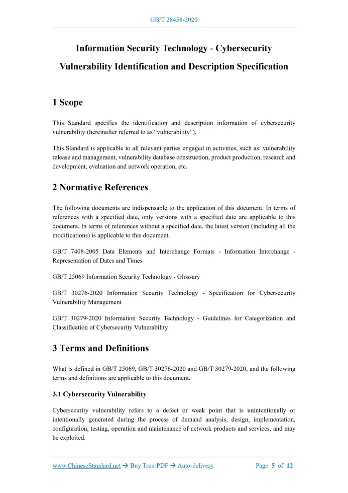 The following documents are indispensable to the application of this document. In terms of references with a specified date, only versions with a specified date are applicable to this document. In terms of references without a specified date, the latest version (including all the modifications) is applicable to this document. GB/T 7408-2005 Data Elements and Interchange Formats - Information Interchange - Representation of Dates and Times GB/T 25069 Information Security Technology - Glossary GB/T 30276-2020 Information Security Technology - Specification for Cybersecurity Vulnerability Management GB/T 30279-2020 Information Security Technology - Guidelines for Categorization and Classification of Cybersecurity Vulnerability