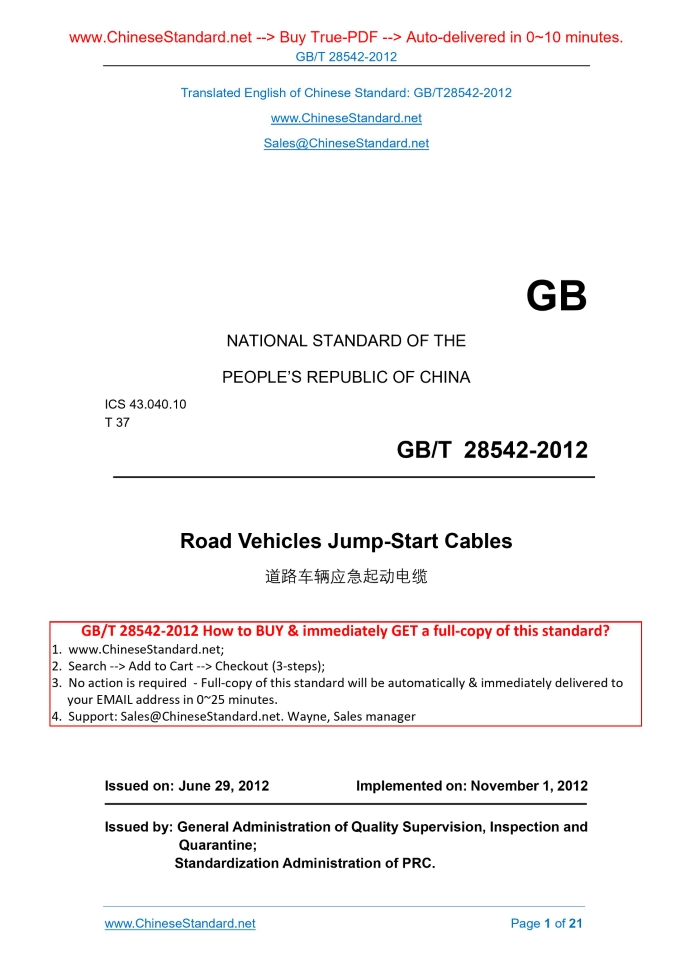 GB/T 28542-2012: Road Vehicles Jump-Start Cables Delivery: 9 seconds. True-PDF full-copy in English & invoice will be downloaded + auto-delivered via email. See step-by-step procedure Status: Valid