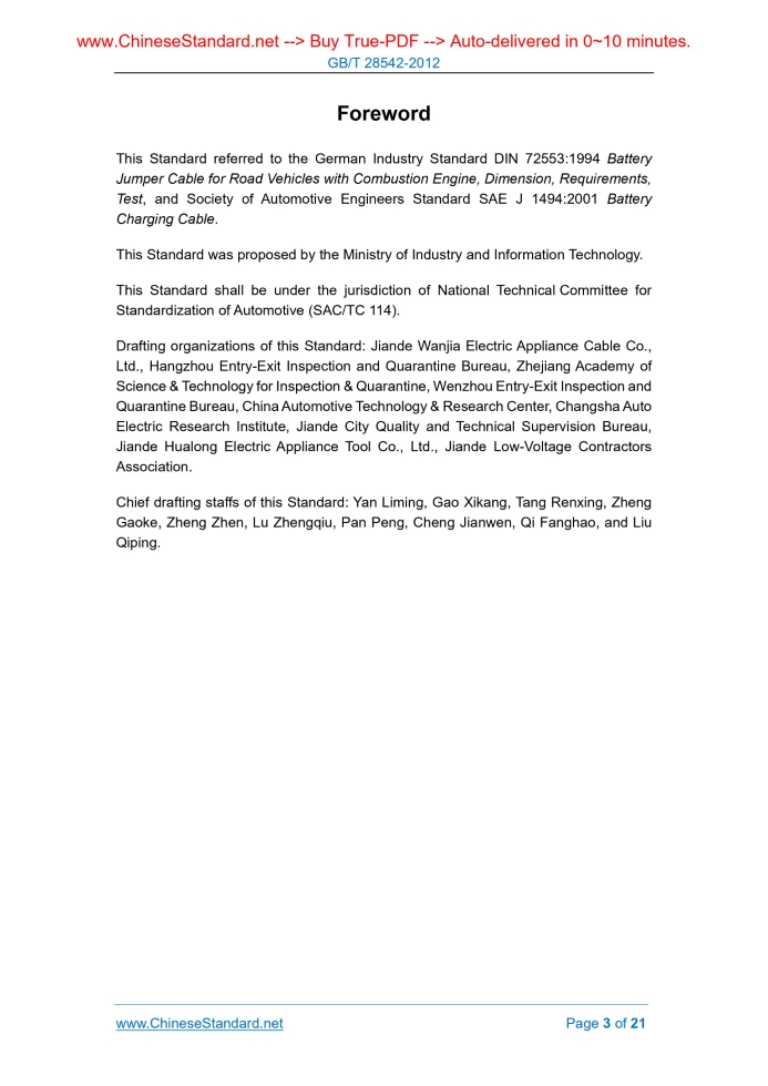 Similar standardsGB/T 28542-2012: Road Vehicles Jump-Start Cables---This is an excerpt. Full copy of true-PDF in English version (including equations, symbols, images, flow-chart, tables, and figures etc.), auto-downloaded/delivered in 9 seconds, can be purchased online: https://www.ChineseStandard.net/PDF.aspx/GBT28542-2012GB NATIONAL STANDARD OF THE PEOPLE’S REPUBLIC OF CHINA ICS 43.040.10 T 37 Road Vehicles Jump-Start Cables Issued on: JUNE 29, 2012 Implemented on: NOVEMBER 1, 2012 Issued by. General Administration of Quality Supervision, Inspection and Quarantine; Standardization Administration of PRC. Table of ContentsForeword ... 3 1 Scope ... 4 2 Normative References ... 4 3 Terms and Definitions ... 4 4 Requirements ... 5 5 Test Method ... 8 6 Inspection Rules ... 15 7 Package, Transportation and Storage ... 17 Appendix A (Normative) Warning Label and Usage Instructions ... 19ForewordThis Standard referred to the German Industry Standard DIN 72553.1994 Battery Jumper Cable for Road Vehicles with Combustion Engine, Dimension, Requirements, Test, and Society of Automotive Engineers Standard SAE J 1494.2001 Battery Charging Cable. This Standard was proposed by the Ministry of Industry and Information Technology. This Standard shall be under the jurisdiction of National Technical Committee for Standardization of Automotive (SAC/TC 114). Drafting organizations of this Standard. Jiande Wanjia Electric Appliance Cable Co., Ltd., Hangzhou Entry-Exit Inspection and Quarantine Bureau, Zhejiang Academy of Science & Technology for Inspection & Quarantine, Wenzhou Entry-Exit Inspection and Quarantine Bureau, China Automotive Technology & Research Center, Changsha Auto Electric Research Institute, Jiande City Quality and Technical Supervision Bureau, Jiande Hualong Electric Appliance Tool Co., Ltd., Jiande Low-Voltage Contractors Association. Chief drafting staffs of this Standard. Yan Liming, Gao Xikang, Tang Renxing, Zheng Gaoke, Zheng Zhen, Lu Zhengqiu, Pan Peng, Cheng Jianwen, Qi Fanghao, and Liu Qiping. Road Vehicles Jump-Start Cables1 ScopeThis Standard specifies the terms and definitions, requirements, test methods, inspection rules of road vehicles jump-start cables (hereinafter referred to as start cable). This Standard is applicable to the start cable with nominal voltage 12V or 24V, the start current no greater than 750A.2 Normative ReferencesThe following documents are essential to the application of this document. For the dated documents, only the versions with the dates indicated are applicable to this document; for the undated documents, only the latest version (including all the amendments) are applicable to this document. GB/T 191 Packaging – Pictorial Marking for Handling of Goods GB/T 1220-2007 Stainless Steel Bars GB/T 3953 Round Copper Wire for Electrical Purposes GB/T 4909.2-2009 Test Methods for Bare Wires – Part 2. Measurement of Dimensions GB/T 25085-2010 Road Vehicles – 60V and 600V Single-Core Cables SJ/T 11223 Copper-Clad Aluminum Wire3 Terms and DefinitionsThe following terms and definitions are applicable to this document. 3.1 Rated current The ability of start cable to transmit current under certain conditions. 3.2 Voltage drop 10mm 20mm 30mm 80 30±6 50±10 70±10 100, 150, 200, 220 35±7 55±11 75±15 350 40±8 60±12 80±16 480, 750 50±10 75±15 95±19 4.4.2 The insulation parts of battery clip shall, at low temperature -25°C (common temperature type) or -40°C (extra-low temperature type) state, be free from surface and structural breakage when falling off from 1.5m high place. 4.4.3 The metal parts of battery clip shall withstand the spray erosion at normal use or storage environment, and the surfaces of them shall be free from rust. 4.5 The bonding strength between cable and battery clip The bonding place between cable and battery clip shall be free from stripping or damage when being exerted the following tension. a) For the start cable with rated current no greater than 150A, exert 245N±5N tension; b) For the start cable with rated current greater than 150A, exert 445N±20N tension. 4.6 Warning label 4.6.1 The warning label shall contain the warning language specified in A.1 of Appendix A. 4.6.2 The picture and text of warning label shall be legible and durable. 4.6.3 After withstanding 22N tension, the warning label shall not be damaged; and its picture and text shall be legible. 4.7 Voltage-drop and temperature-rise of start cable At 23°C±5°C ambient temperature, the start cable is passed by rated current for 15s, the voltage-drop generated on the start cable shall conform to the provisions of Table 1; during and after the power-on, the temperature-rise on the back of battery clip handle and folder shall not exceed 45K, it shall not damage the mechanical structure and electrical structure of start cable components.5 Test Method5.1 Test conditions and specimen requirements Unless otherwise is specified, all tests shall be performed at the ambient temperature of 23°C±5°C. Unless otherwise is specified, all specimens shall be taken from the new or non-tested damaged cables. Unless otherwise is specified, before test, the specimen shall be placed at the ambient temperature of 23°C±5°C, and stand for no less than 1h. 5.2 Start cable polarity test Check the start cable polarity by visual observation or other suitable methods. 5.3 Cable test 5.3.1 The conductor cross-sectional area test can refer to the provisions of 5.4 in GB/T 4909.2-2009. 5.3.2 The cable outer diameter and cable insulation layer thickness test can refer to the provisions of 5.1.1-5.1.3 and 5.2.1-5.2.3 in GB/T 25085-2010. 5.3.3 The high-temperature pressure test of cable insulation layer can refer to the provisions of 7.1 in GB/T 25085-2010, thereof the oven temperature shall be set at 70°C±2°C. 5.3.4 The low-temperature winding test of cable insulation layer can refer to the provisions of 8.1 in GB/T 25085-2010, thereof freezer temperature shall be set at - 25°C±2°