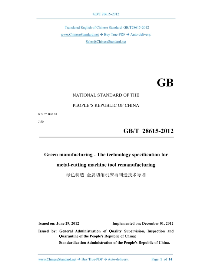 GB/T 28615-2012: Green manufacturing - The technology specification for metal-cutting machine tool remanufacturing Delivery: 9 seconds. True-PDF full-copy in English & invoice will be downloaded + auto-delivered via email. See step-by-step procedure Status: Valid