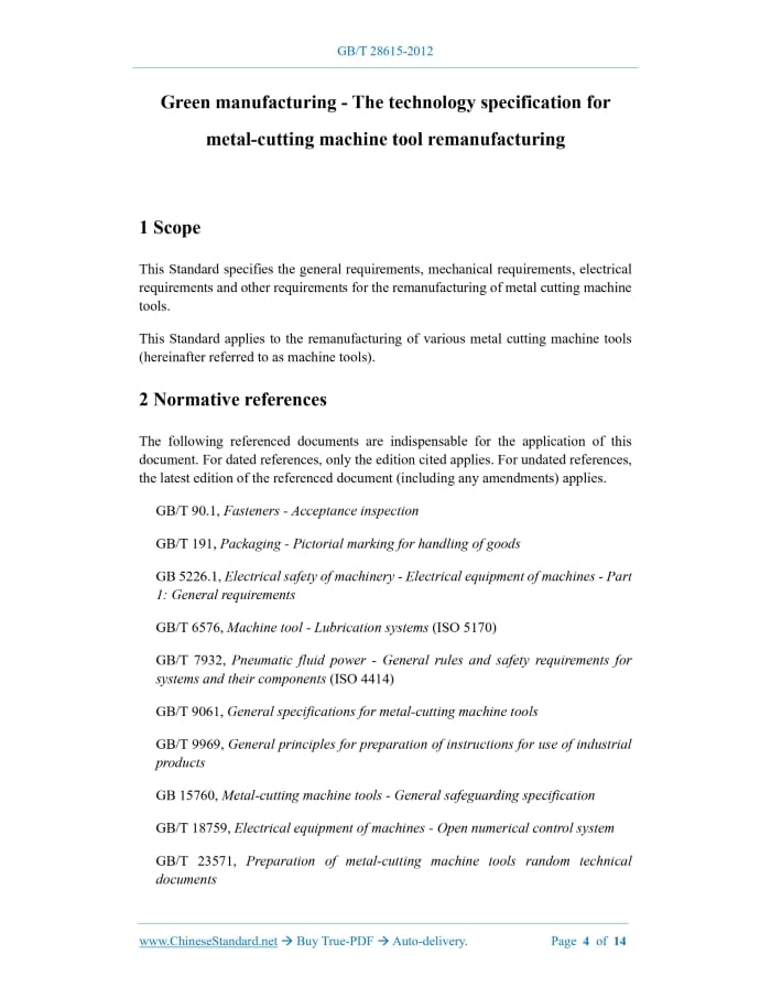 Similar standardsGB/T 28615-2012: Green manufacturing - The technology specification for metal-cutting machine tool remanufacturing---This is an excerpt. Full copy of true-PDF in English version (including equations, symbols, images, flow-chart, tables, and figures etc.), auto-downloaded/delivered in 9 seconds, can be purchased online: https://www.ChineseStandard.net/PDF.aspx/GBT28615-2012 GB NATIONAL STANDARD OF THE PEOPLE’S REPUBLIC OF CHINA ICS 25.080.01 J 50 Green manufacturing - The technology specification for metal-cutting machine tool remanufacturing ISSUED ON: JUNE 29, 2012 IMPLEMENTED ON: DECEMBER 01, 2012 Issued by: General Administration of Quality Supervision, Inspection and Quarantine of the People's Republic of China; Standardization Administration of the People's Republic of China. Table of ContentsForeword ... 3 1 Scope ... 4 2 Normative references ... 4 3 Terms and definitions ... 5 4 General requirements ... 6 5 Requirements for mechanical parts ... 8 6 Requirements for electrical parts ... 11 7 Other requirements ... 12 Bibliography ... 14 Green manufacturing - The technology specification for metal-cutting machine tool remanufacturing1 ScopeThis Standard specifies the general requirements, mechanical requirements, electrical requirements and other requirements for the remanufacturing of metal cutting machine tools. This Standard applies to the remanufacturing of various metal cutting machine tools (hereinafter referred to as machine tools).2 Normative referencesThe following referenced documents are indispensable for the application of this document. For dated references, only the edition cited applies. For undated references, the latest edition of the referenced document (including any amendments) applies. GB/T 90.1, Fasteners - Acceptance inspection GB/T 191, Packaging - Pictorial marking for handling of goods GB 5226.1, Electrical safety of machinery - Electrical equipment of machines - Part 1: General requirements GB/T 6576, Machine tool - Lubrication systems (ISO 5170) GB/T 7932, Pneumatic fluid power - General rules and safety requirements for systems and their components (ISO 4414) GB/T 9061, General specifications for metal-cutting machine tools GB/T 9969, General principles for preparation of instructions for use of industrial products GB 15760, Metal-cutting machine tools - General safeguarding specification GB/T 18759, Electrical equipment of machines - Open numerical control system GB/T 23571, Preparation of metal-cutting machine tools random technical documents GB/T 23572, Hydraulic system general specifications for metal-cutting machine tools GB/T 28612, Green manufacturing of mechanical products - Terminology JB/T 3207, Machine tool accessory - General specification for products packaging JB/T 8356.1, Machine tools - Specification for packing JB/T 8356.2, Machine tools - Packing box JB/T 8832, General requirements for numerical control systems of machine tools JB/T 9874, Metal-cutting machine tools - General specifications for assembling3 Terms and definitionsFor the purposes of this document, the terms and definitions defined in GB/T 28612 as well as the followings apply. 3.1 machine tool remanufacturing Machine tool manufacturing mode that is based on recycling of waste machine tool resources. Use modern and advanced manufacturing, information, numerical control and automation technologies to conduct remanufacturability evaluation, disassembly and innovative redesign, reprocessing and reassembly of waste machine tools, to manufacture new machine tools whose functions and performance have been restored or improved and which meet the requirements of green manufacturing. NOTE: Green manufacturing requirements refer to product resource consumption, ecological environment, occupational health and safety requirements. 3.2 remanufactured machine tool The machine tool that is based on waste machine tools and parts, the function and performance of remanufacturing can reach or exceed the level of original new products. 3.3 machine tool disassembly The process of decomposing the original waste machine tool assembly into individual parts and components by decomposing the connecting parts and assembly relationship by using certain tools and means. 3.4 redesign The process that redesigns remanufactured products and their parts by means of function enhancement and technical condition optimization, based on waste products and recycled class. 4.5 Cleaning, testing The disassembled parts and systems must be cleaned and tested to determine their failure, wear and aging conditions. Analyze the feasibility of its reuse or remanufacturing from the aspects of economy, technology, resources, environment. 4.6 Redesign of machine tools According to the requirements of the overall scheme of machine tool remanufacturing, design the structure and components of the remanufactured machine tool. The design documents should be formed. 4.7 Formulation of remanufacturing process plan for mechanical parts According to the test results of waste parts and the technical requirements for parts of remanufactured machine tools, determine the remanufacturing process equipment, process parameters of the parts, and formulate remanufacturing process regulations. 4.8 Formulation of remanufacturing technology plan for electrical control system The electrical control system plan should be formulated according to the overall plan of machine tool remanufacturing, including electrical schematic diagrams, electrical location diagrams, and selection of electrical components. After the plan is formulated, technical documents must be formed. 4.9 Assembly and commissioning Remanufactured machine tools should be assembled according to the drawings and reassembly process regulations. The parts (including remanufactured parts and replacement parts) assembled on the remanufactured machine tool should meet the quality requirements. The reassembly process and reassembly quality of remanufactured machine tools 