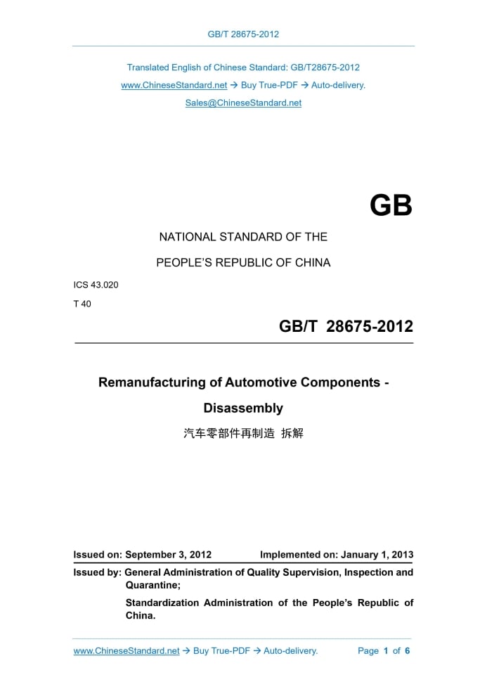 GB/T 28675-2012: Remanufacturing of automotive components -- Disassembly Delivery: 9 seconds. True-PDF full-copy in English & invoice will be downloaded + auto-delivered via email. See step-by-step procedure Status: Valid