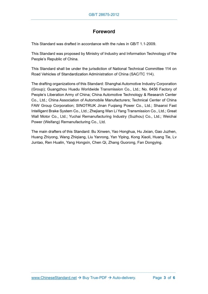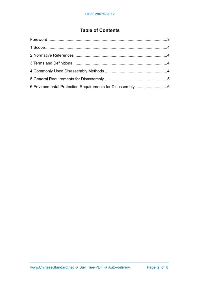 Similar standardsGB/T 28675-2012: Remanufacturing of automotive components -- Disassembly---This is an excerpt. Full copy of true-PDF in English version (including equations, symbols, images, flow-chart, tables, and figures etc.), auto-downloaded/delivered in 9 seconds, can be purchased online: https://www.ChineseStandard.net/PDF.aspx/GBT28675-2012GB NATIONAL STANDARD OF THE PEOPLE’S REPUBLIC OF CHINA ICS 43.020 T 40 Remanufacturing of Automotive Components - Disassembly ISSUED ON: SEPTEMBER 3, 2012 IMPLEMENTED ON: JANUARY 1, 2013 Issued by: General Administration of Quality Supervision, Inspection and Quarantine; Standardization Administration of the People’s Republic of China. Table of ContentsForeword ... 3 1 Scope ... 4 2 Normative References ... 4 3 Terms and Definitions ... 4 4 Commonly Used Disassembly Methods ... 4 5 General Requirements for Disassembly ... 5 6 Environmental Protection Requirements for Disassembly ... 6ForewordThis Standard was drafted in accordance with the rules in GB/T 1.1-2009. This Standard was proposed by Ministry of Industry and Information Technology of the People’s Republic of China. This Standard shall be under the jurisdiction of National Technical Committee 114 on Road Vehicles of Standardization Administration of China (SAC/TC 114). The drafting organizations of this Standard: Shanghai Automotive Industry Corporation (Group); Guangzhou Huadu Worldwide Transmission Co., Ltd.; No. 6456 Factory of People’s Liberation Army of China; China Automotive Technology & Research Center Co., Ltd.; China Association of Automobile Manufacturers; Technical Center of China FAW Group Corporation; SINOTRUK Jinan Fuqiang Power Co., Ltd.; Shaanxi Fast Intelligent Brake System Co., Ltd.; Zhejiang Wan Li Yang Transmission Co., Ltd.; Great Wall Motor Co., Ltd.; Yuchai Remanufacturing Industry (Suzhou) Co., Ltd.; Weichai Power (Weifang) Remanufacturing Co., Ltd. The main drafters of this Standard: Bu Xinwen, Yao Honghua, Hu Jixian, Gao Juzhen, Huang Zhiyong, Wang Zhiqiang, Liu Yanrong, Yan Yiping, Kong Xiaoli, Huang Tie, Lv Juntao, Ren Hualin, Yang Hongxin, Chen Qi, Zhang Guorong, Fan Dongying. Remanufacturing of Automotive Components - Disassembly1 ScopeThis Standard specifies the terms and definitions of remanufacturing of automotive components - disassembly, commonly used disassembly methods, general requirements and environmental protection requirements for disassembly, etc. This Standard is applicable to the disassembly of the remanufacturing of automotive components. The disassembly of the remanufacturing of other motor vehicle parts may take this as a reference.2 Normative ReferencesThe following documents are indispensable to the application of this document. In terms of references with a specified date, only versions with a specified date are applicable to this document. In terms of references without a specified date, the latest version (including all the modifications) is applicable to this document. GB/T 22128 Technical Specifications for End-of-life Vehicles Recycling and Dismantling Enterprise GB/T 26989 Automobile Recovery - Terminology3 Terms and DefinitionsThe terms and definitions defined in GB/T 22128 and GB/T 26989 are applicable to this Standard.4 Commonly Used Disassembly Methods4.1 General Tool Method For the disassembly of general parts, for example, fasteners with good lubrication and relatively light corrosion, general tools may be used. For special fasteners, wrenches may be used. 4.2 Hammering Method For parts that are corroded due to long-term stationary fit, such as: universal drive ......Source: Above contents are excerpted from the full-copy PDF -- translated/reviewed by: www.ChineseStandard.net / Wayne Zheng et al. Tips & Frequently Asked Questions:Question 1: How long will the true-PDF of English version of GB/T 28675-2012 be delivered?Answer: The full copy PDF of English version of GB/T 28675-2012 can be downloaded in 9 seconds, and it will also be emailed to you in 9 seconds (double mechanisms to ensure the delivery reliably), with PDF-invoice.Question 2: Can I share the purchased PDF of GB/T 28675-2012_English with my colleagues?Answer: Yes. The purchased PDF of GB/T 28675-2012_English will be deemed to be sold to your employer/organization who actually paid for it, including your colleagues and your employer's intranet.Question 3: Does the price include tax/VAT?Answer: Yes. Our tax invoice, downloaded/delivered in 9 seconds, includes all tax/VAT and complies with 100+ countries' tax regulations (tax exempted in 100+ countries) -- See Avoidance of Double Taxation Agreements (DTAs): List of DTAs signed between Singapore and 100+ countriesQuestion 4: Do you accept my currency other than USD?Answer: Yes. www.ChineseStandard.us -- GB/T 28675-2012 -- Click this link and select your country/currency to pay, the exact amount in your currency will be printed on the invoice. Full PDF will also be downloaded/emailed in 9 seconds.How to buy and download a true PDF of English version of GB/T 28675-2012?A step-by-step guide to download PDF of GB/T 28675-2012_EnglishStep 1: Visit website https://www.ChineseStandard.net (Pay in USD), or https://www.ChineseStandard.us (Pay in any currencies such as Euro, KRW, JPY, AUD).Step 2: Search keyword "GB/T 28675-2012". Step 3: Click "Add to Cart". If multiple PDFs are required, repeat steps 2 and 3 to add up to 12 PDFs to cart. Step 4: Select payment option (Via payment agents Stripe or PayPal). Step 5: Customize Tax Invoice -- Fill up your email etc. Step 6: Click "Checkout". Step 7: Make payment by credit card, PayPal, Google Pay etc. After the payment is completed and in 9 seconds, you will receive 2 emails attached with the purchased PDFs and PDF-invoice, respectively. Step 8: Optional -- Go to download PDF. Step 9: Optional -- Click Open/Download PDF to download PDFs and invoice. See screenshots for above steps: Steps 1~3 Steps 4~6 Step 7 Step 8 Step 9 |