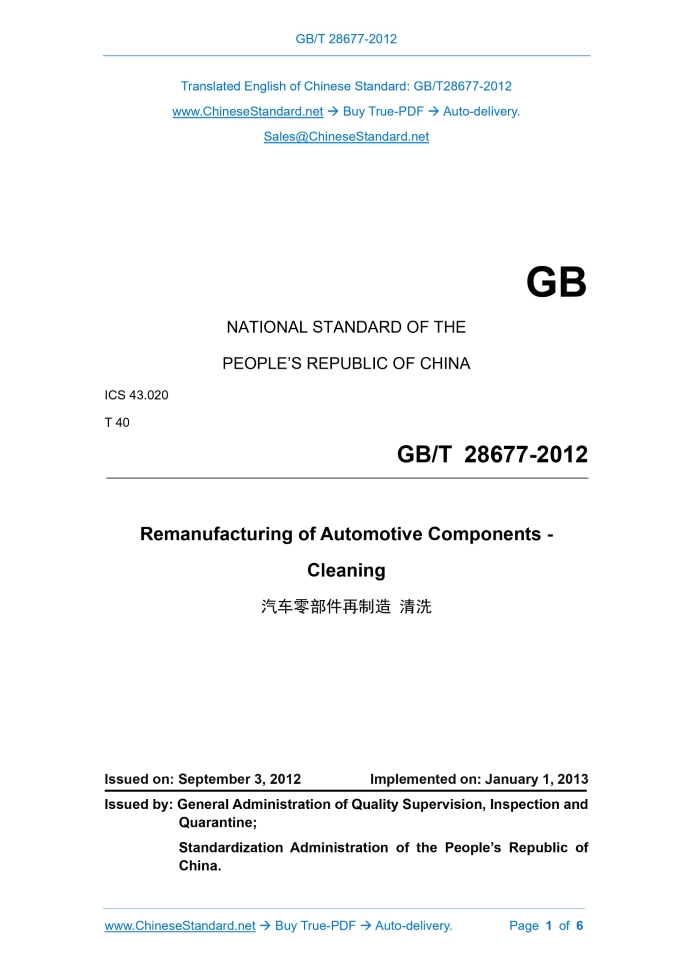 GB/T 28677-2012: Remanufacturing of automotive components -- Cleaning Delivery: 9 seconds. True-PDF full-copy in English & invoice will be downloaded + auto-delivered via email. See step-by-step procedure Status: Valid