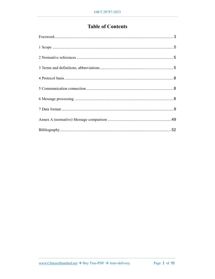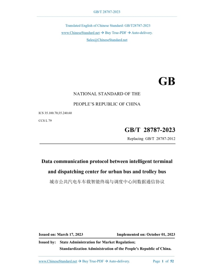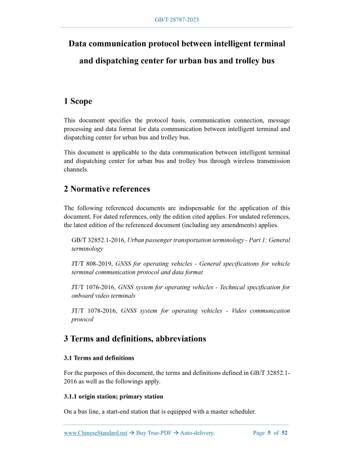 Similar standardsGB/T 28787-2023: Data communication protocol between intelligent terminal and dispatching center for urban bus and trolleybus---This is an excerpt. Full copy of true-PDF in English version (including equations, symbols, images, flow-chart, tables, and figures etc.), auto-downloaded/delivered in 9 seconds, can be purchased online: https://www.ChineseStandard.net/PDF.aspx/GBT28787-2023 GB NATIONAL STANDARD OF THE PEOPLE’S REPUBLIC OF CHINA ICS 35.100.70;35.240.60 CCS L 79 Replacing GB/T 28787-2012 Data communication protocol between intelligent terminal and dispatching center for urban bus and trolley bus ISSUED ON: MARCH 17, 2023 IMPLEMENTED ON: OCTOBER 01, 2023 Issued by: State Administration for Market Regulation; Standardization Administration of the People's Republic of China. Table of ContentsForeword ... 3 1 Scope ... 5 2 Normative references ... 5 3 Terms and definitions, abbreviations ... 5 4 Protocol basis ... 8 5 Communication connection... 8 6 Message processing ... 8 7 Data format ... 9 Annex A (normative) Message comparison ... 49 Bibliography ... 52 Data communication protocol between intelligent terminal and dispatching center for urban bus and trolley bus1 ScopeThis document specifies the protocol basis, communication connection, message processing and data format for data communication between intelligent terminal and dispatching center for urban bus and trolley bus. This document is applicable to the data communication between intelligent terminal and dispatching center for urban bus and trolley bus through wireless transmission channels.2 Normative referencesThe following referenced documents are indispensable for the application of this document. For dated references, only the edition cited applies. For undated references, the latest edition of the referenced document (including any amendments) applies. GB/T 32852.1-2016, Urban passenger transportation terminology - Part 1: General terminology JT/T 808-2019, GNSS for operating vehicles - General specifications for vehicle terminal communication protocol and data format JT/T 1076-2016, GNSS system for operating vehicles - Technical specification for onboard video terminals JT/T 1078-2016, GNSS system for operating vehicles - Video communication protocol3 Terms and definitions, abbreviations3.1 Terms and definitions For the purposes of this document, the terms and definitions defined in GB/T 32852.1- 2016 as well as the followings apply. 3.1.1 origin station; primary station On a bus line, a start-end station that is equipped with a master scheduler. The total mileage traveled by a delivery vehicle during the operation service process, including passenger mileage and empty mileage. [Source: GB/T 32852.1-2016, 8.6] 3.1.11 dispatching center A place for remote dispatching of operating vehicles on multiple lines. [Source: GB/T 32852.2-2018, 3.3.2] 3.1.12 transit signal priority According to the real-time monitored traffic conditions at intersections or historical traffic data, combined with the real-time passenger state of bus operating vehicles and the state of arriving earlier & later, priority signal timing is provided for bus operating vehicles, so that buses and trolley buses can pass in priority over other vehicles. 3.1.13 display plate for vehicle running position The vehicle is marked with the name of the route and the names of the stops. There is an indicator light showing the current running position of the vehicle and the running direction of the vehicle. [Source: GB/T 32852.2-2018, 3.5.24] 3.2 Abbreviations The following abbreviations apply to this document. CAN: Controller Area Network FTP: File Transfer Protocol GBK: Chinese Internal Code Specification HTTP: Hyper Text Transfer Protocol ID: Identity IP: Internet Protocol LCD: Liquid Crystal Display LED: Light Emitting Diode RSA: An asymmetric cryptographic algorithm (developed by Ron Rivest, Adi Shamir, Leonard Adleman, named after the names of the three) TCP: Transmission Control Protocol 6.2 The classification, requirements and encryption mechanism of signaling data messages in the protocol shall comply with the requirements of Chapter 7 of JT/T 808- 2019. 6.3 The real-time audio and video transmission channel agreement in the protocol shall meet the requirements of 4.2 in JT/T 1078-2016. 6.4 The audio and video signaling data message communication shall use the established link between the vehicle intelligent terminal and the dispatching center for the transmission of positioning information. No new link shall be created. A new link shall be created for the communication of audio and video code stream data message, instead of the link for transmitting the positioning information. 6.5 The message definition in the protocol shall meet the requirements of Annex A.7 Data format7.1 Basic data 7.1.1 General response from terminal The data format of the general response message body of the terminal shall comply with the provisions in 8.1 of JT/T 808-2019. 7.1.2 General response from dispatching center The data format of the general response message body of the dispatching center shall comply with the provisions in 8.2 of JT/T 808-2019. 7.1.3 Terminal heartbeat The data format of the terminal heartbeat message body shall comply with the provisions in 8.3 of JT/T 808-2019. 7.1.4 Query server time request The data format of the query server time request message body shall comply with the provisions in 8.4 of JT/T 808-2019. 7.1.5 Query server time response The data format of the query server time response message body shall comply with the provisions in 8.5 of JT/T 808-2019. 7.1.6 Server retransmission subpackage request The data format of the message body of the server's retransmission subpackage request shall comply with the provisions of 8.6 of JT/T 808-2019. 7.1.7 Terminal retransmission subpackage request The data format of the message body of the terminal retransmission subpackage request shall comply with the provisions in 8.7 of JT/T 808-201