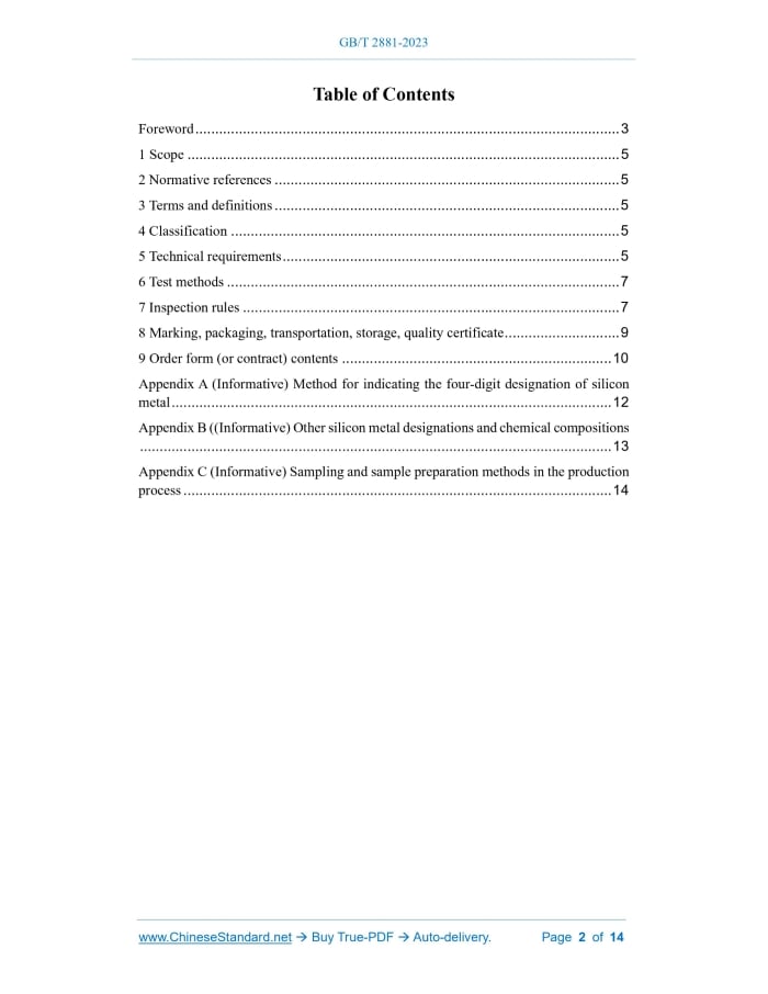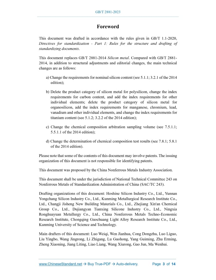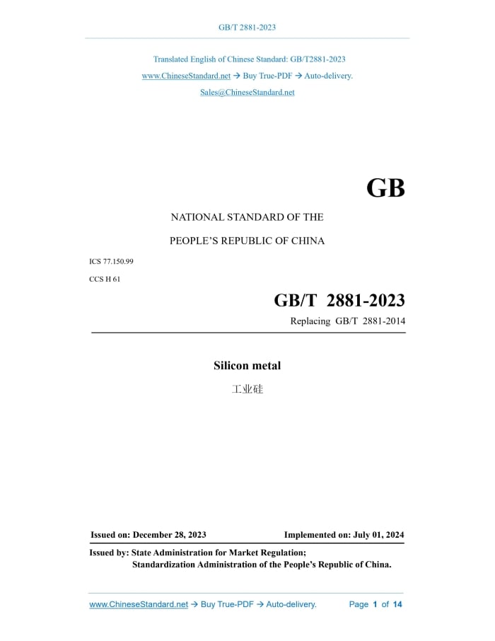 Similar standardsGB/T 2881-2023: Silicon metal---This is an excerpt. Full copy of true-PDF in English version (including equations, symbols, images, flow-chart, tables, and figures etc.), auto-downloaded/delivered in 9 seconds, can be purchased online: https://www.ChineseStandard.net/PDF.aspx/GBT2881-2023GB NATIONAL STANDARD OF THE PEOPLE’S REPUBLIC OF CHINA ICS 77.150.99 CCS H 61 Replacing GB/T 2881-2014 Silicon metal 工业硅 Issued on: DECEMBER 28, 2023 Implemented on: JULY 01, 2024 Issued by. State Administration for Market Regulation; Standardization Administration of the People’s Republic of China. Table of ContentsForeword... 3 1 Scope... 5 2 Normative references... 5 3 Terms and definitions... 5 4 Classification... 5 5 Technical requirements... 5 6 Test methods... 7 7 Inspection rules... 7 8 Marking, packaging, transportation, storage, quality certificate... 9 9 Order form (or contract) contents... 10 Appendix A (Informative) Method for indicating the four-digit designation of silicon metal... 12 Appendix B ((Informative) Other silicon metal designations and chemical compositions ... 13 Appendix C (Informative) Sampling and sample preparation methods in the production process... 14ForewordThis document was drafted in accordance with the rules given in GB/T 1.1-2020, Directives for standardization - Part 1.Rules for the structure and drafting of standardizing documents. This document replaces GB/T 2881-2014 Silicon metal. Compared with GB/T 2881- 2014, in addition to structural adjustments and editorial changes, the main technical changes are as follows. a) Change the requirements for nominal silicon content (see 5.1.1; 3.2.1 of the 2014 edition); b) Delete the product category of silicon metal for polysilicon, change the index requirements for carbon content, and add the index requirements for other individual elements; delete the product category of silicon metal for organosilicon, add the index requirements for manganese, chromium, lead, vanadium and other individual elements, and change the index requirements for titanium content (see 5.1.2; 3.2.2 of the 2014 edition); c) Change the chemical composition arbitration sampling volume (see 7.5.1.1; 5.5.1.1 of the 2014 edition); d) Change the determination of chemical composition test results (see 7.8.1; 5.8.1 of the 2014 edition). Please note that some of the contents of this document may involve patents. The issuing organization of this document is not responsible for identifying patents. This document was proposed by the China Nonferrous Metals Industry Association. This document shall be under the jurisdiction of National Technical Committee 243 on Nonferrous Metals of Standardization Administration of China (SAC/TC 243). Drafting organizations of this document. Hoshine Silicon Industry Co., Ltd., Yunnan Yongchang Silicon Industry Co., Ltd., Kunming Metallurgical Research Institute Co., Ltd., Changji Jisheng New Building Materials Co., Ltd., Zhejiang Xin'an Chemical Group Co., Ltd., Dujiangyan Tianxing Silicone Industry Co., Ltd., Ningxia Ronghuayuan Metallurgy Co., Ltd., China Nonferrous Metals Techno-Economic Research Institute, Chongqing Guochuang Light Alloy Research Institute Co., Ltd., Kunming University of Science and Technology. Main drafters of this document. Luo Weiqi, Wen Jianhua, Cong Dongzhu, Luo Liguo, Liu Yingbo, Wang Jingrong, Li Zhigang, Lu Guohong, Yang Guiming, Zhu Erming, Zheng Xiaoning, Jiang Liting, Liao Liang, Wang Xiurong, Gao Jun, Ma Wenhui. Silicon metal1 ScopeThis document specifies the classification, technical requirements, test methods, inspection rules, marking, packaging, transportation, storage, quality certificate and order (or contract) contents of silicon metal. This document applies to silicon metal produced by smelting carbonaceous reducing agents and silica in a submerged arc furnace, which is mainly used for preparing alloys, producing polysilicon and producing organic silicon.2 Normative referencesThe following documents are referred to in the text in such a way that some or all of their content constitutes requirements of this document. For dated references, only the version corresponding to that date is applicable to this document; for undated references, the latest version (including all amendments) is applicable to this document. GB/T 8170, Rules of rounding off for numerical values & expression and judgment of limiting values GB/T 14849 (all parts), Methods for chemical analysis of silicon metal3 Terms and definitionsNo terms and definitions need to be defined in this document.4 ClassificationSilicon metal is classified according to its chemical composition. The designation is expressed in the form of a combination of the silicon element symbol and a 4-digit number (or letter). The expression method is shown in Appendix A.5 Technical requirements5.1 Chemical composition 5.1.1 Main impurity elements 7.1.2 The demander shall inspect the received products in accordance with the provisions of this document. If the inspection results are inconsistent with the provisions of this document and the purchase order (or contract), the demander shall submit a written report to the supplier for negotiation. Any objection to particle size, appearance, or chemical composition shall be raised within 30 days from the date of receipt of the product. If arbitration is required, the supply and demand parties shall jointly conduct arbitration sampling. 7.2 Batching Silicon metal shall be submitted for inspection in batches. Each batch shall consist of products of the same designation and the batch weight shall not exceed 60 t. 7.3 Weight Silicon metal shall be weighed on the scales. 7.4 Inspection items Each batch of products shall be inspected for main impurity element content, particle size and appearance quality. When required by the order (or contract), special items such as trace element content shall also be inspected. 7.5 Chemical composition sampling and sample preparation 7.5.1 Arbitration 
